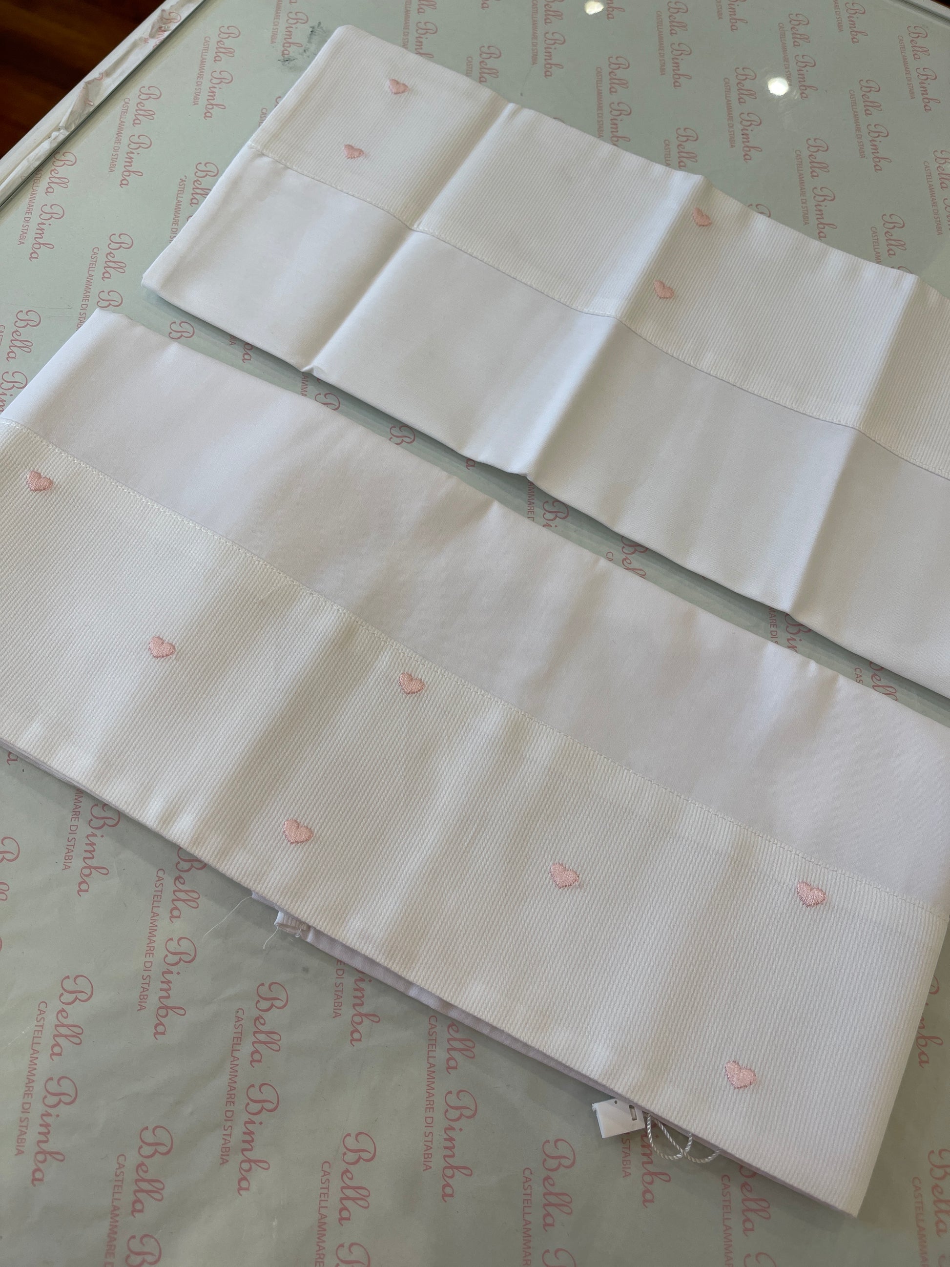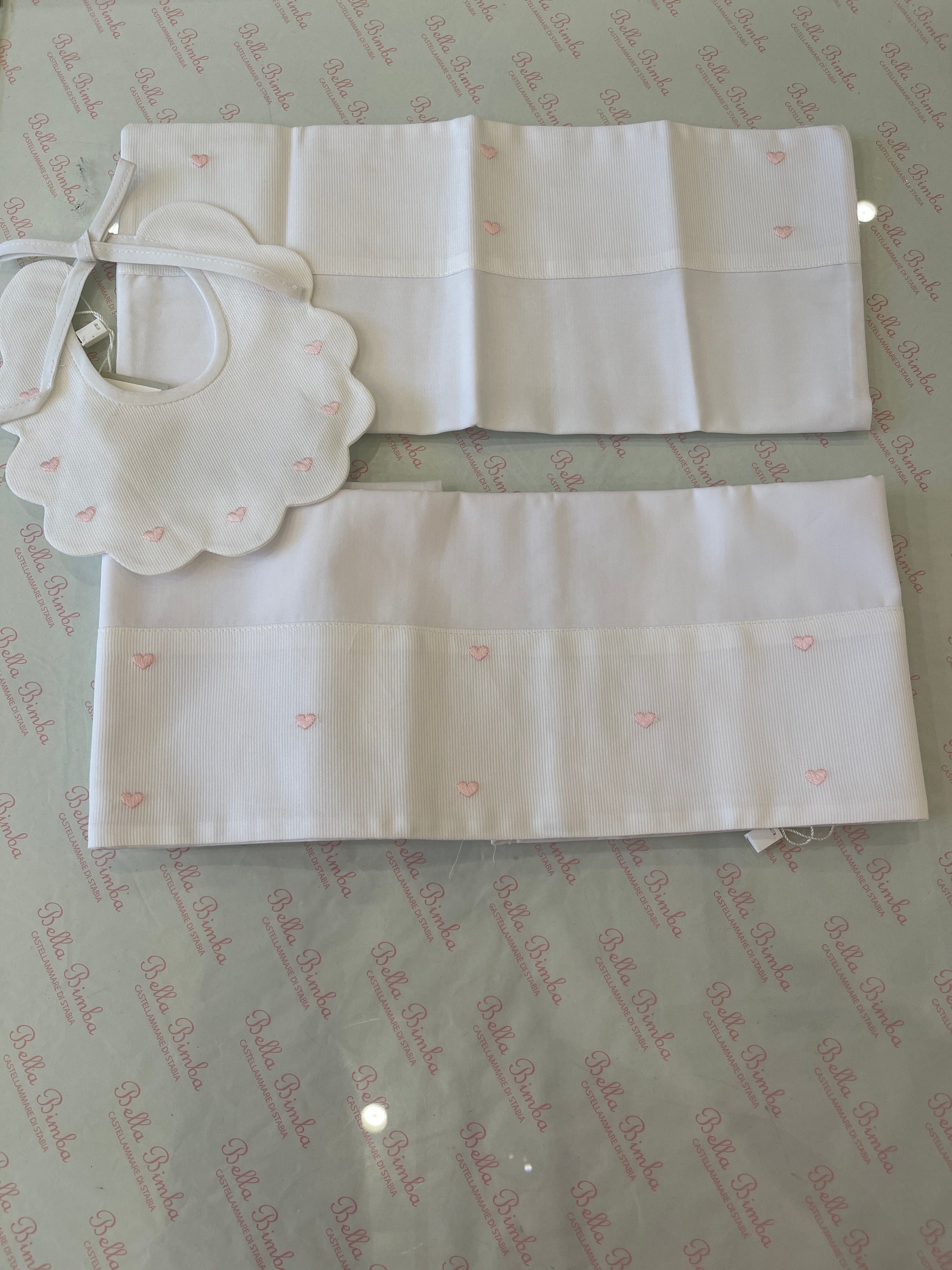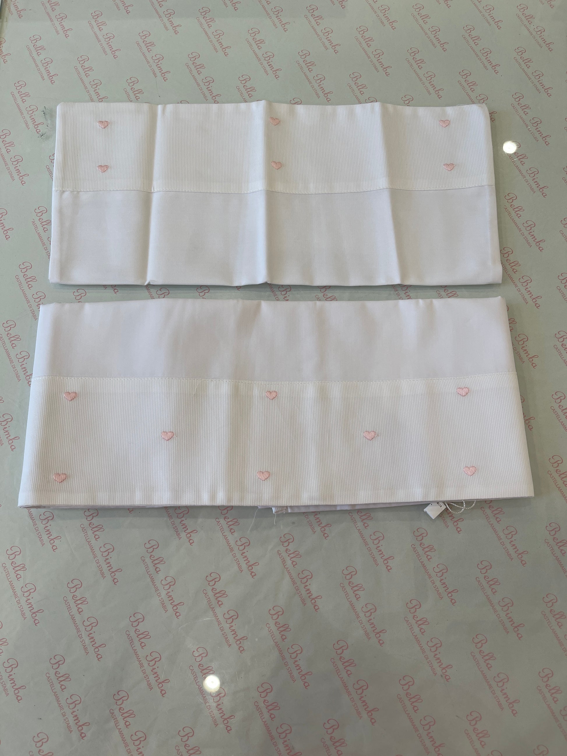 Set di lenzuola bianche caratterizzate da delicati cuoricini ricamati in rosa, presenti anche sulla federa del cuscino per un coordinato elegante e raffinato.