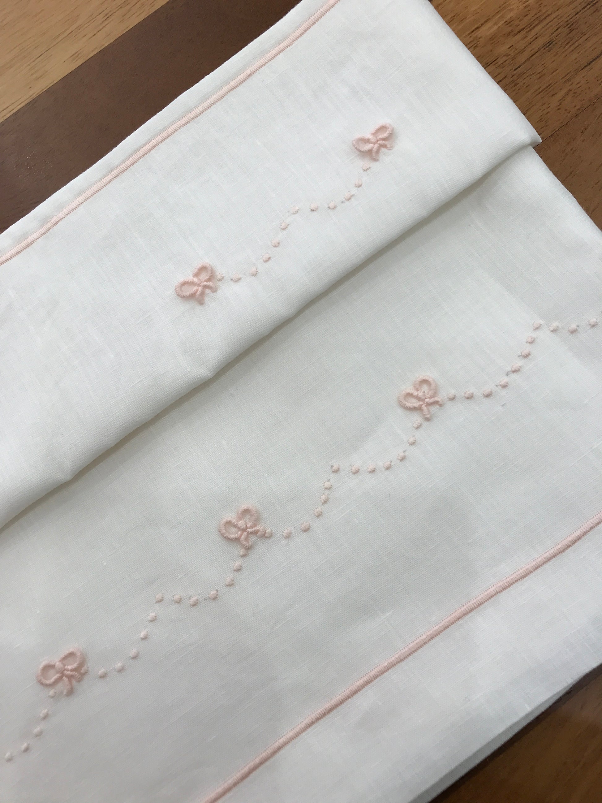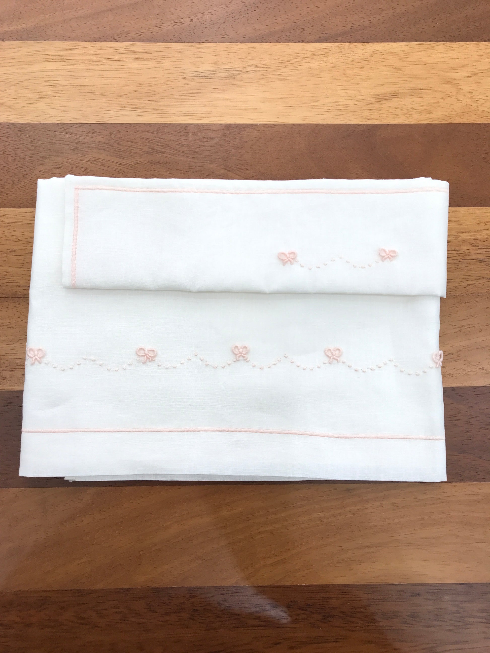 Delicato lenzuolino in puro lino bianco, arricchito da minuti fiocchetti ricamati in tonalità rosa. I dettagli sono elegantemente collegati da ondine decorative a pois rosa, creando un motivo raffinato e sofisticato. Un capo essenziale per la cameretta, che unisce qualità naturale del tessuto a una lavorazione ricercata.