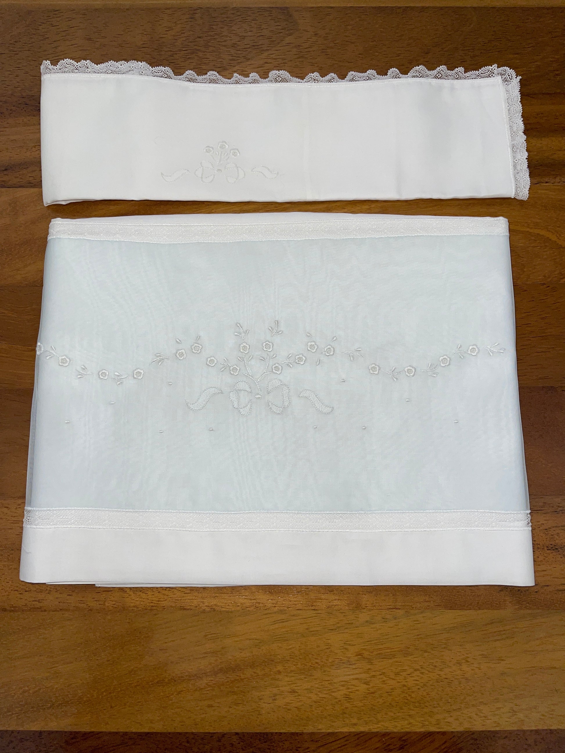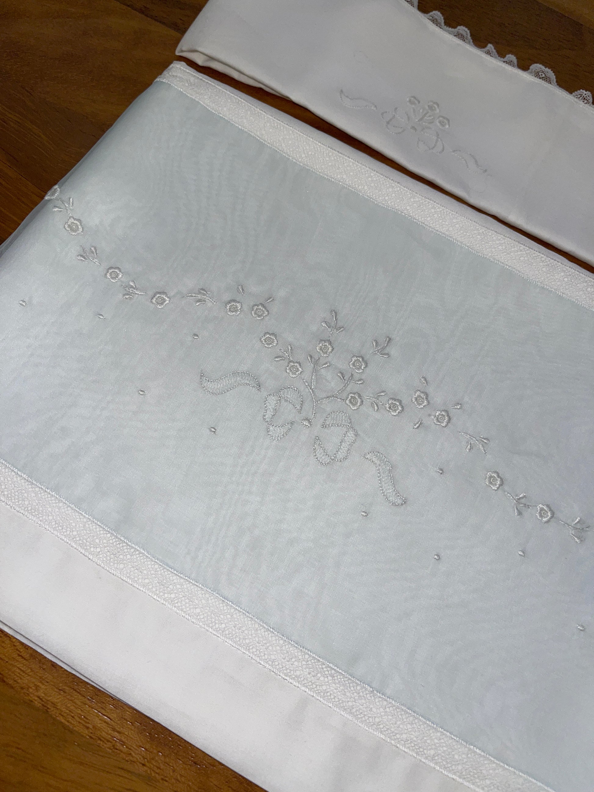 Questo meraviglioso lenzuolino in batista di cotone presenta un bouquet di fiori ricamati al centro e un sottile velo di organza di seta, donando un tocco di eleganza e raffinatezza al tuo lettino. Il perfetto connubio tra comfort e stile, per un sonno dolce e rilassante.