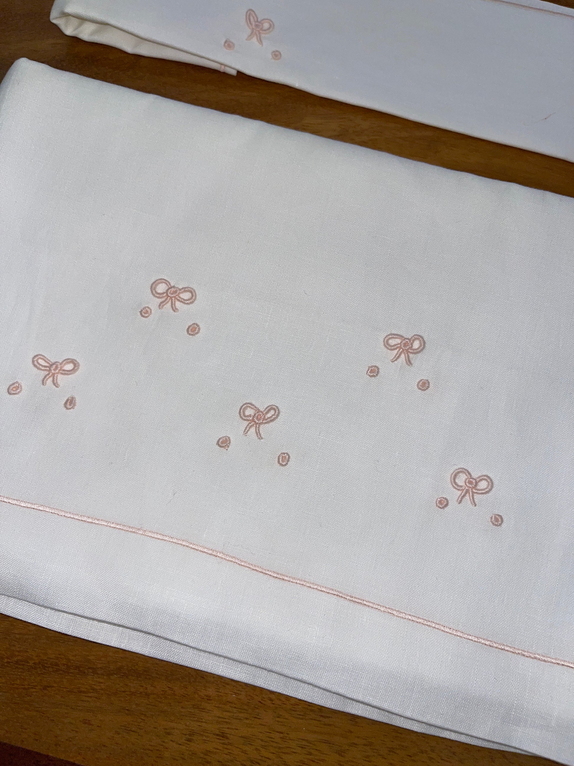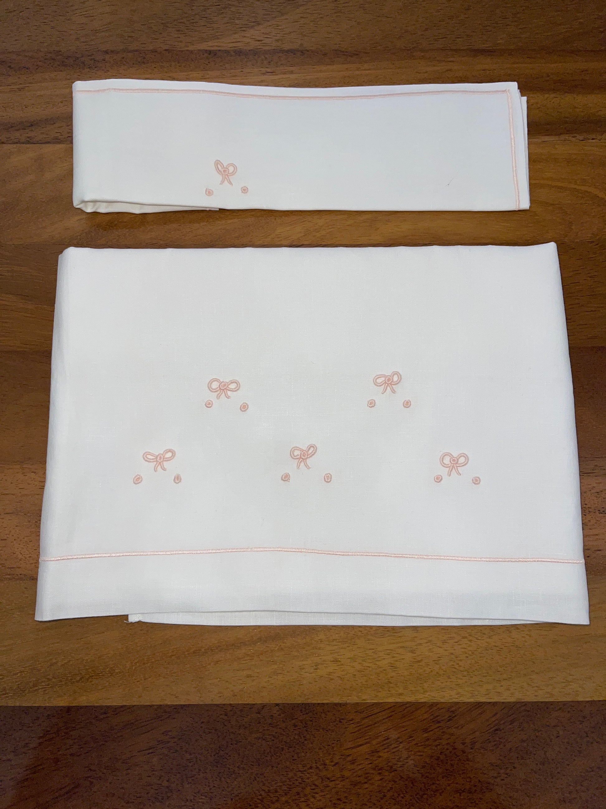 Questo lenzuolino è un'aggiunta elegante e di lusso al tuo corredo. Realizzato in puro lino, con un profilo ai bordi per un tocco sofisticato e un ricamo fatto a mano con nodi d'amore per aggiungere un tocco di romanticismo. Completamente personalizzabile, è perfetto per creare un'atmosfera confortevole e raffinata nella tua camera da letto.