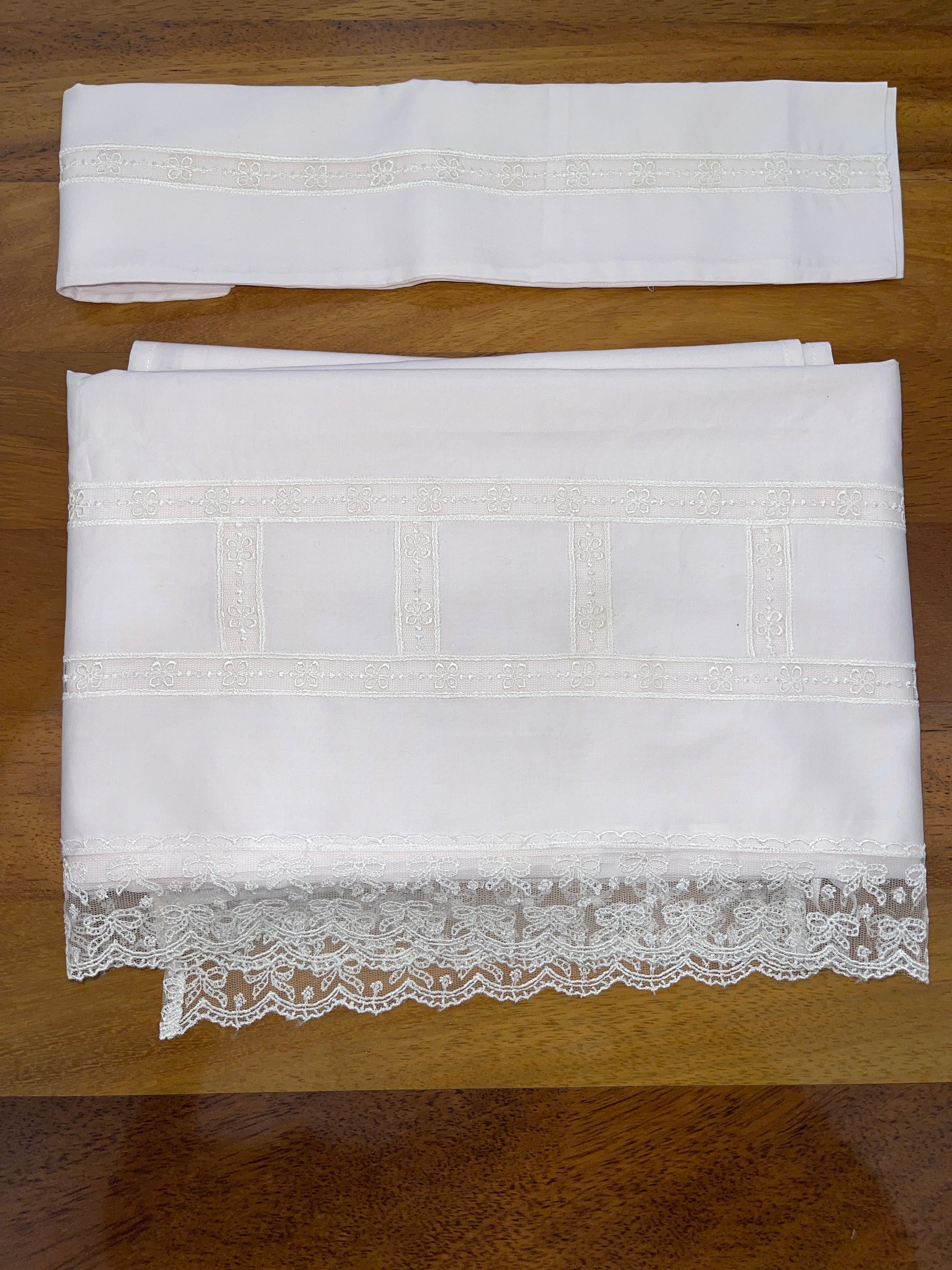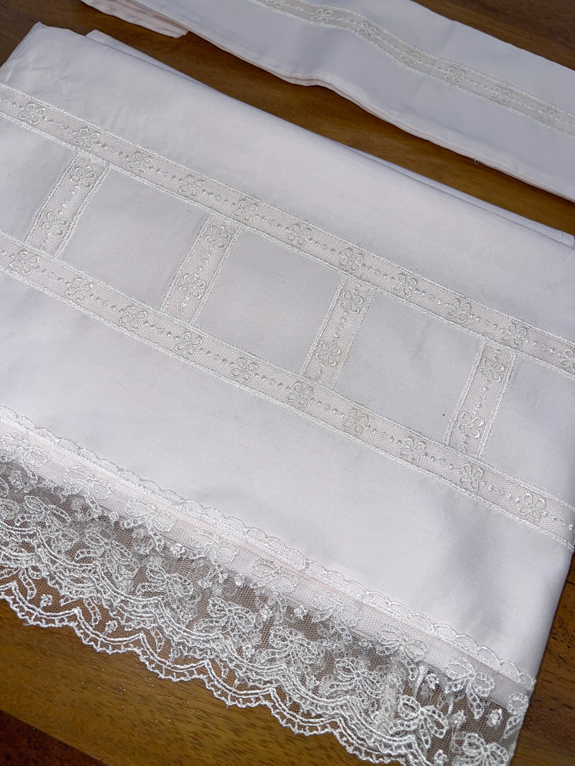 Questo lenzuolino è realizzato in batista di cotone, con un elegante merletto sul bordo e un merletto ad intaglio centrale. Ideale per un sonno morbido e confortevole, donerà un tocco di eleganza alla tua camera da letto. Garantisce qualità e raffinatezza grazie all'uso di materiali pregiati come il cotone.