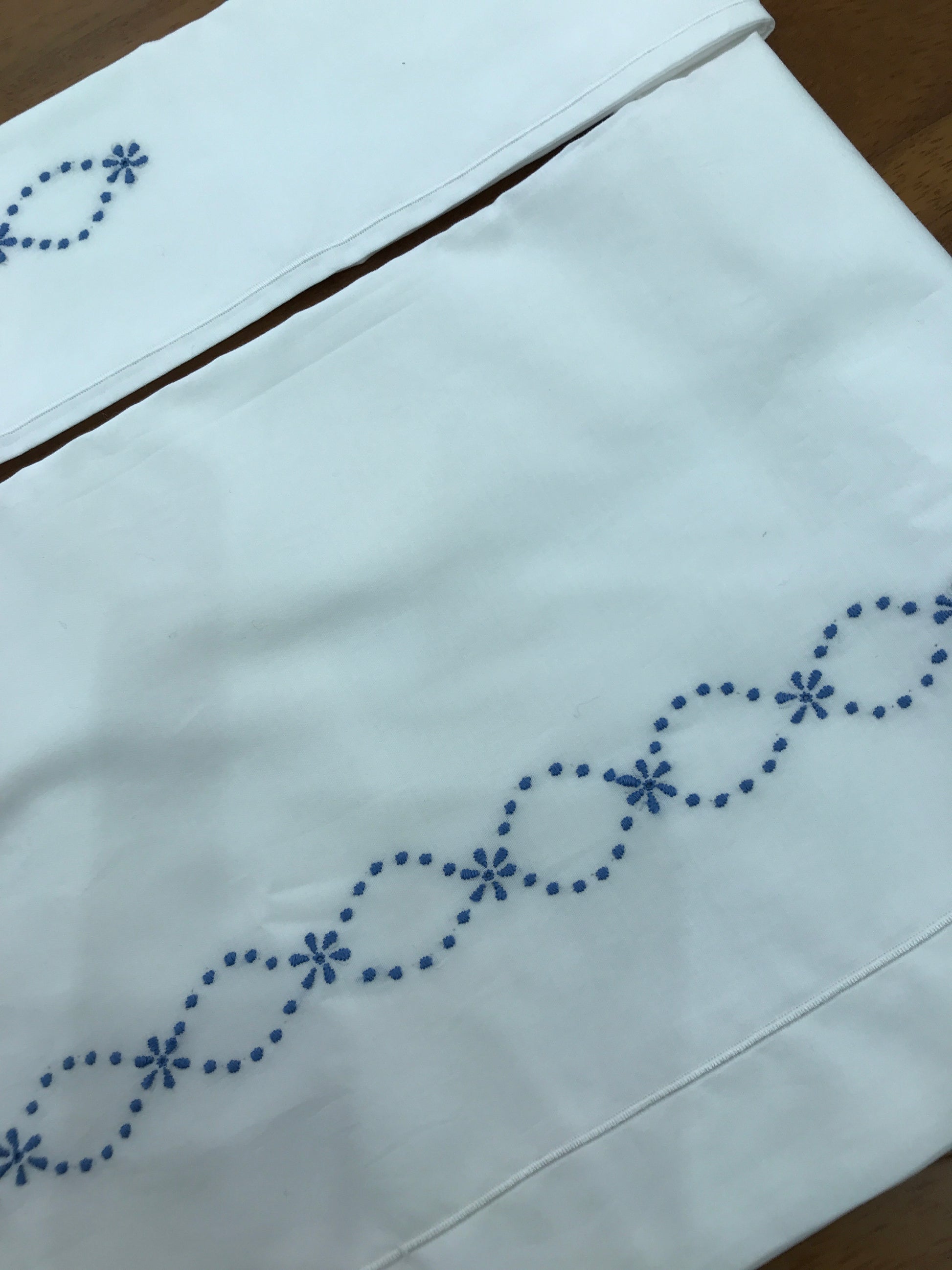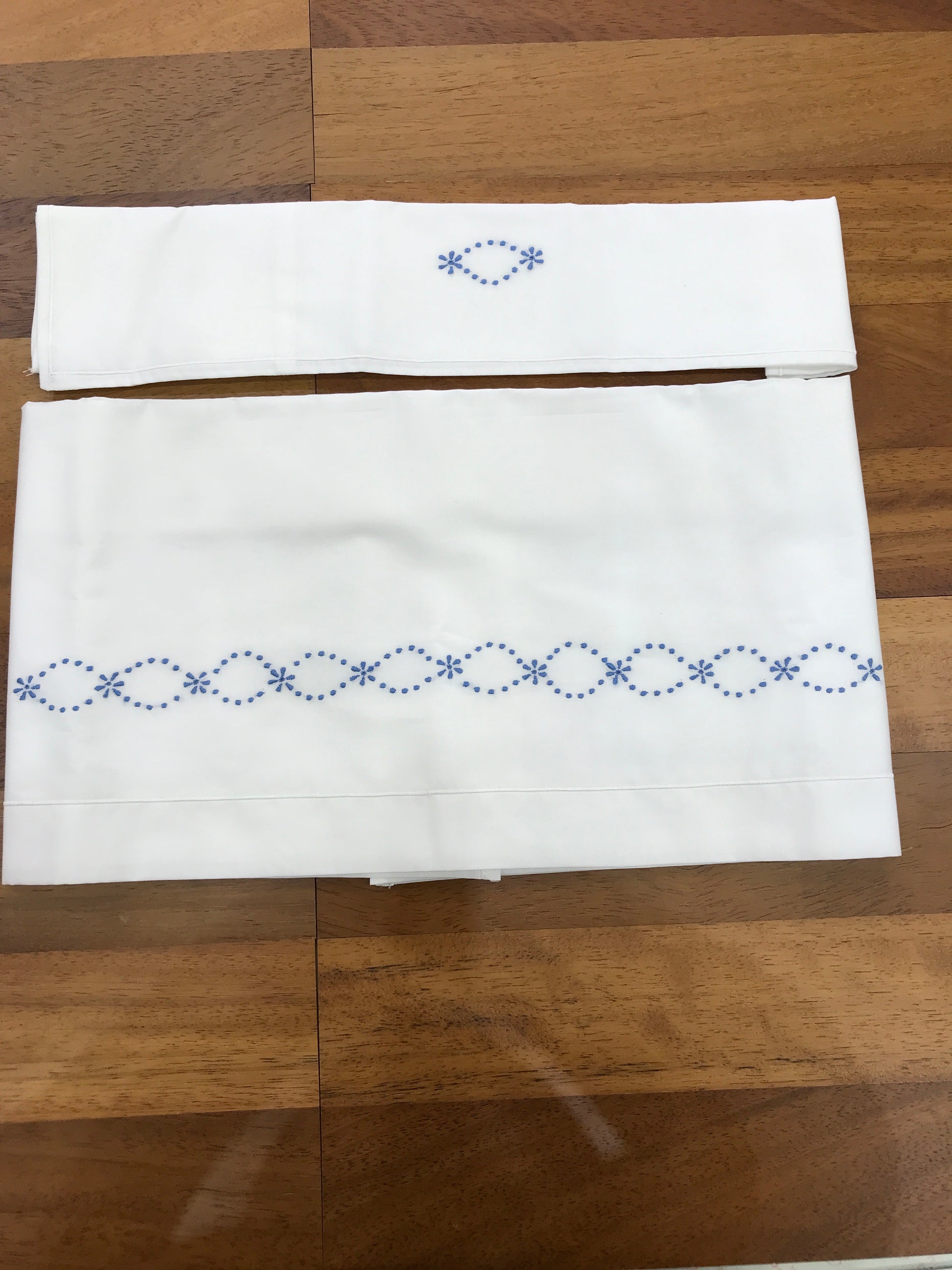 Lenzuolo bianco raffinato, decorato con eleganti ricami blu che arricchiscono sia il lenzuolino che la federa, conferendo un tocco di classe e delicatezza all’insieme. Questa combinazione di colori e dettagli artigianali garantisce un prodotto di alta qualità, ideale per chi cerca comfort e stile in ogni dettaglio della biancheria da letto.