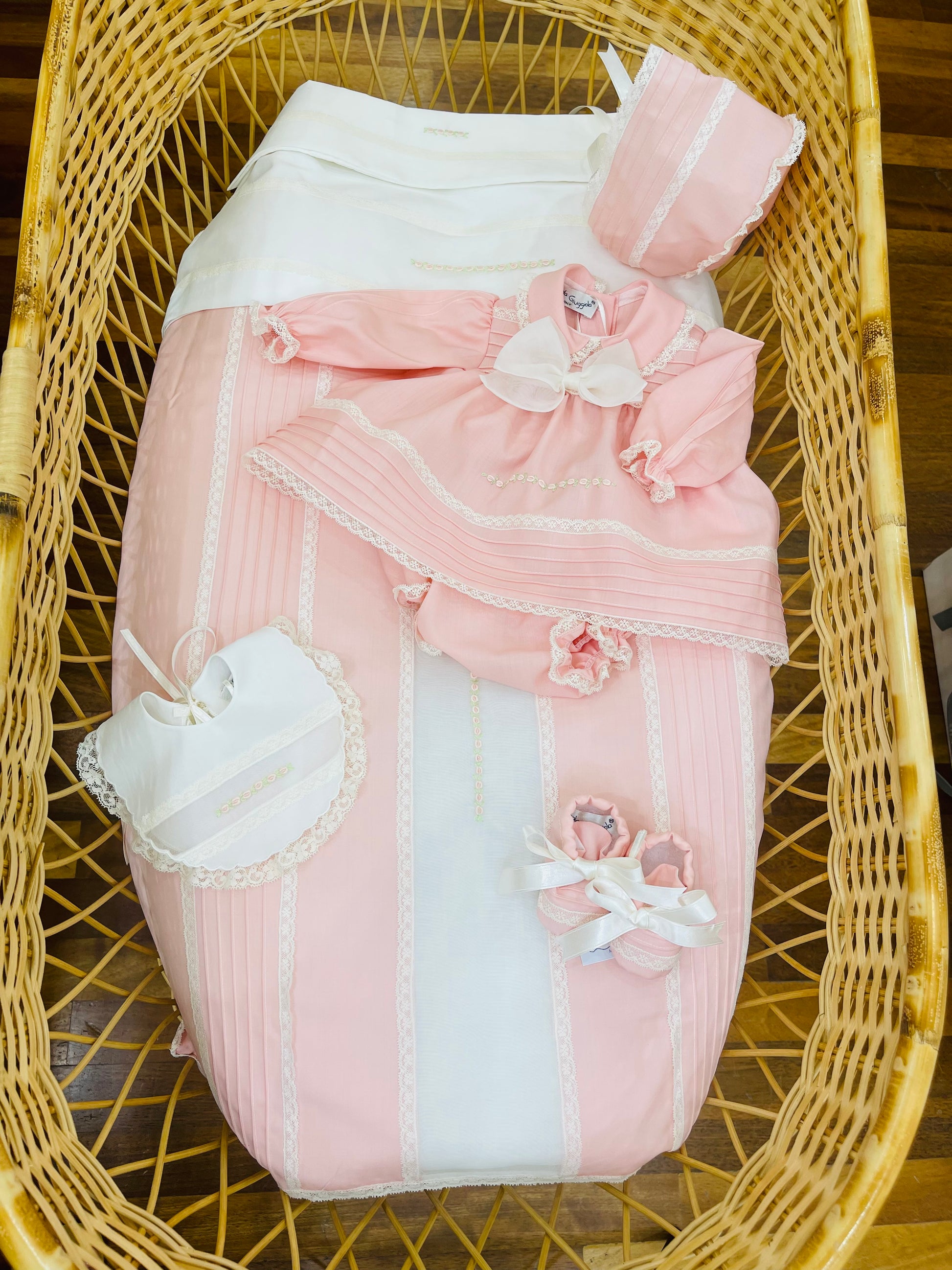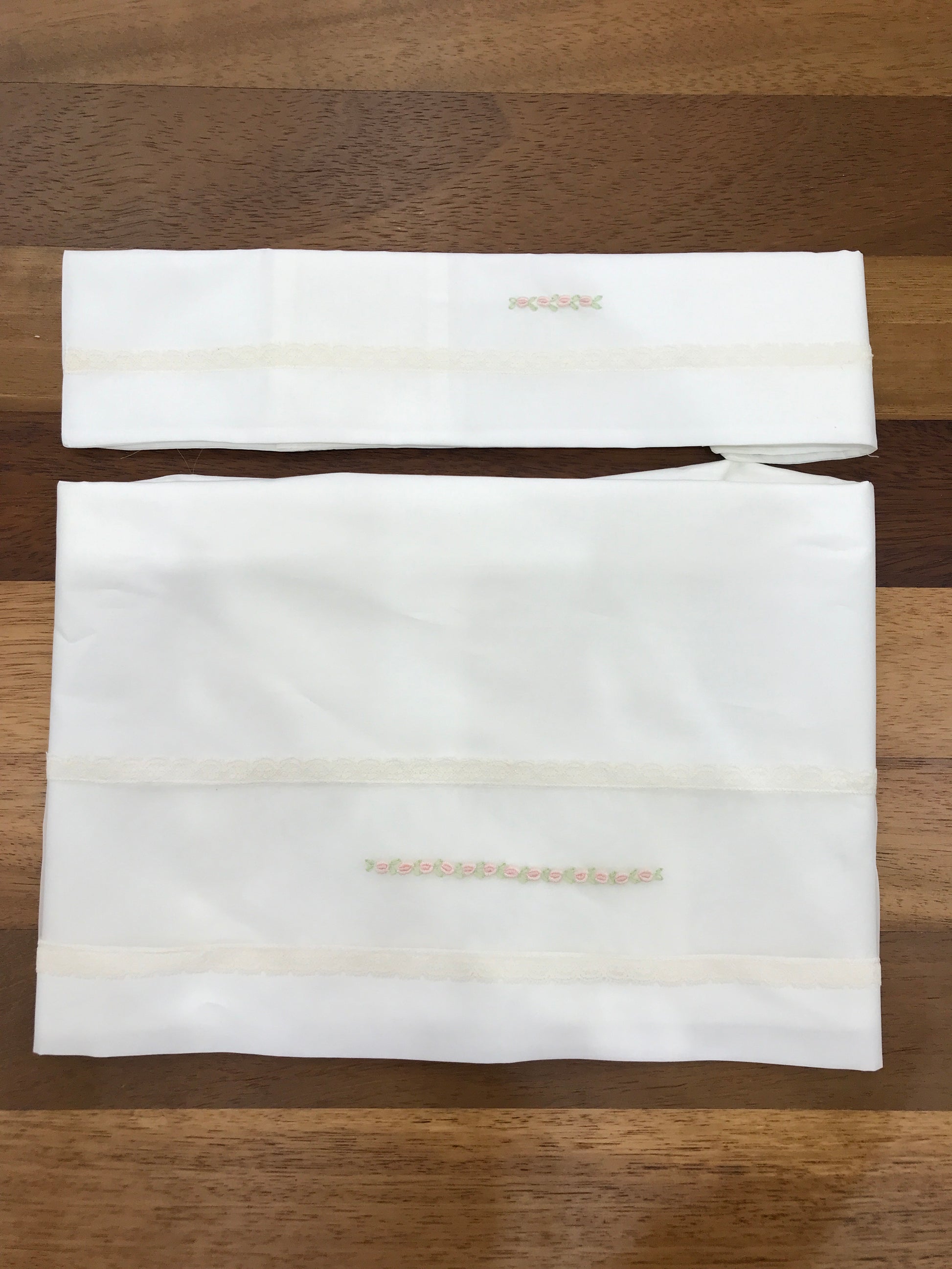 Lenzuolino realizzato in batista di cotone, decorato con una fascia in organza e roselline ricamate a mano al centro, rifinito con pizzo Valancienne. Lo stesso dettaglio elegante è presente anche sulla federa.