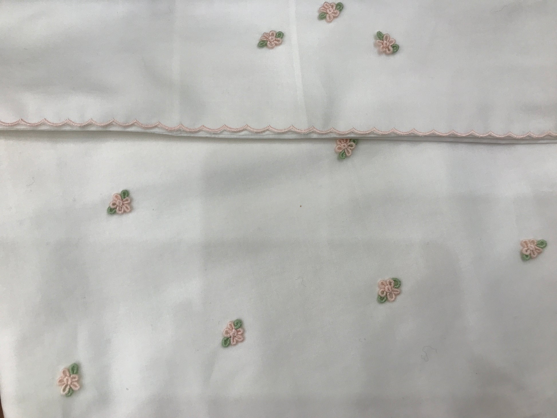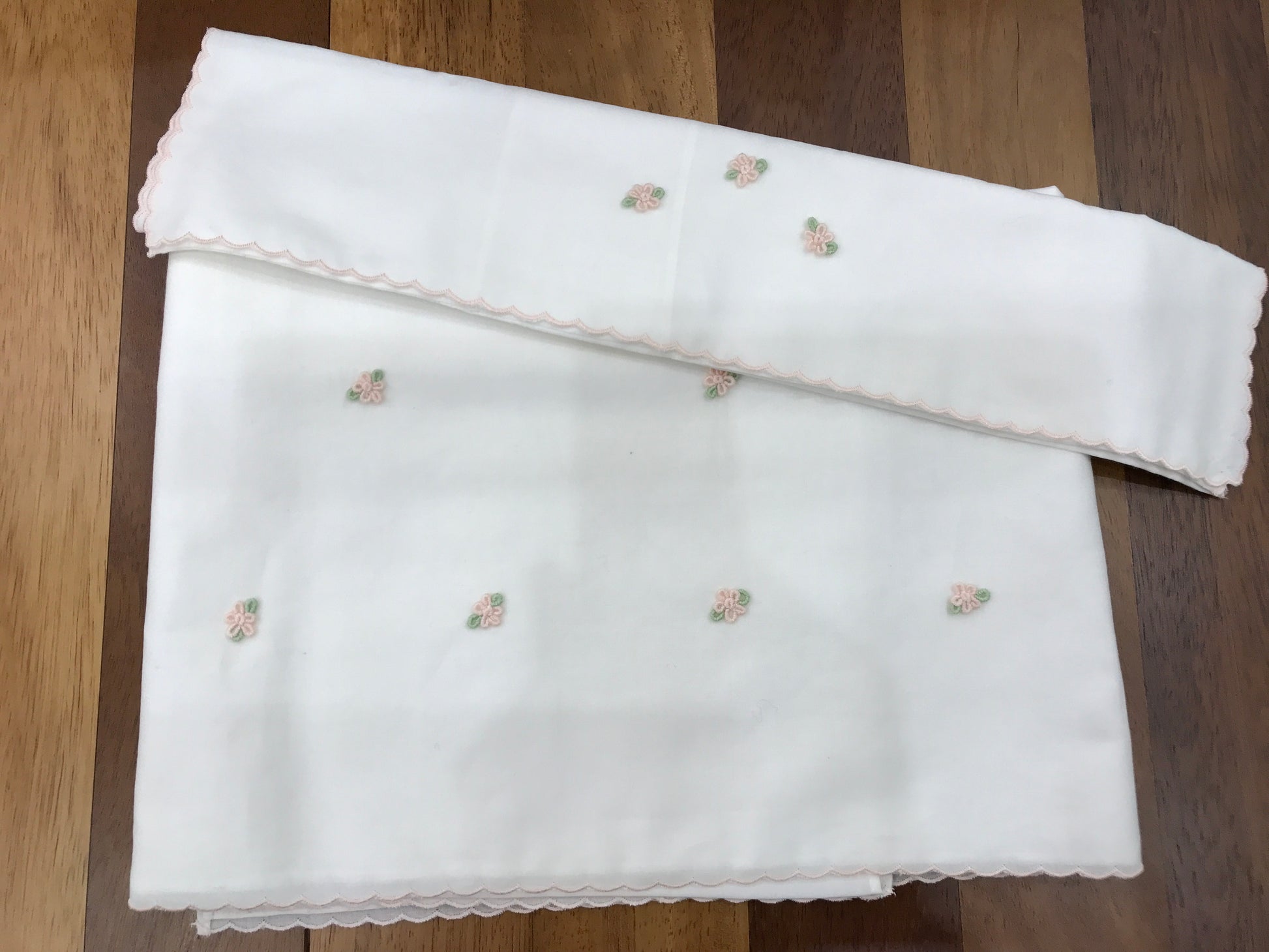 Delicato lenzuolino in puro cotone bianco, arricchito da uno smerlo ricamato in rosa che percorre i bordi con eleganza. La superficie frontale è decorata con fiori ricamati in tonalità rosa e foglie verdi, creando un motivo floreale raffinato. La federa del cuscino abbina la medesima lavorazione ricamata, garantendo un set coordinato e armonioso. Un capo essenziale per la cameretta, realizzato con attenzione ai dettagli e alla qualità costruttiva.