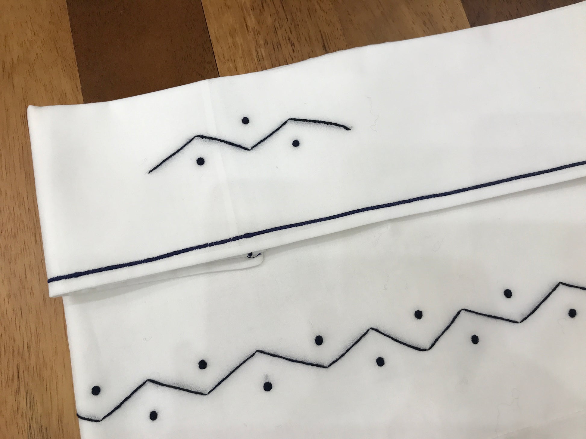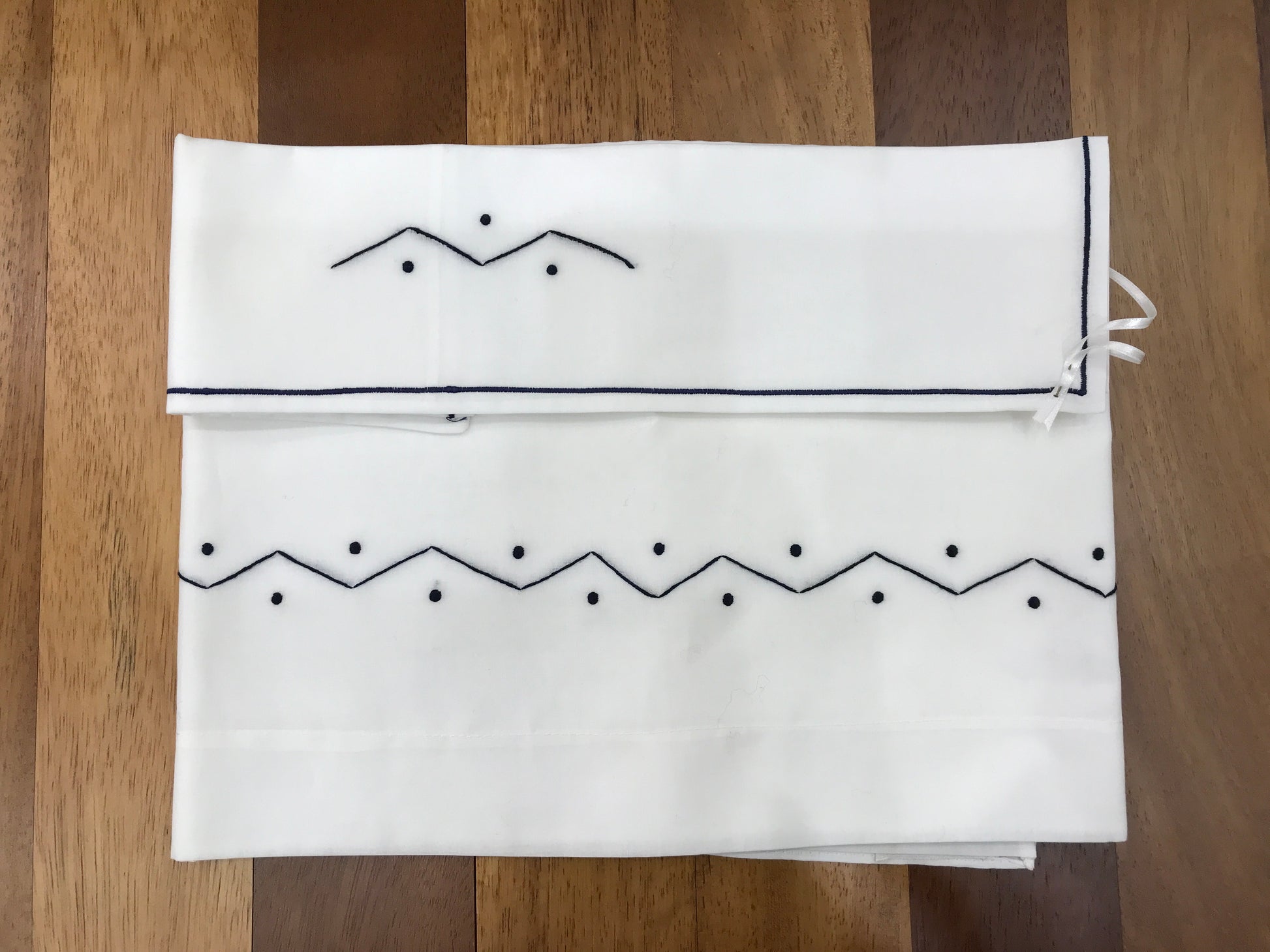 Delicato lenzuolino in puro cotone dalle tonalità neutre, arricchito da eleganti ricami e dettagli in blu che caratterizzano sia la parte frontale che la federa del cuscino. Un capo essenziale che combina praticità e raffinatezza, perfetto per completare la biancheria della cameretta con stile e comfort.