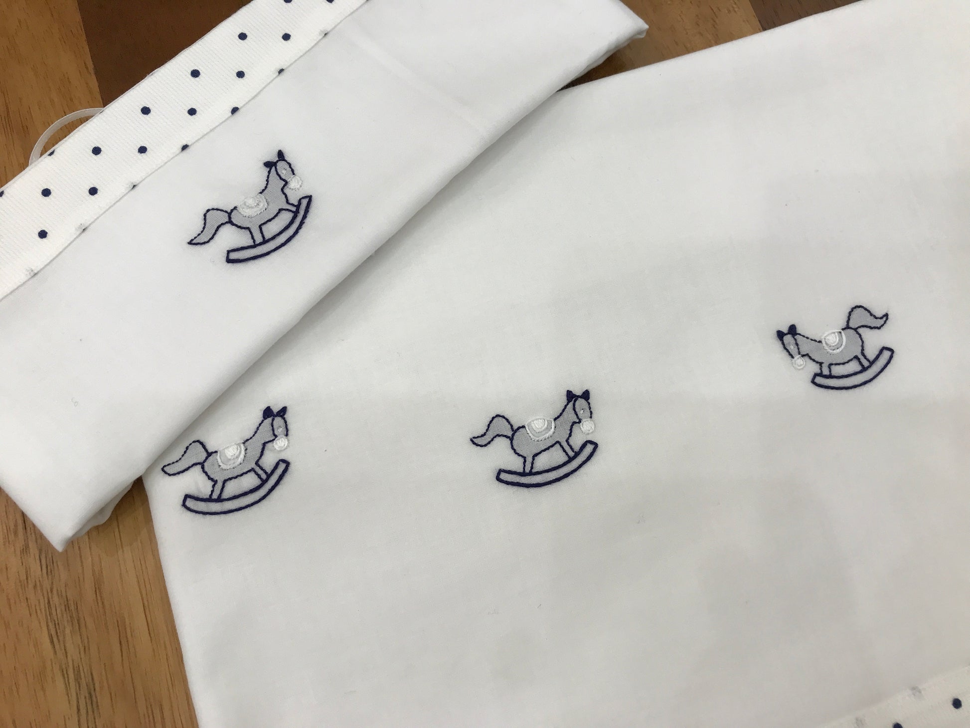 Delicato lenzuolino in puro cotone dal design raffinato e versatile. Caratterizzato da una base bianca impreziosita da pois blu lungo il bordo e da cavalli a dondolo blu al centro della parte anteriore, questo pezzo combina eleganza e giocosità. La federa coordina perfettamente con la medesima decorazione, creando un set armonioso e completo. Ideale per garantire comfort e dolcezza al riposo dei più piccoli, unendo qualità tessile e estetica ricercata.