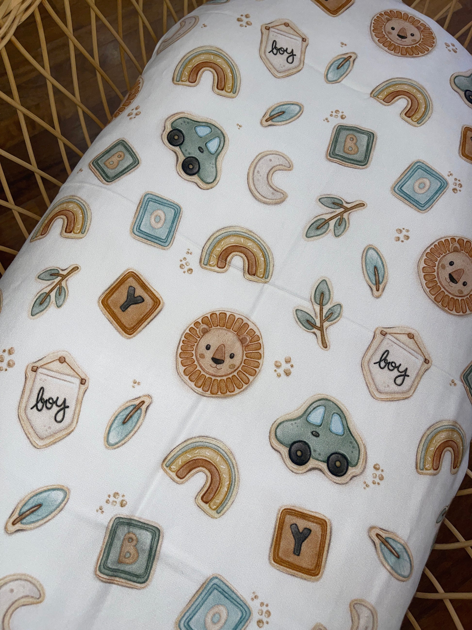Mussola realizzata in cotone di bamboo, decorata con vari motivi tra cui arcobaleni, macchinine, leoni e cubi con lettere.