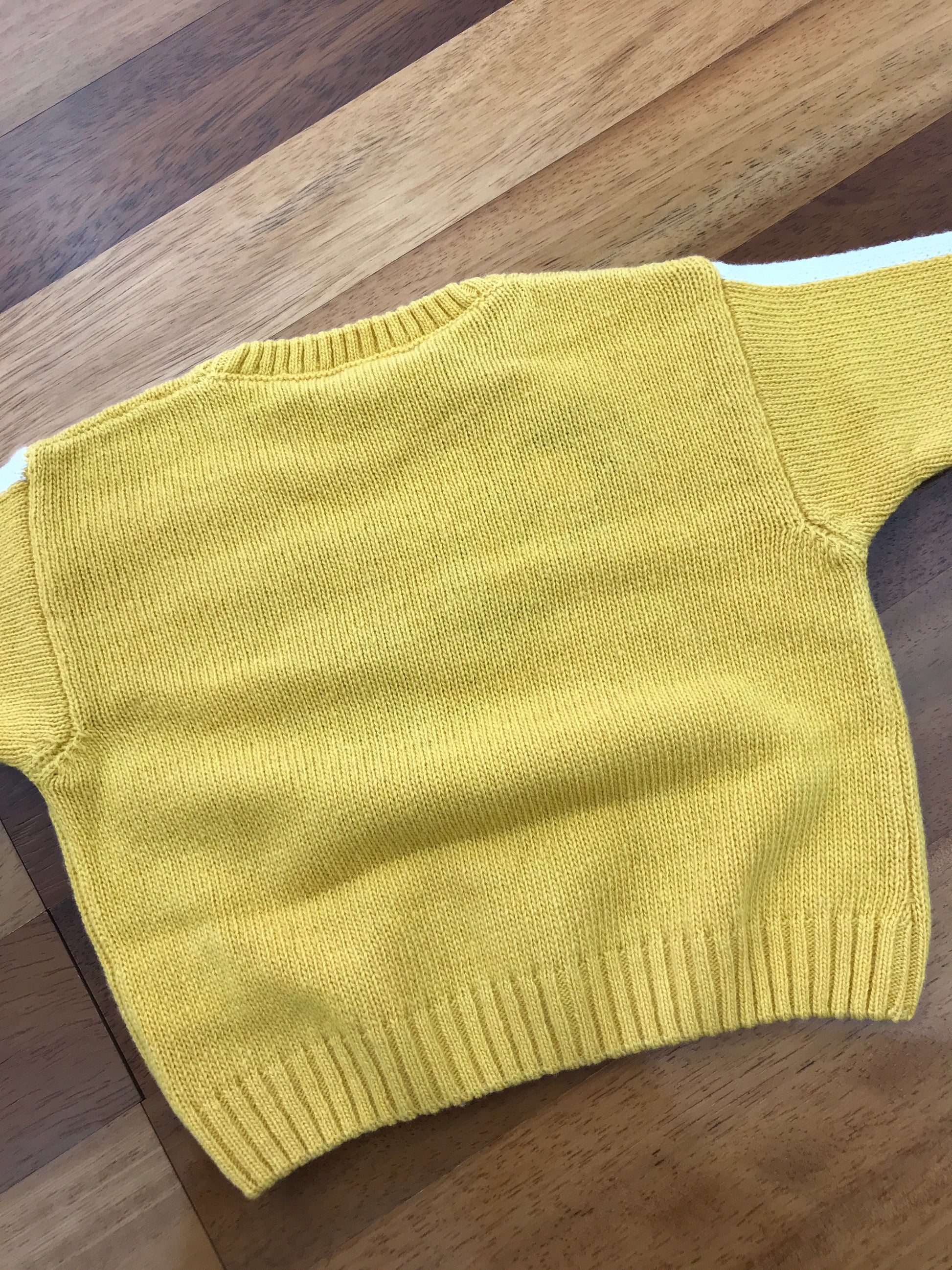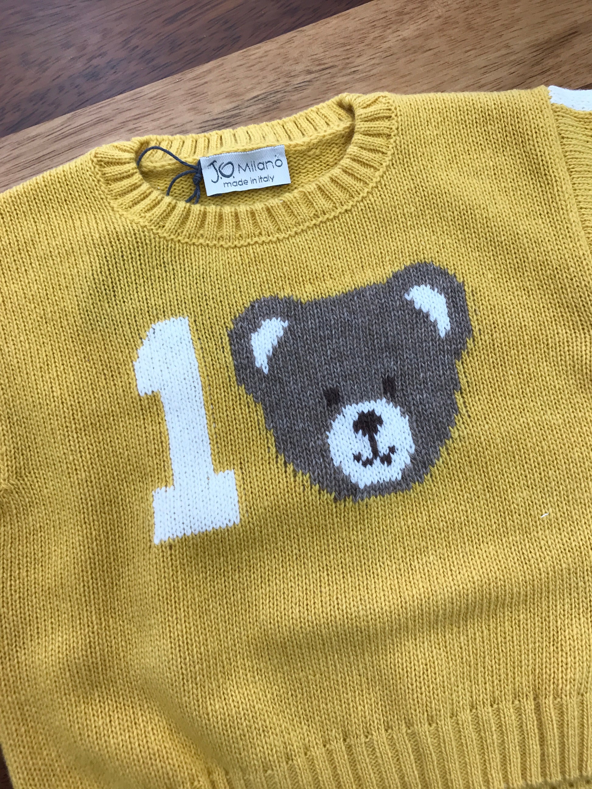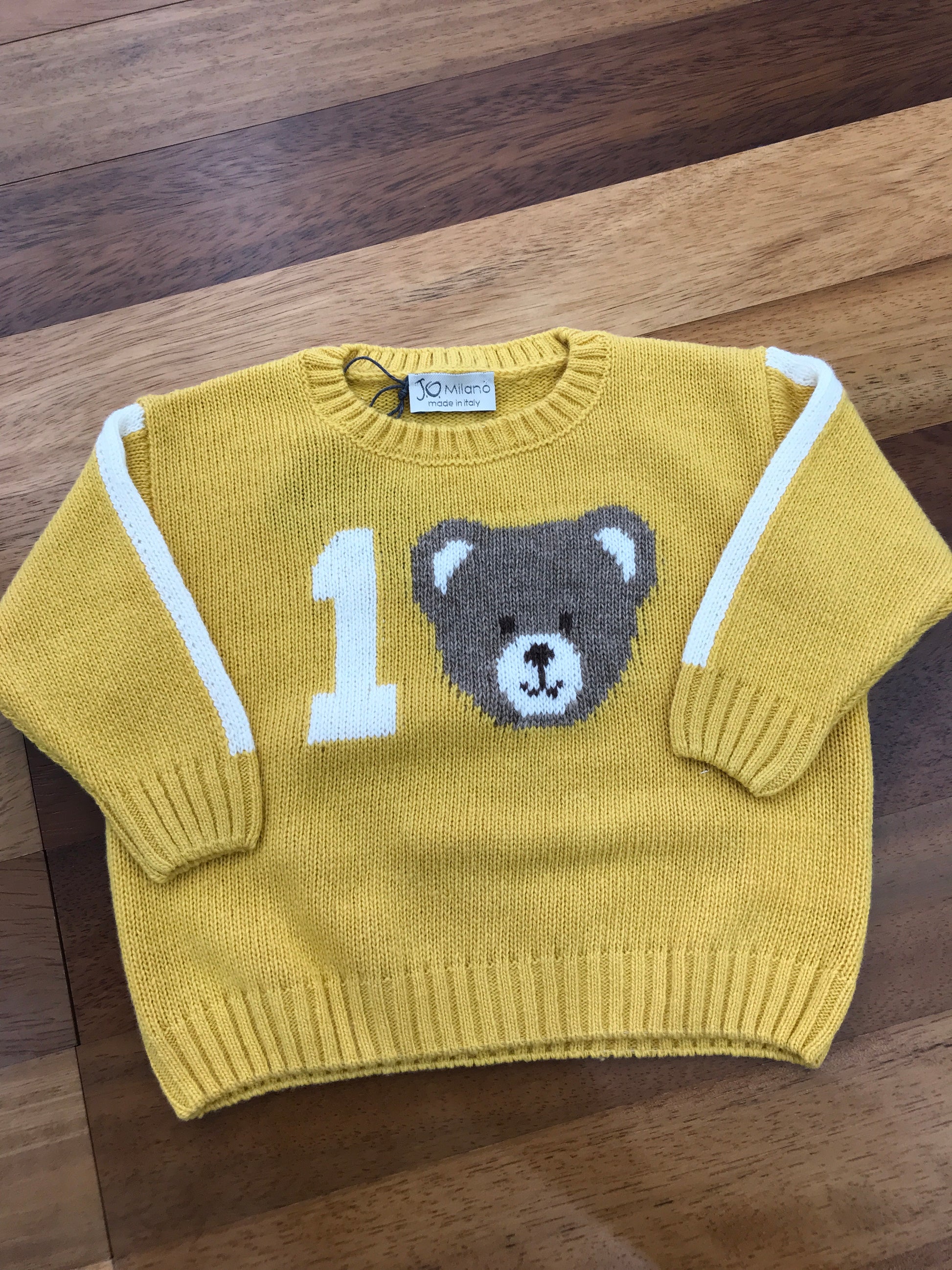 Questo maglioncino in lana color senape presenta dettagli raffinati, come le righe bianche sulle maniche che aggiungono un tocco di stile distintivo. Al centro, spicca un orsetto decorativo con il numero "1" in colore bianco, che conferisce un elemento giocoso e unico al capo. La combinazione di materiali di qualità e design curato rende questo maglioncino una scelta elegante e confortevole per i più piccoli.