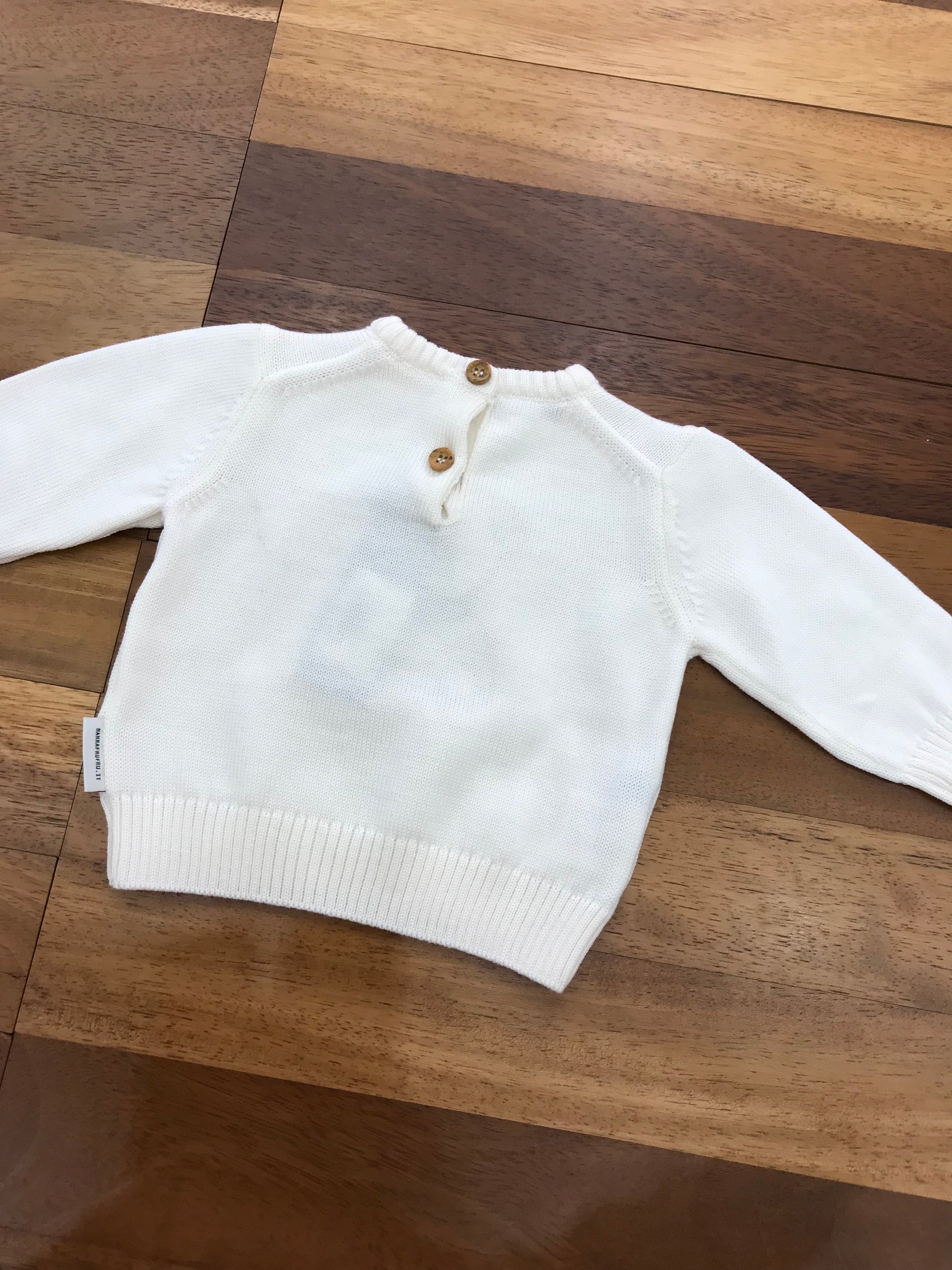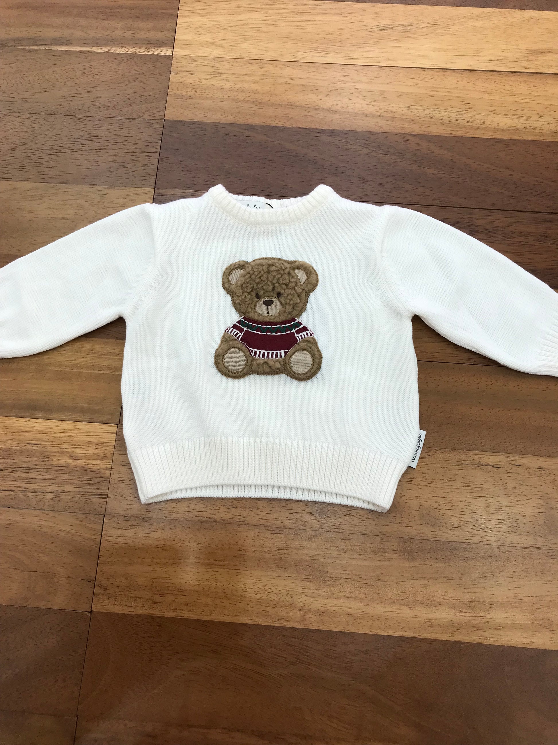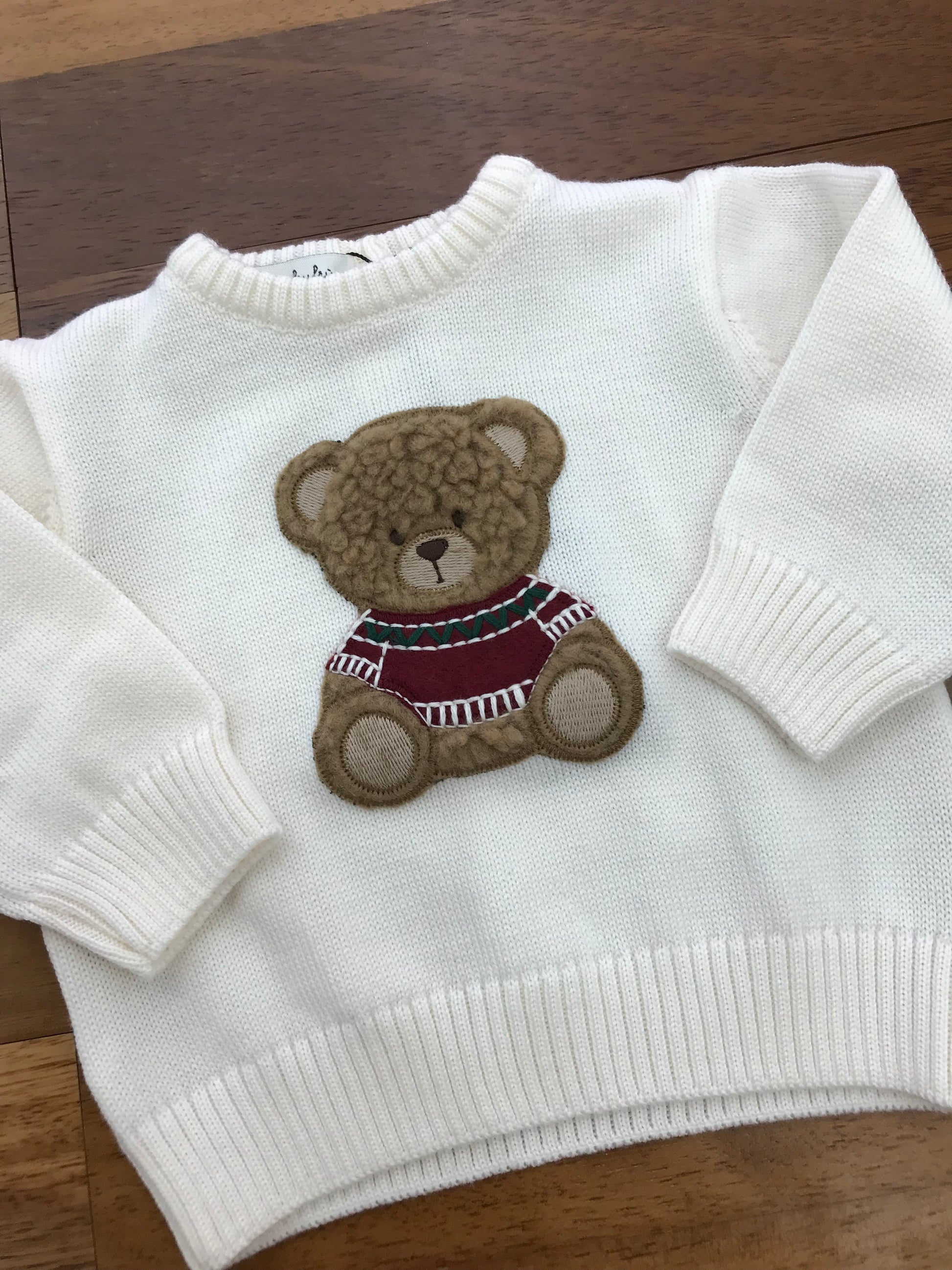 Maglioncino in morbida lana color panna, impreziosito da un orsetto peloso in rilievo posto centralmente sul davanti. Questo dettaglio aggiunge un tocco di originalità e dolcezza al capo, rendendolo perfetto per chi cerca comfort e stile in ogni occasione.