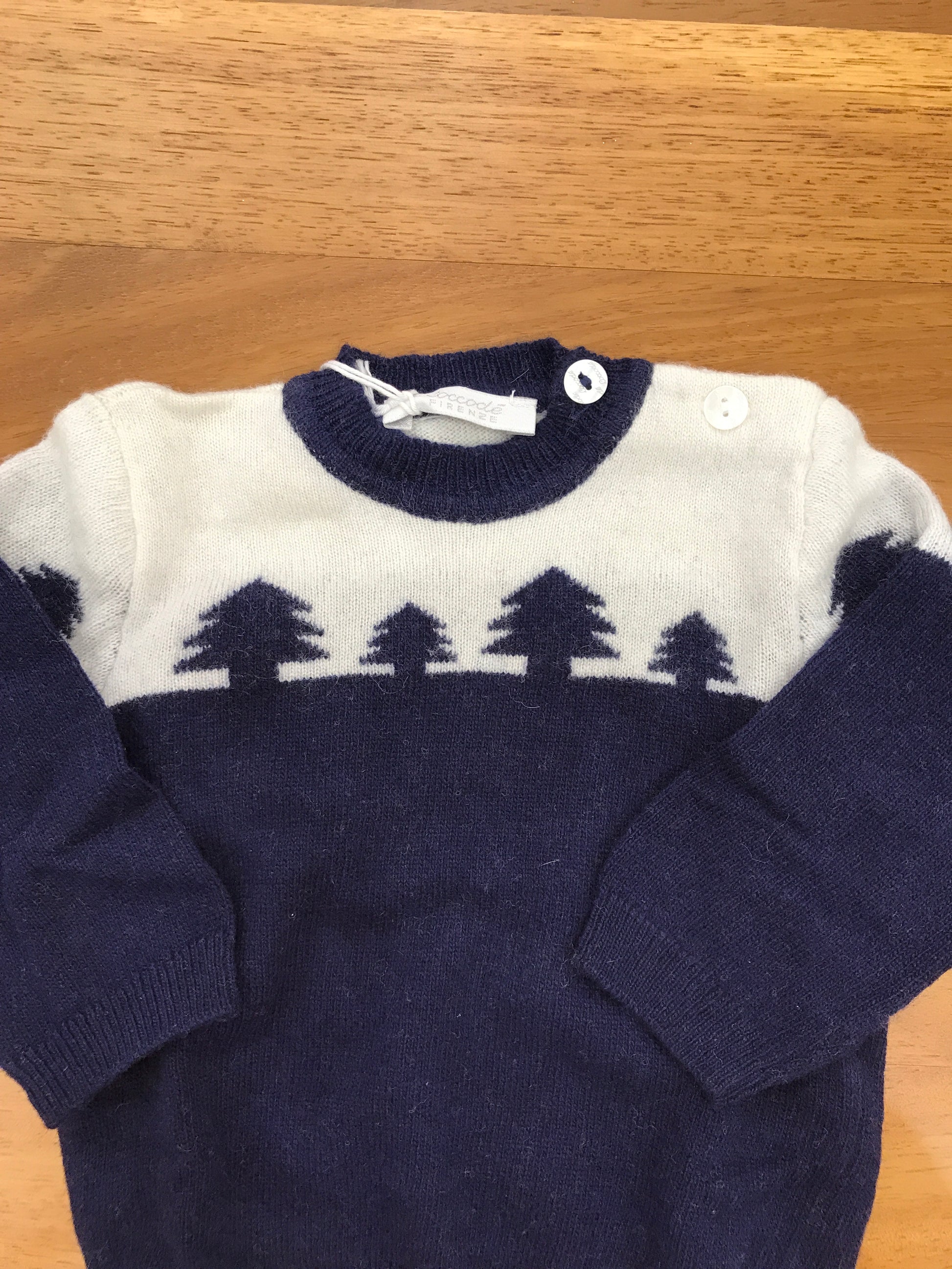 Cardigan in pregiata lana blu scuro, arricchito da un davanti color panna decorato con eleganti alberelli blu scuro.