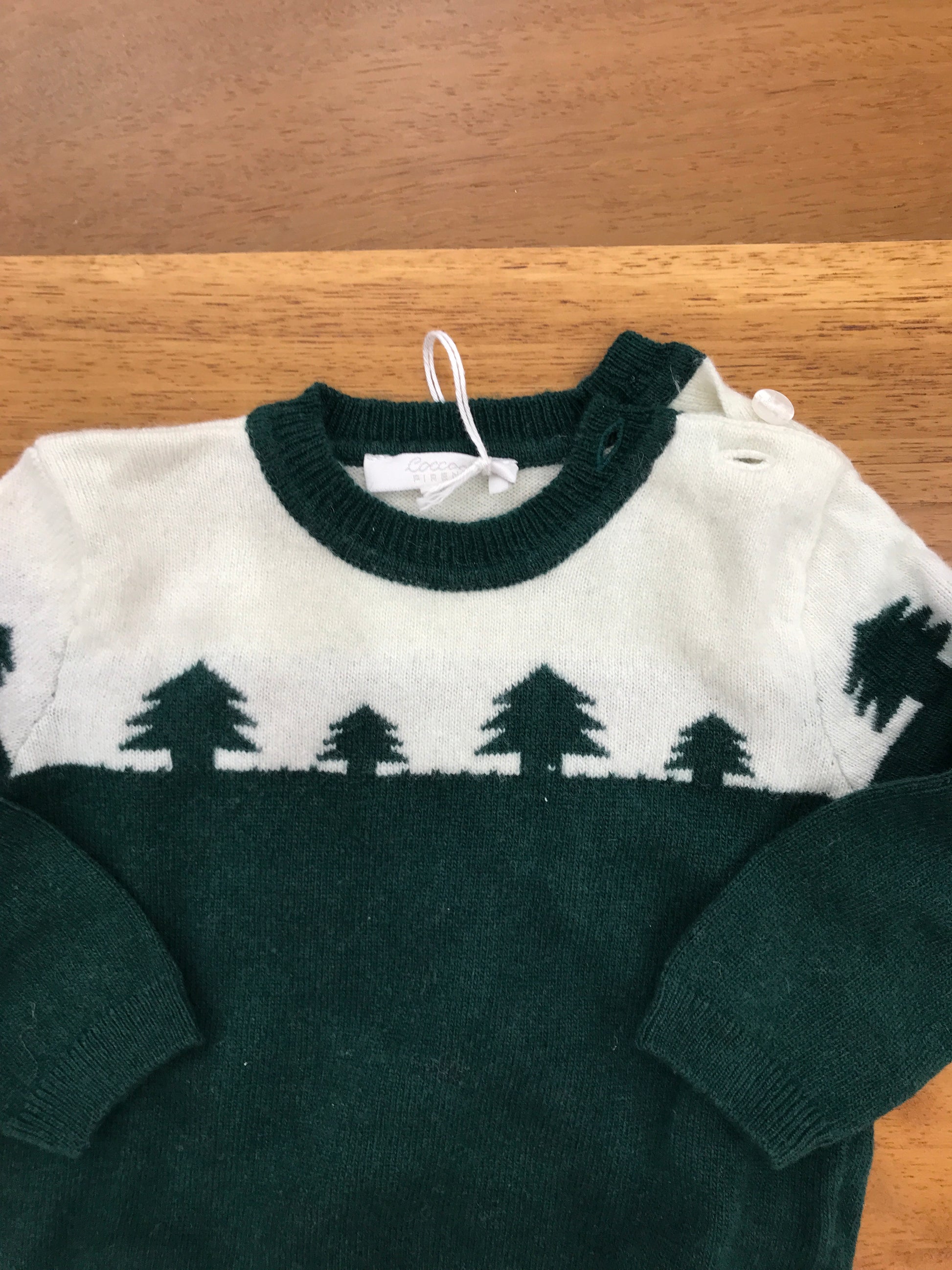 Maglione in lana verde scuro, con inserti panna sul petto decorati da alberelli verde scuro.