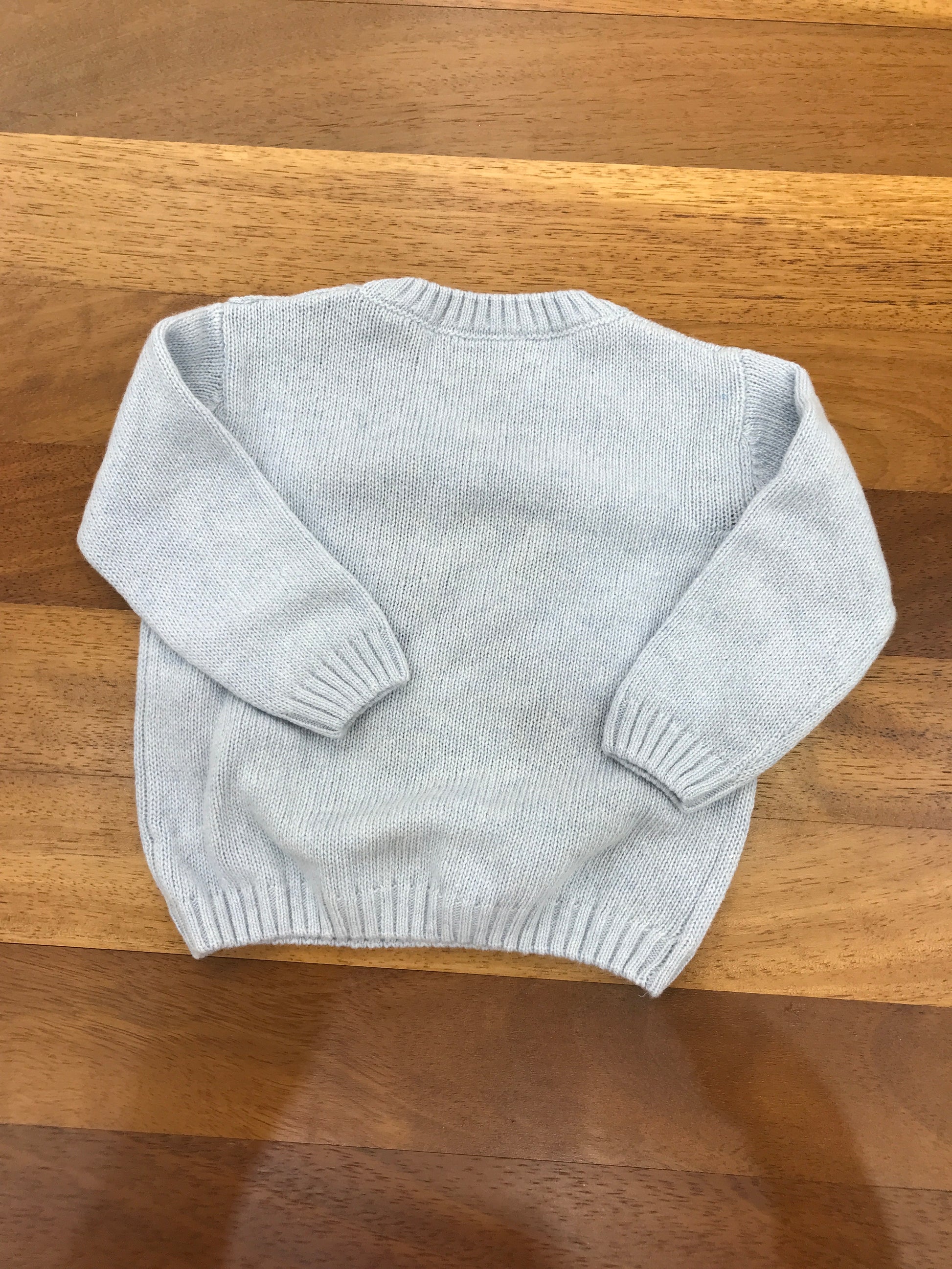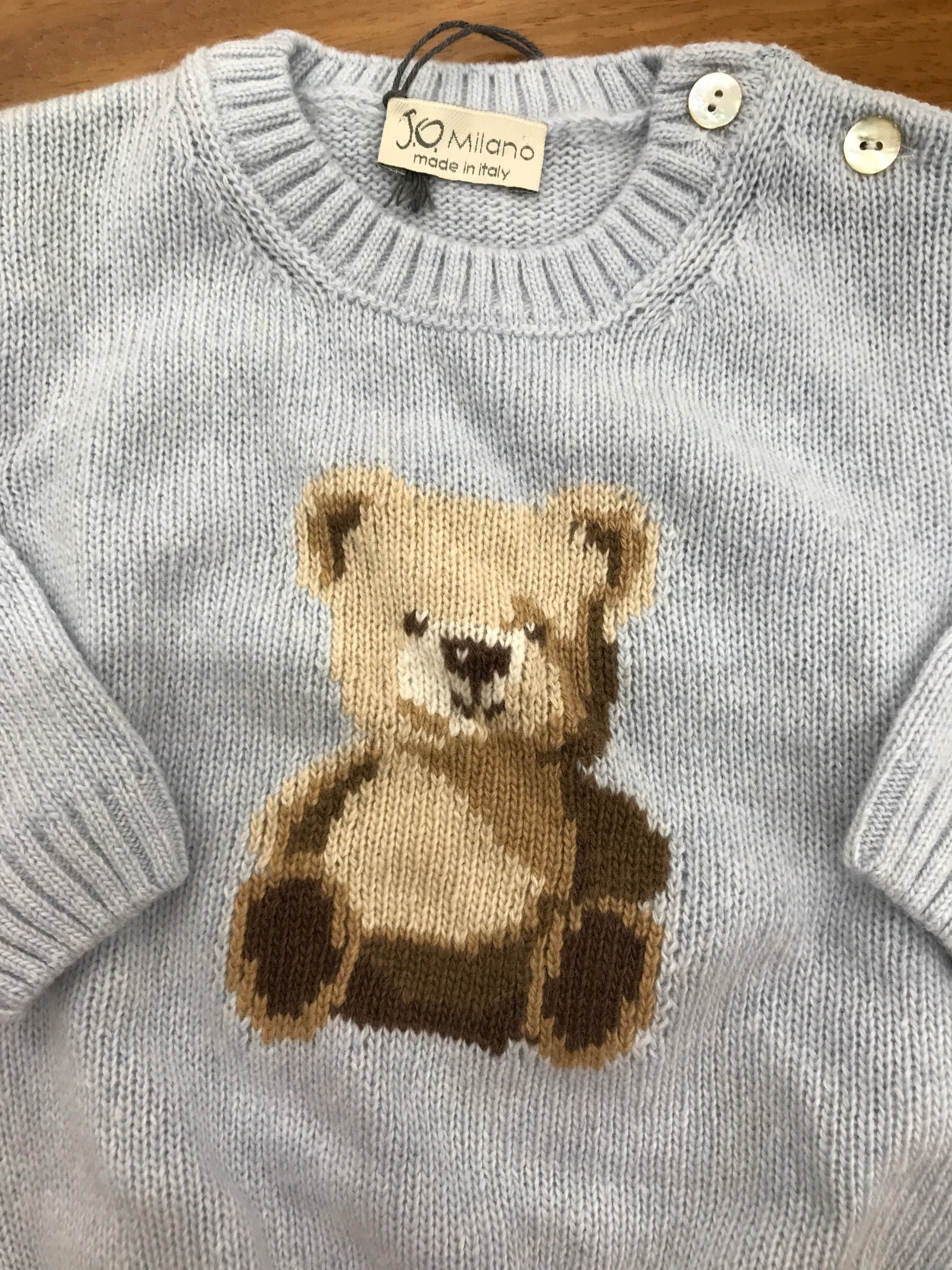 Maglione in lana color celeste, decorato con un orsetto marrone sul davanti.