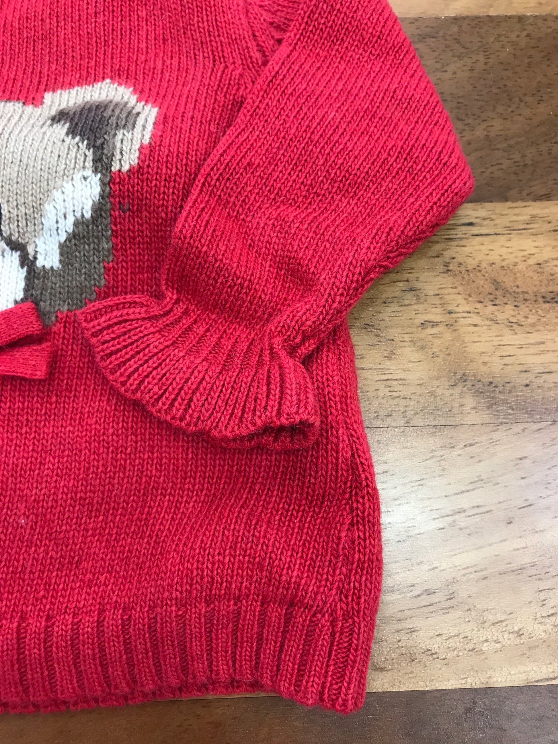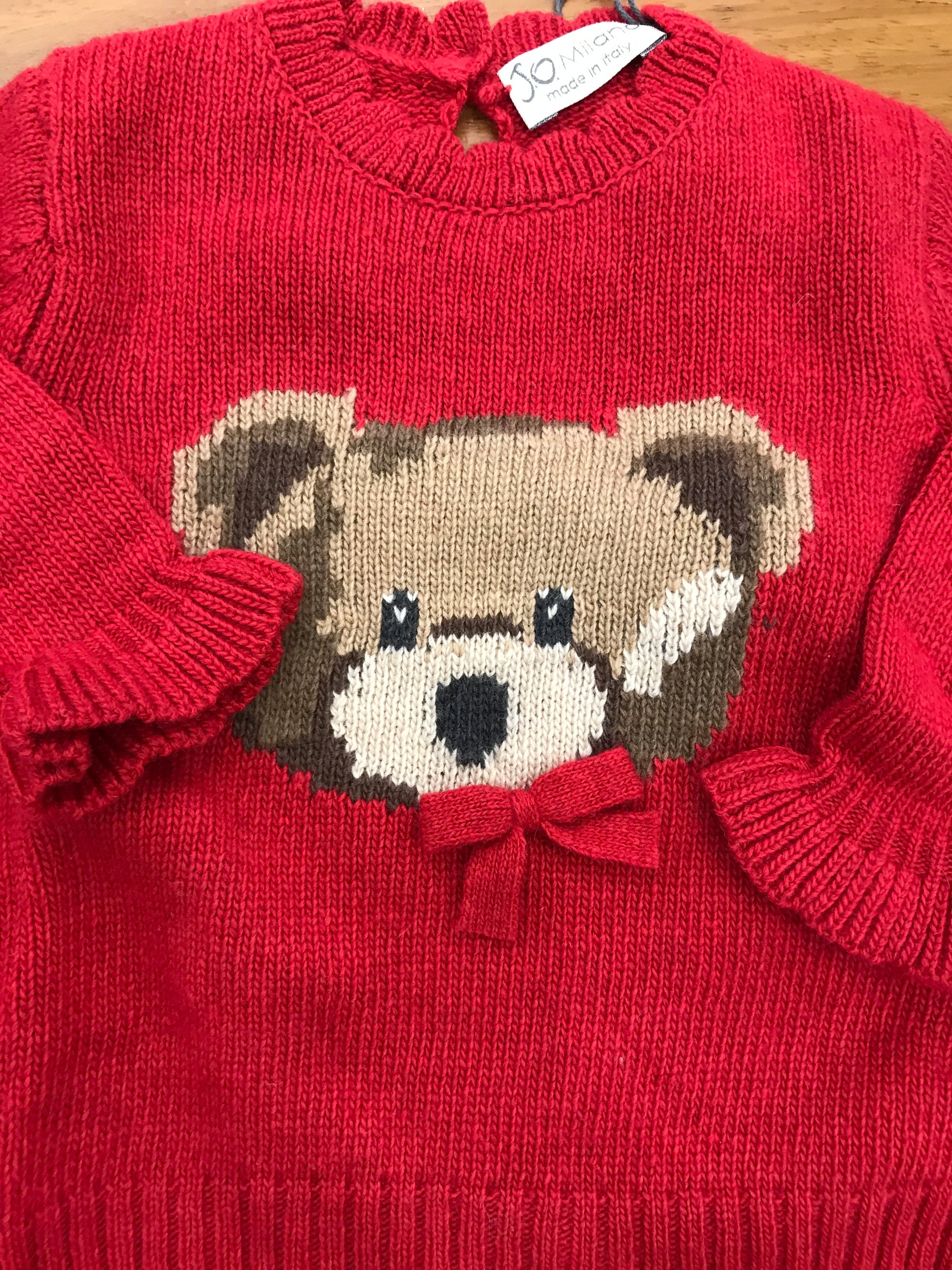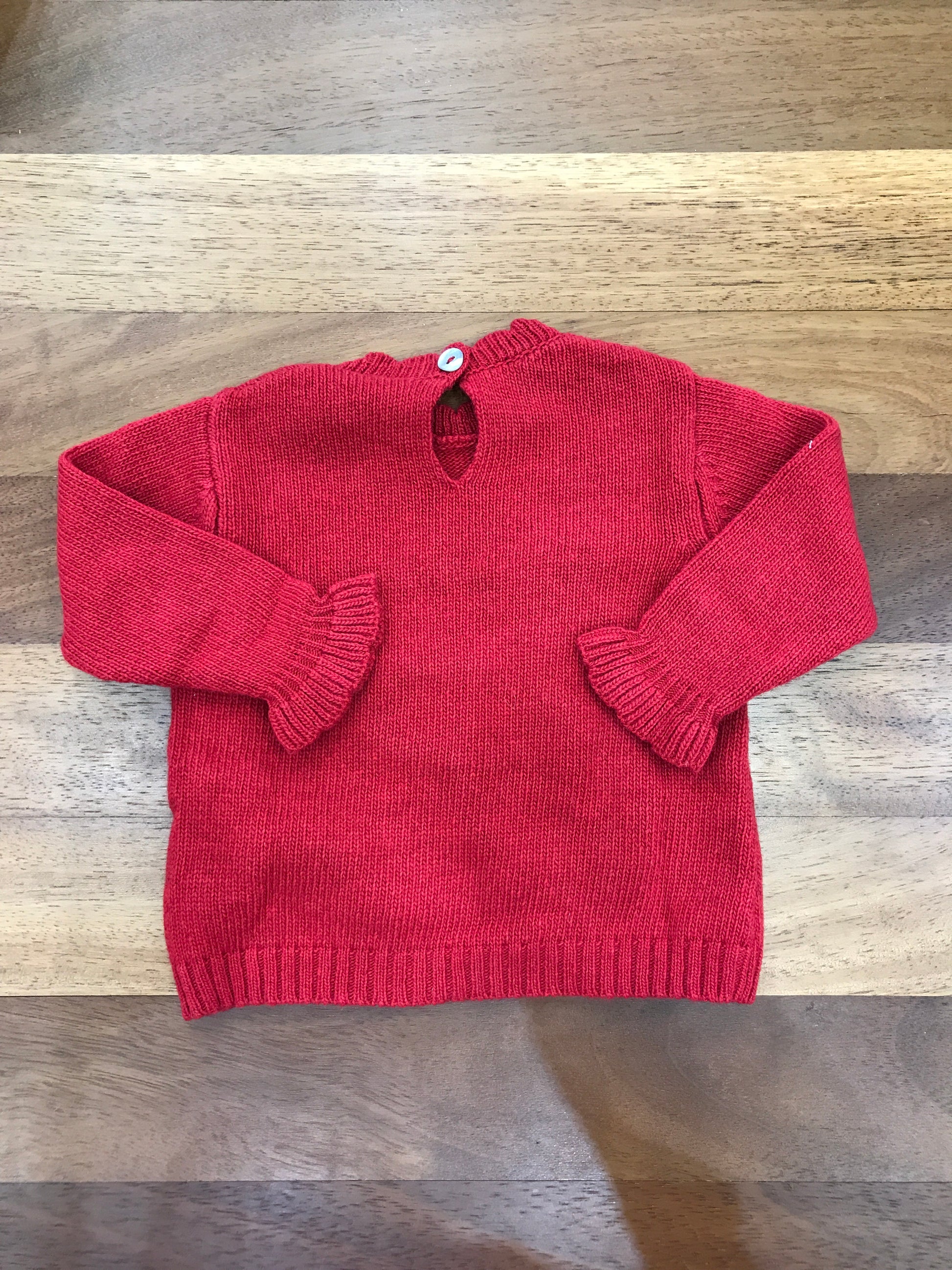 Maglione in lana rossa con una decorazione frontale che raffigura un orsetto, arricchito da un delicato fiocchetto in rilievo.