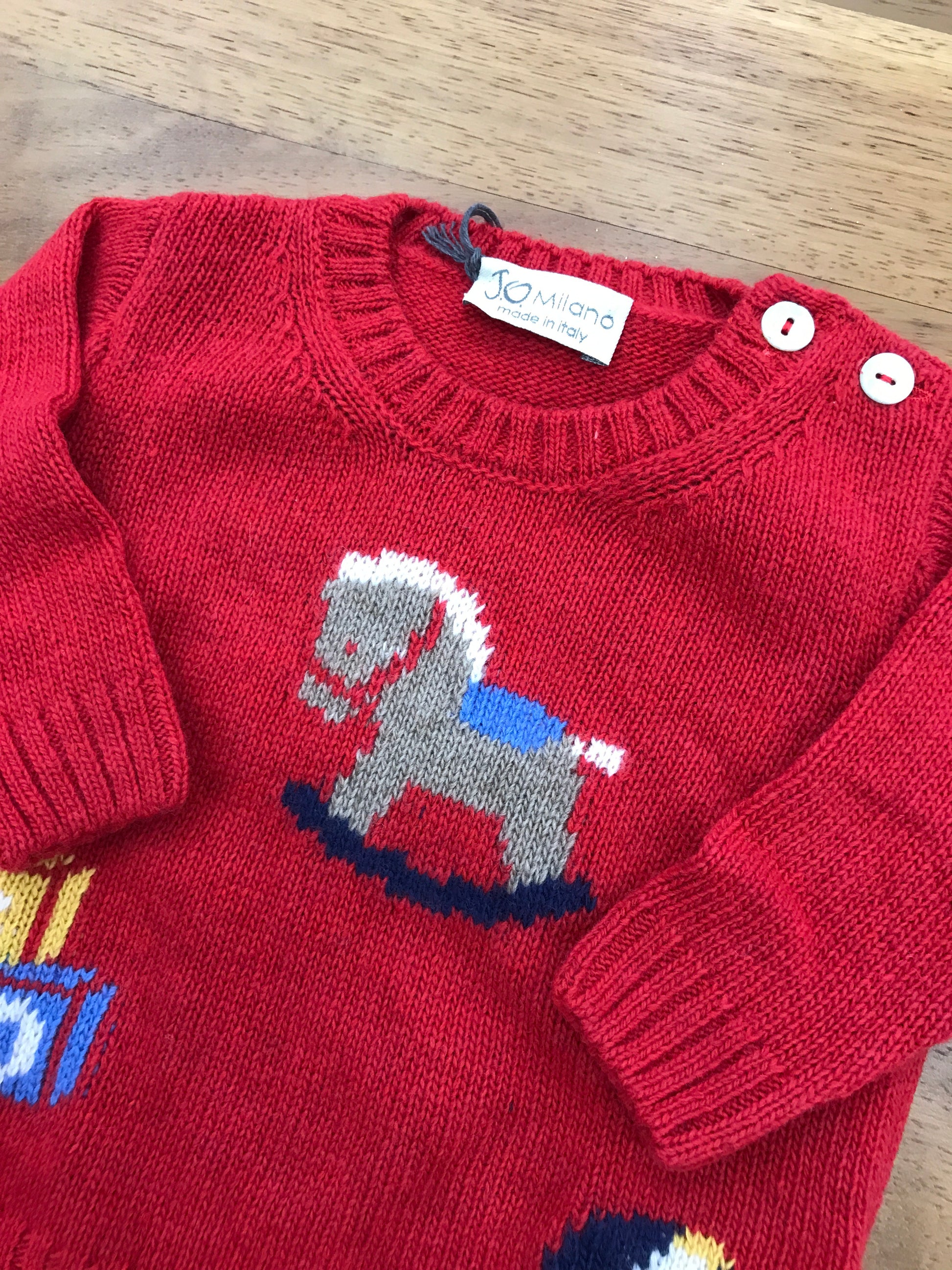 Maglione rosso in lana, decorato sul davanti con motivi giocosi tra cui un cavallo a dondolo, una palla e alcuni cubi.