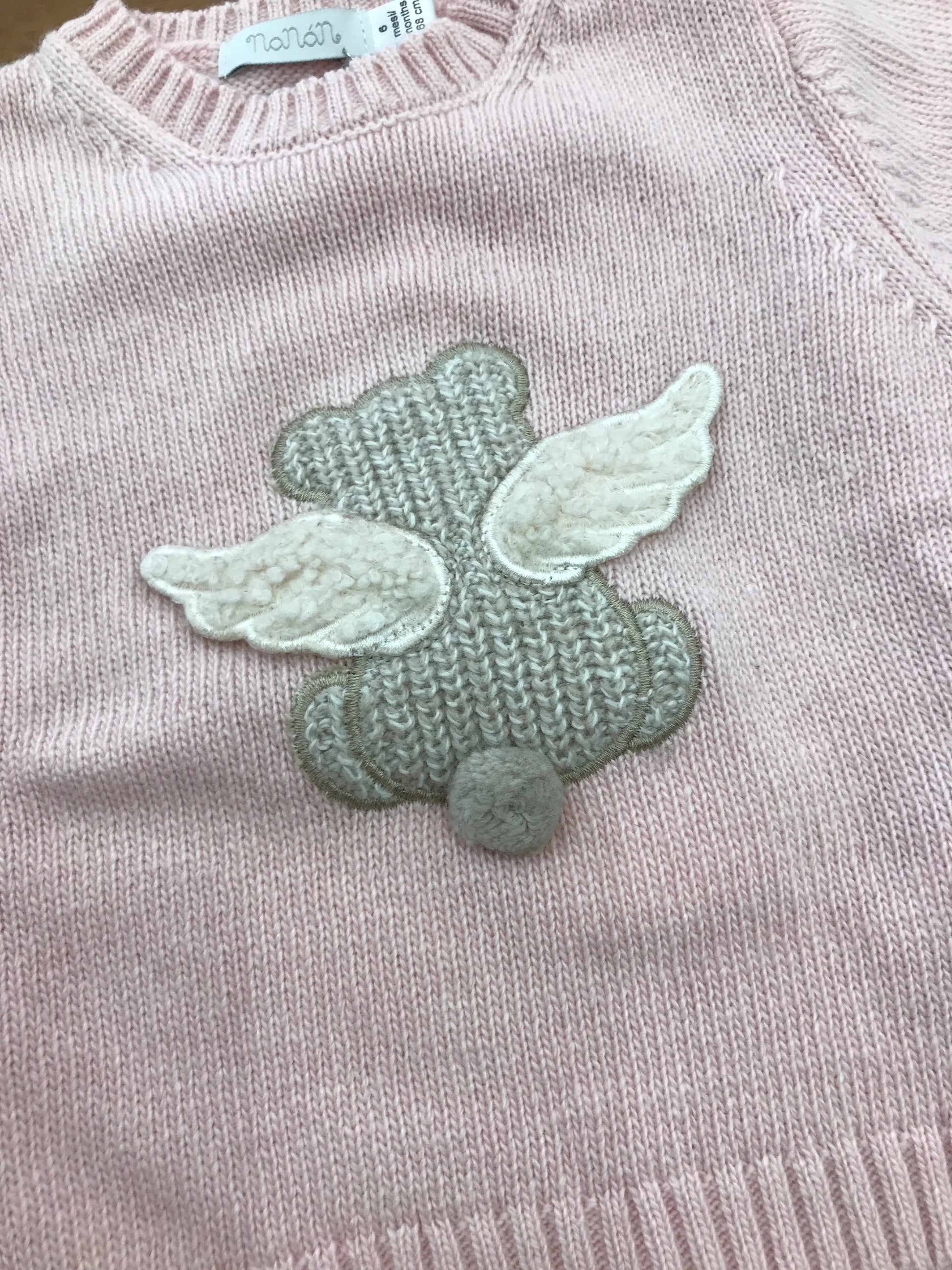 Maglione rosa in lana, decorato con un orsetto tridimensionale dotato di ali, completo di bottoncini laterali posti sulla spalla per una comoda vestibilità.
