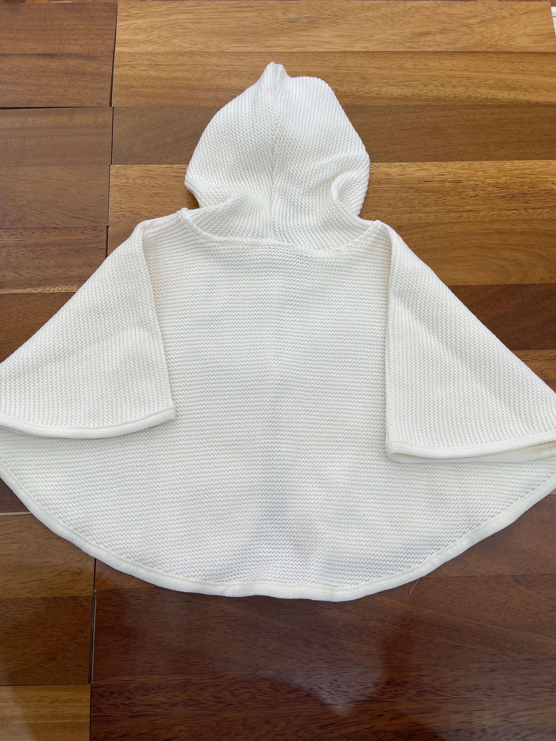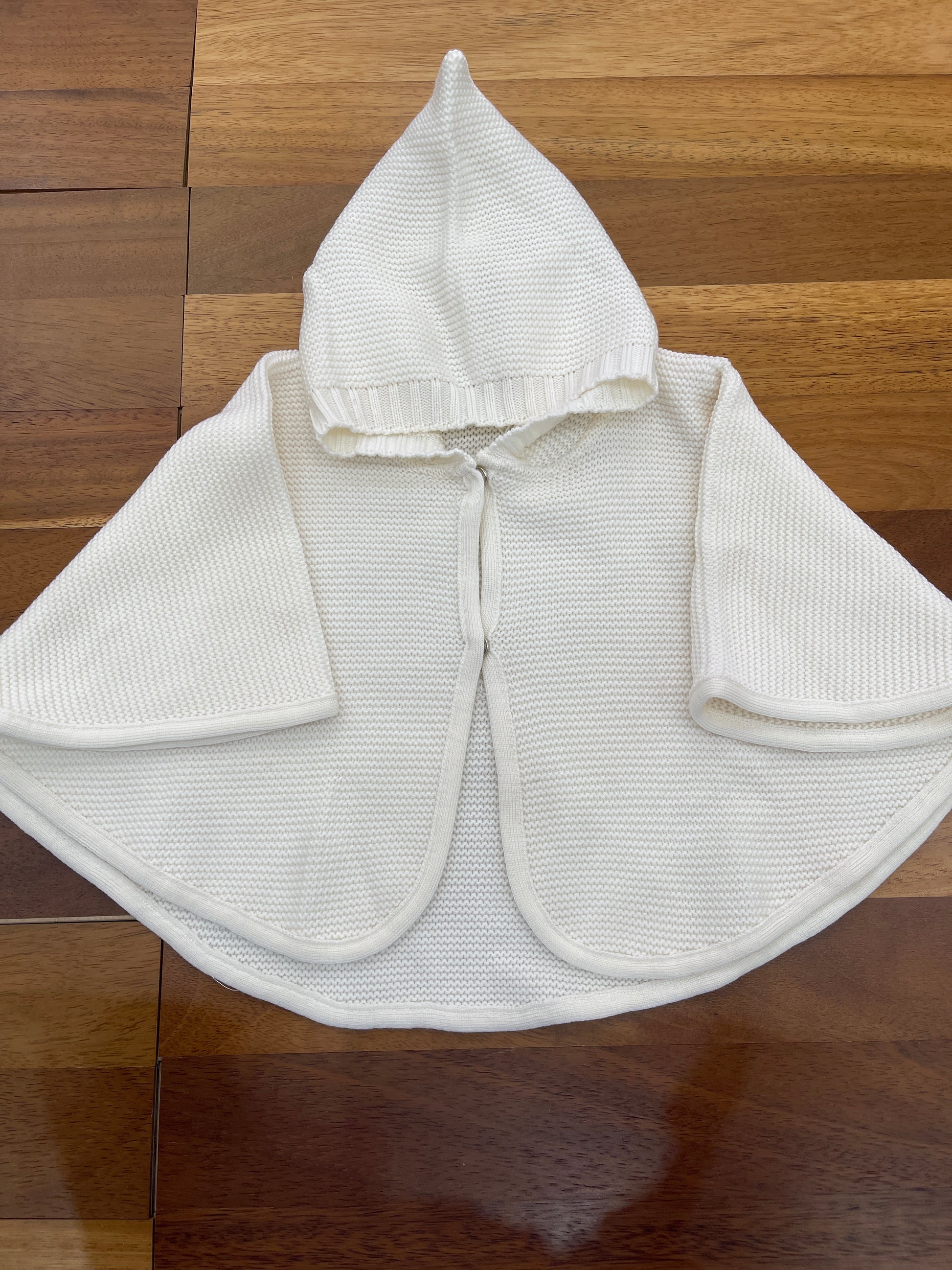 Mantella realizzata in pura lana di colore panna, dotata di cappuccio per garantire comfort e calore.