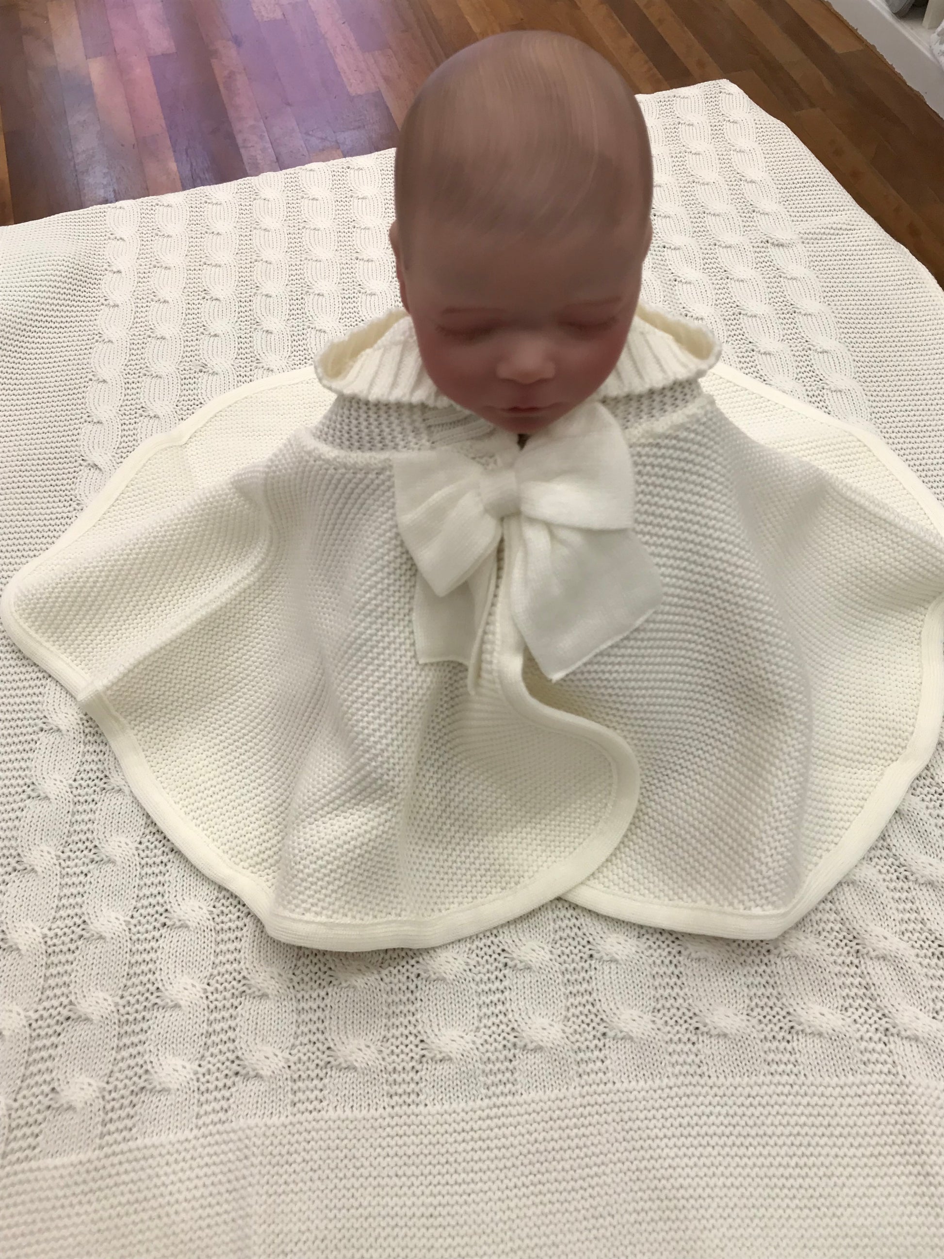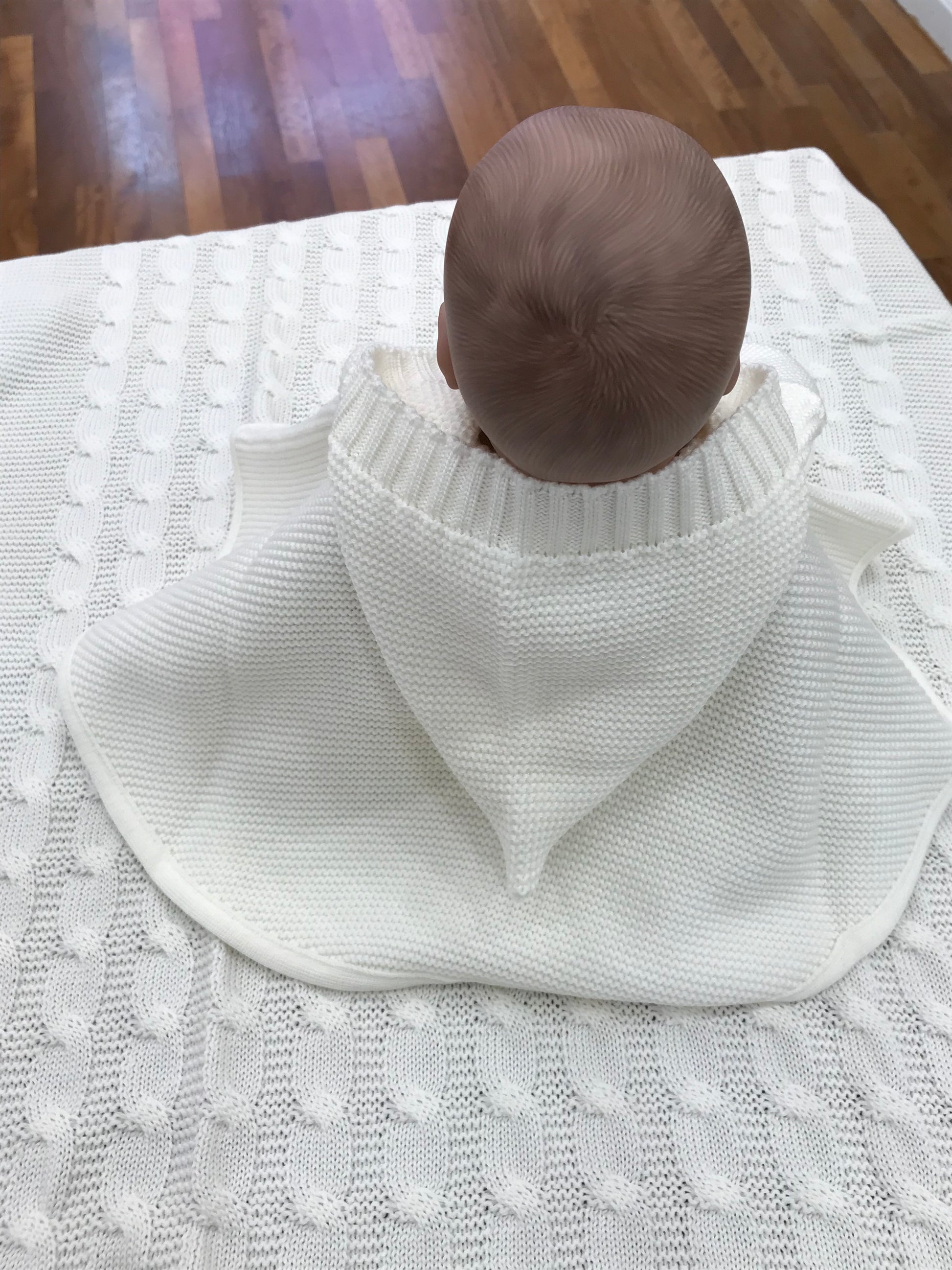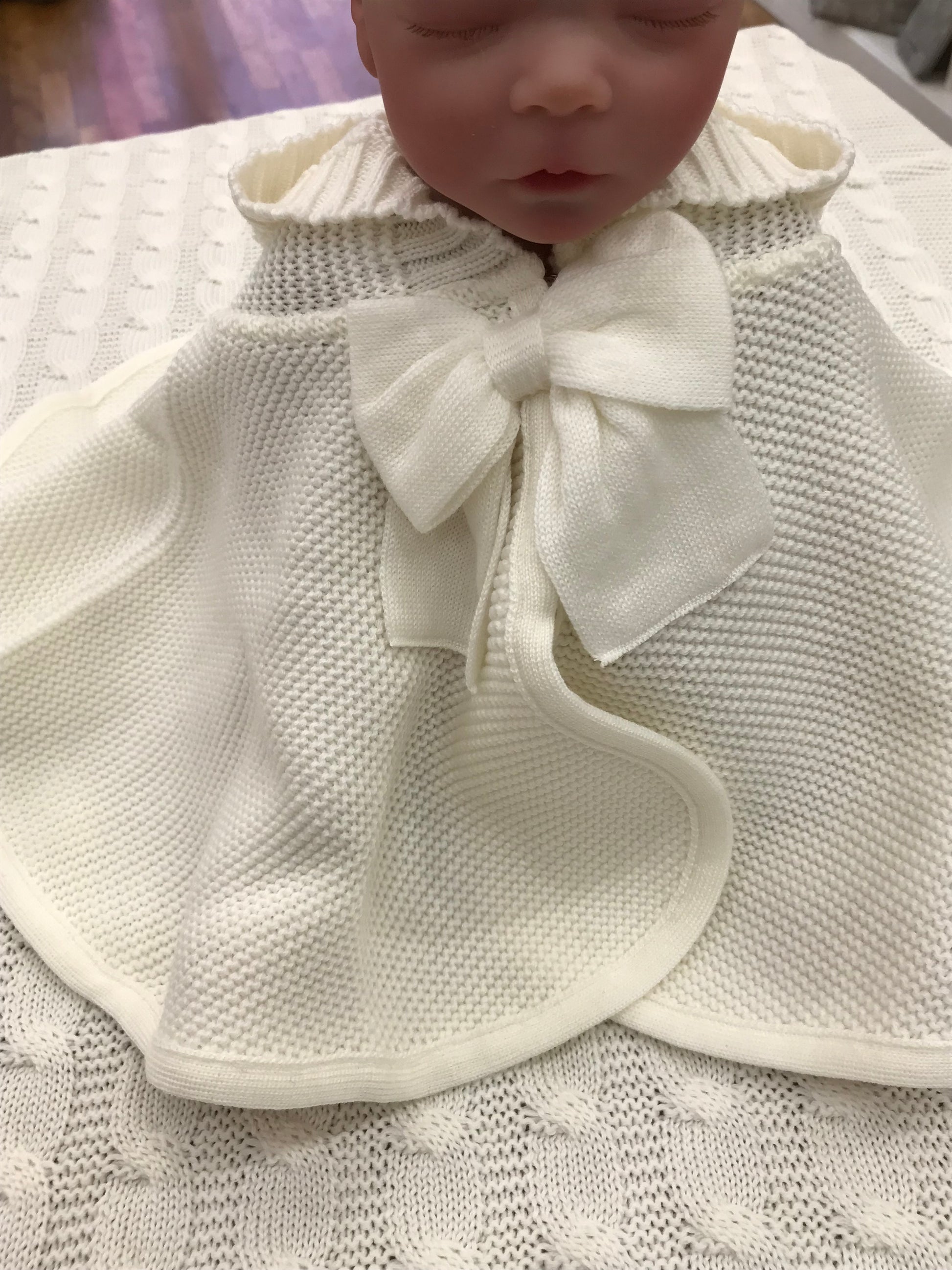 Mantella in lana color panna con chiusura a bottoncini, decorata da un fiocco applicato sul primo bottone e dotata di cappuccio per una maggiore protezione.