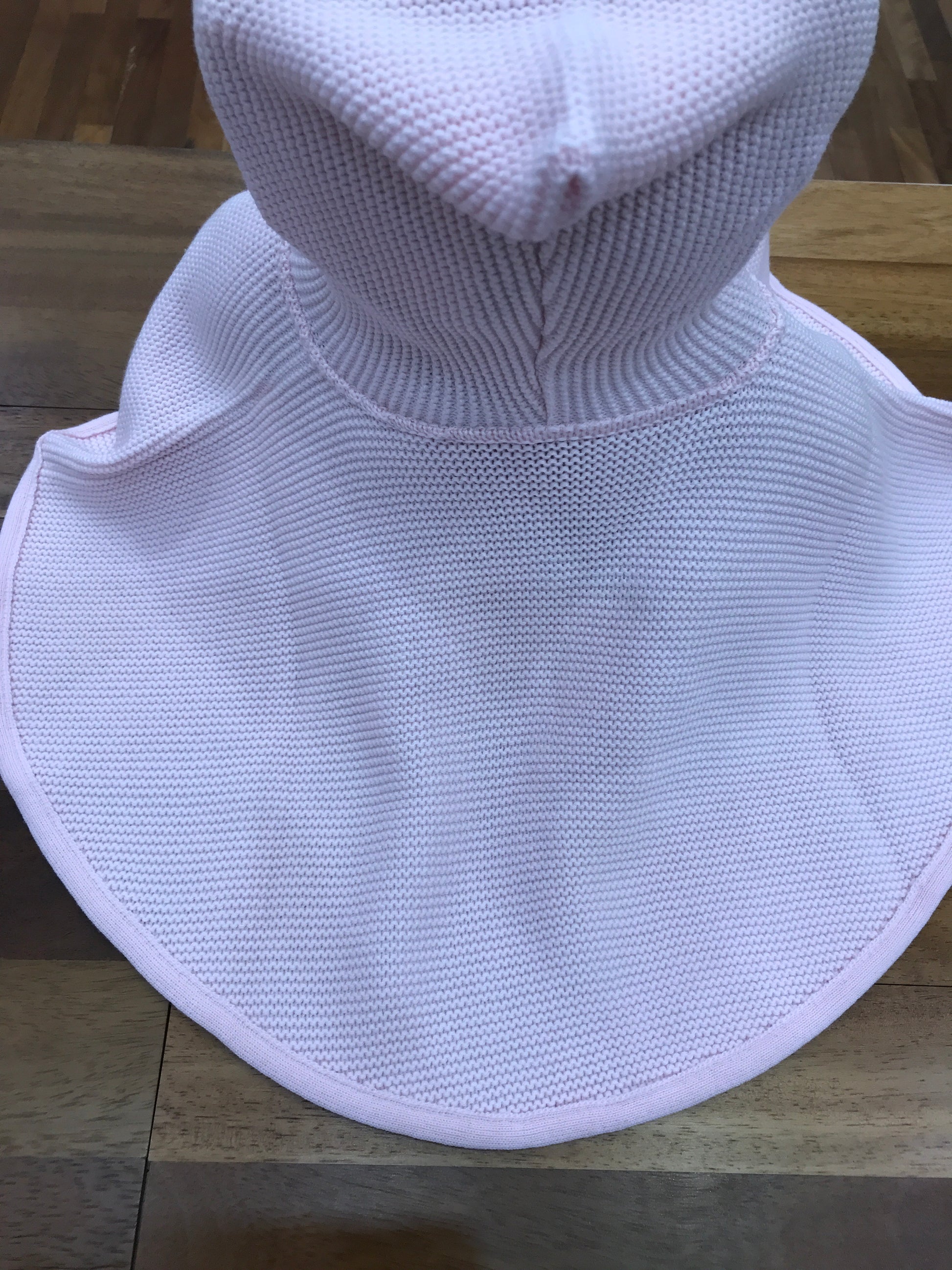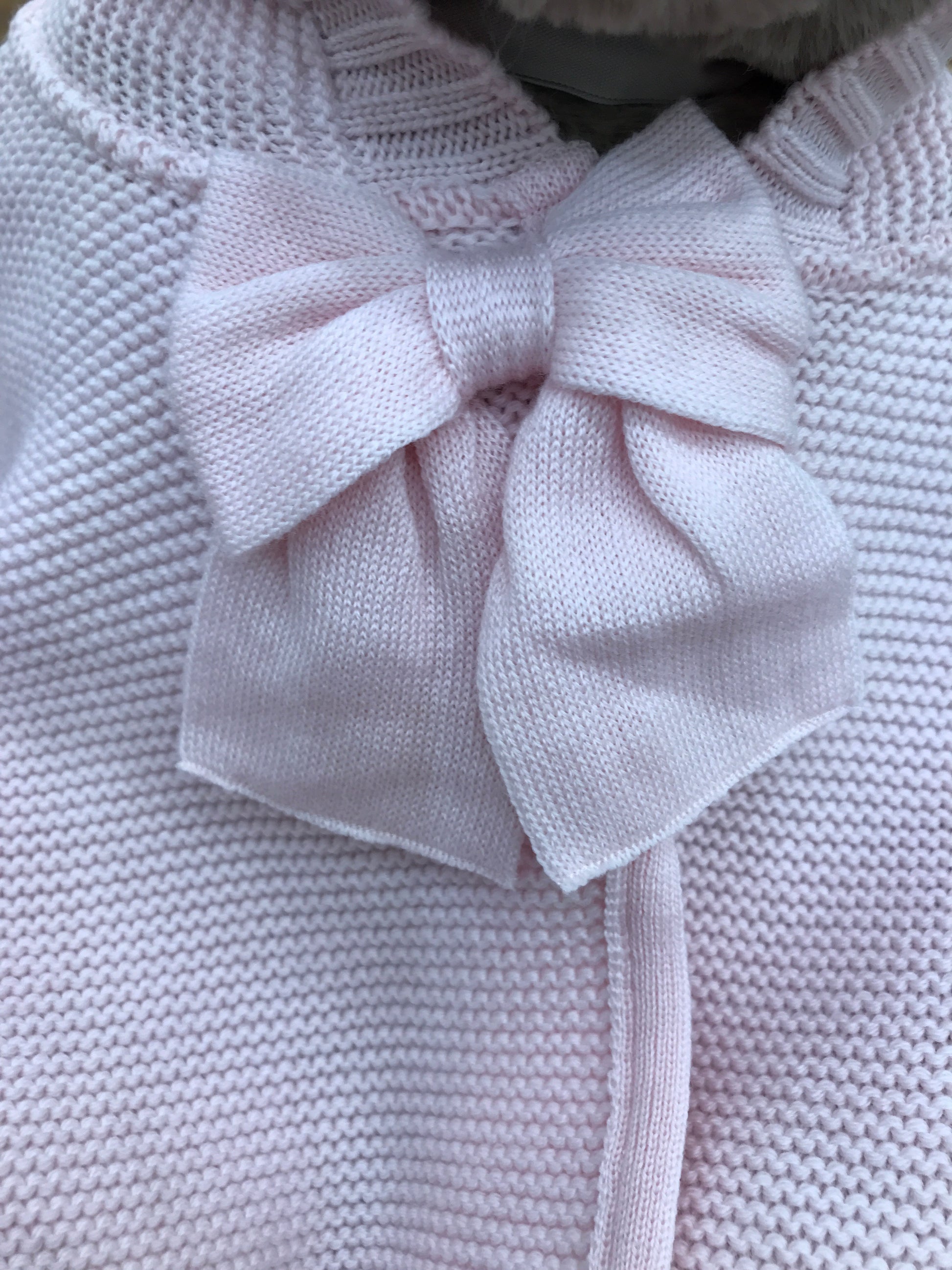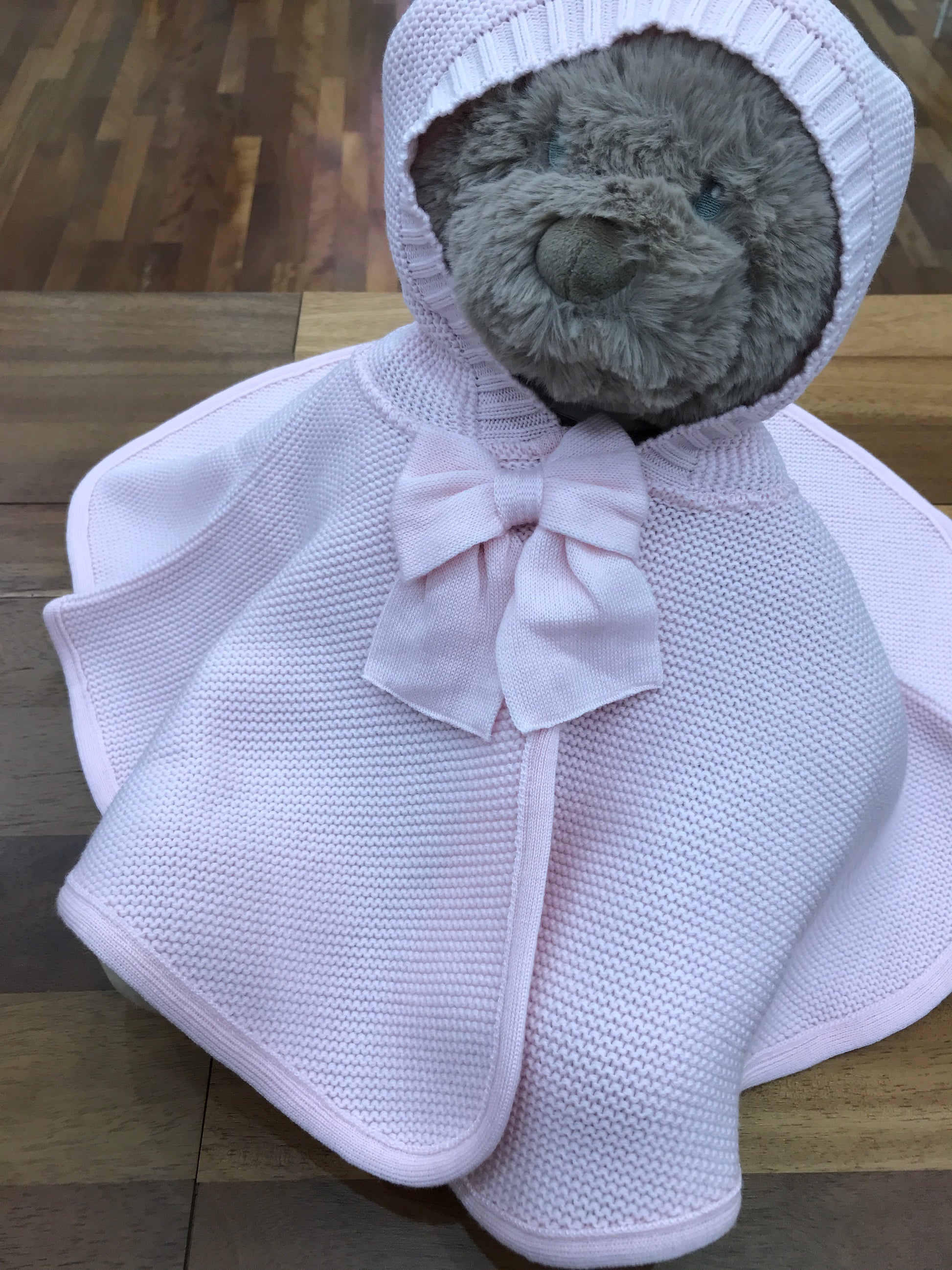 Mantella in lana color panna con chiusura a bottoncini, decorata da un fiocco applicato sul primo bottone e dotata di cappuccio per una maggiore protezione.
