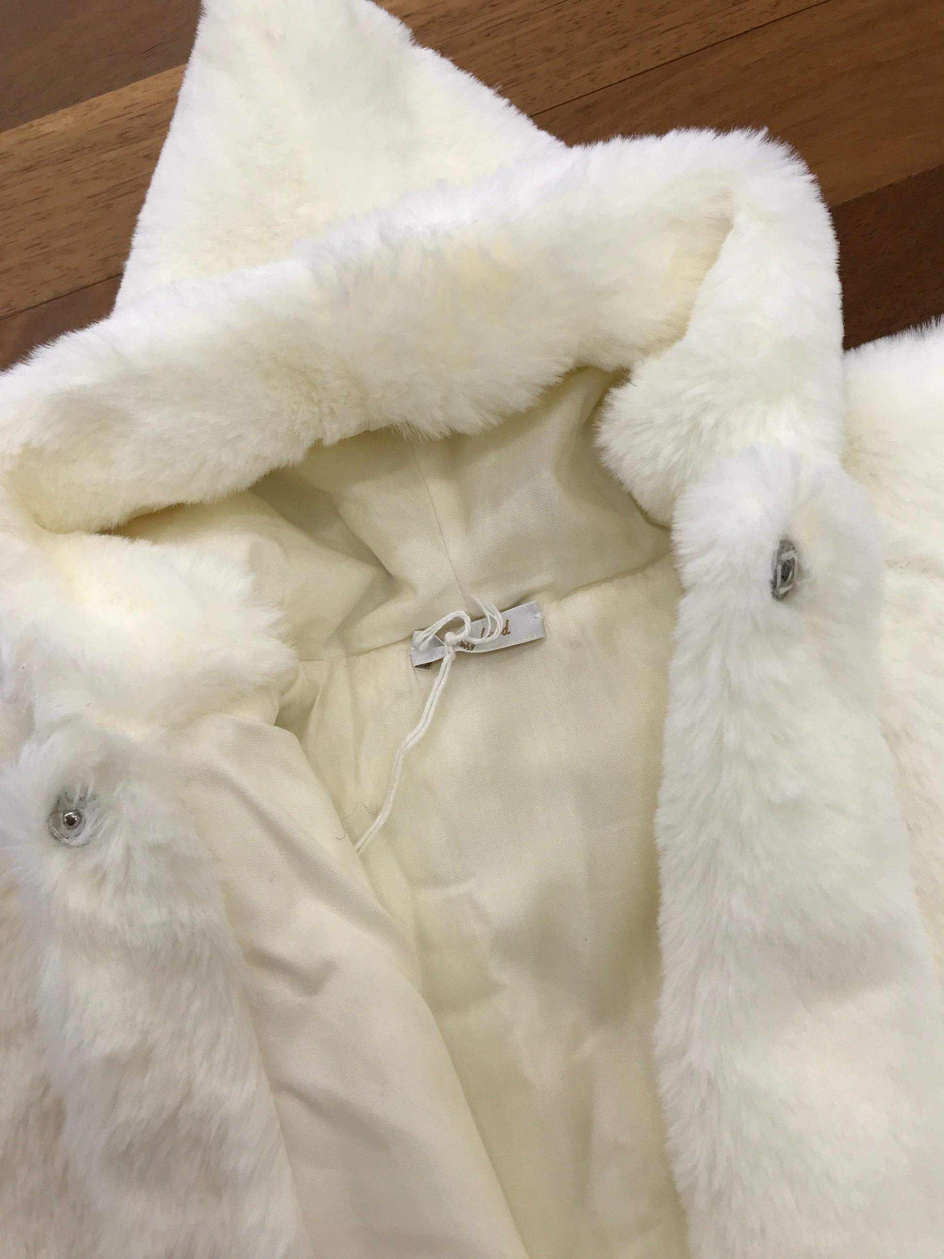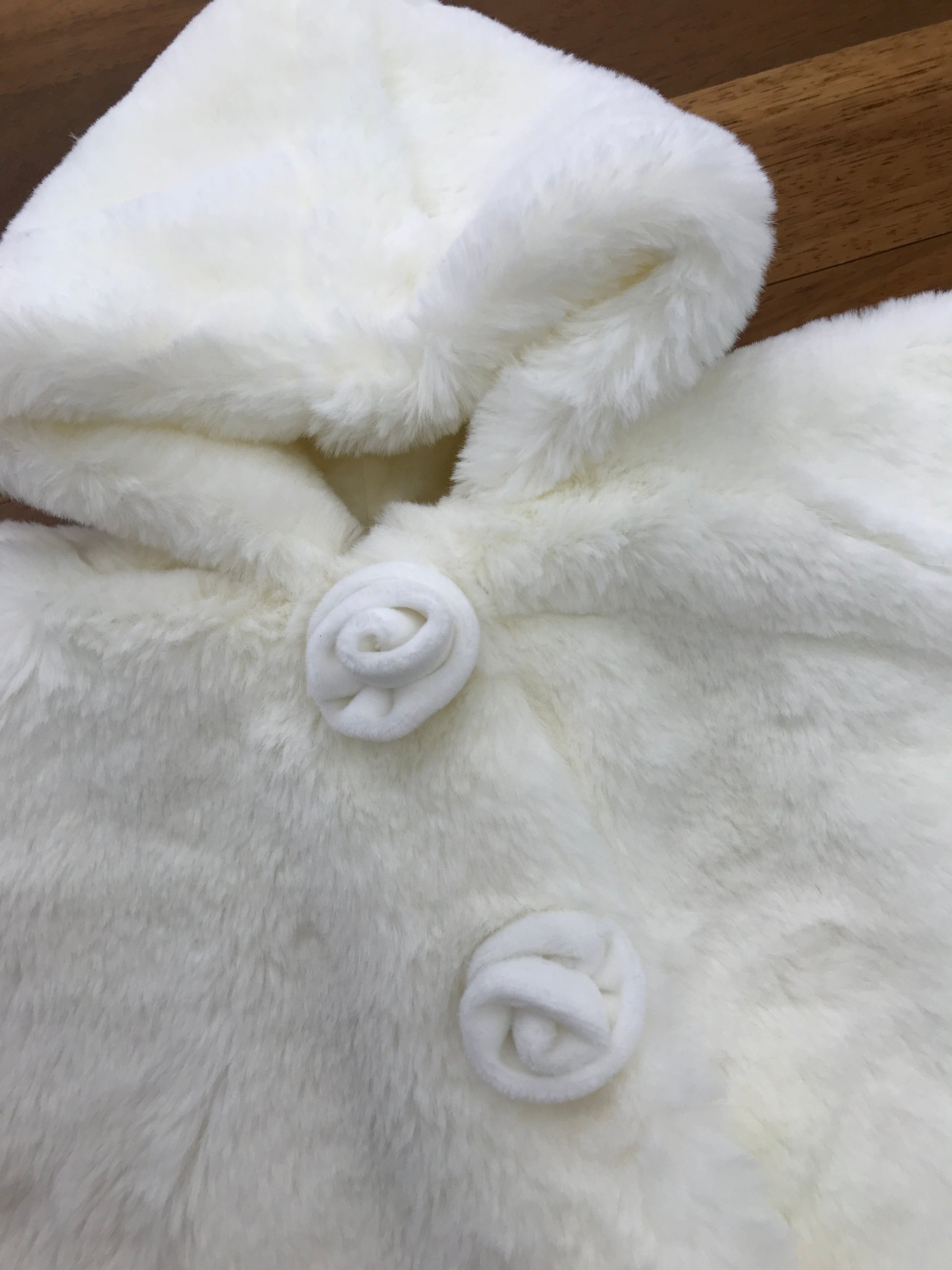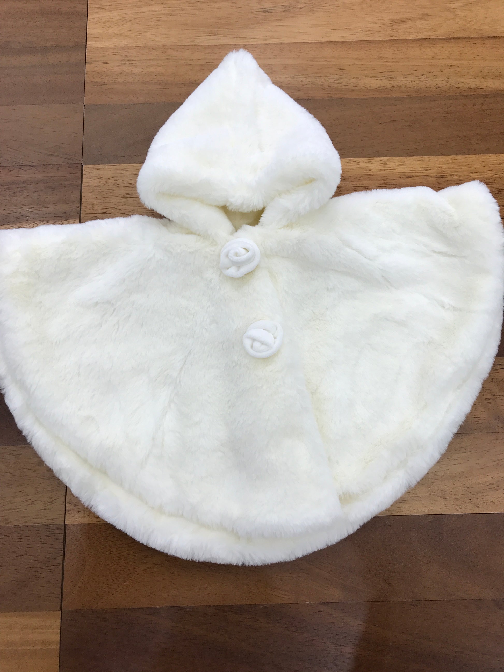 Mantella in pelliccia con cappuccio, morbida al tatto, arricchita da roselline in velluto applicate sui piccoli bottoncini frontali che permettono di chiuderla, il tutto nella raffinata tonalità panna.