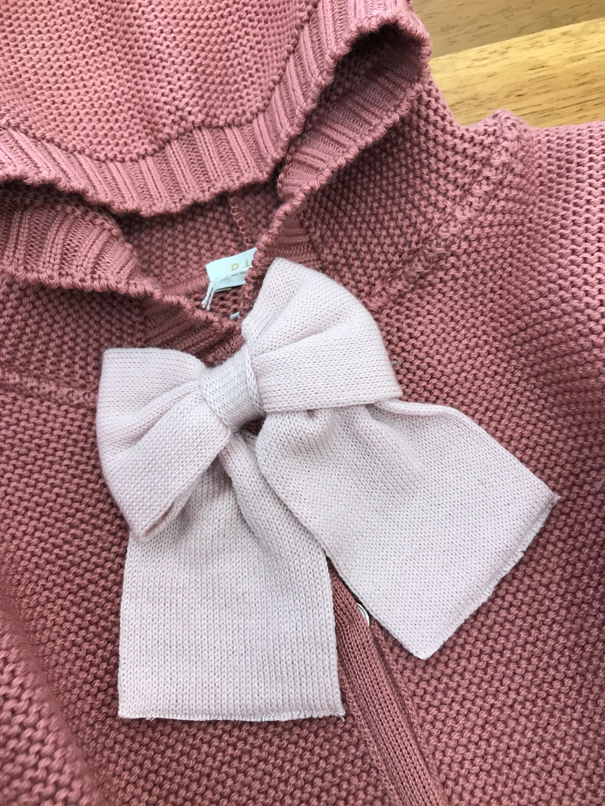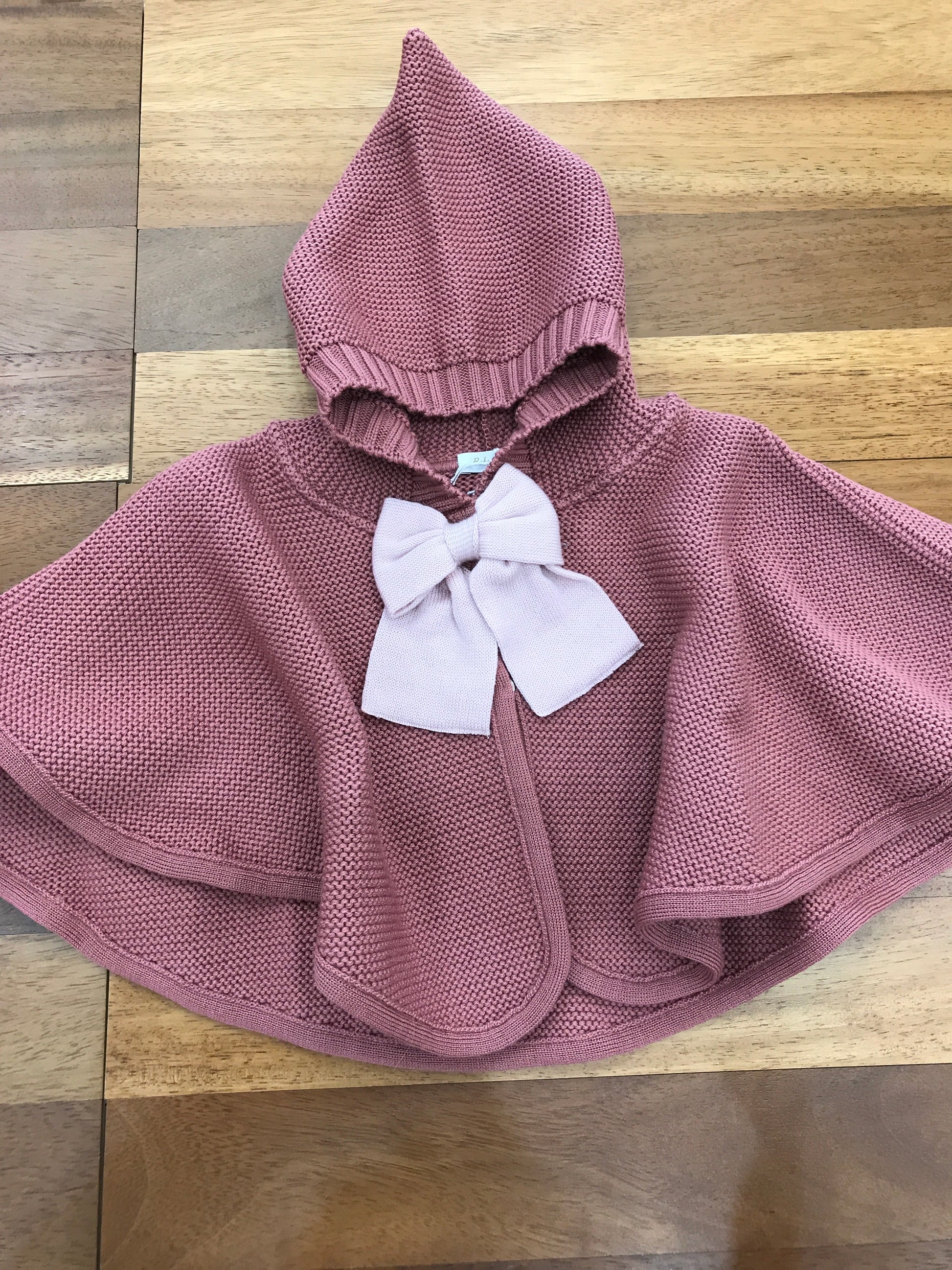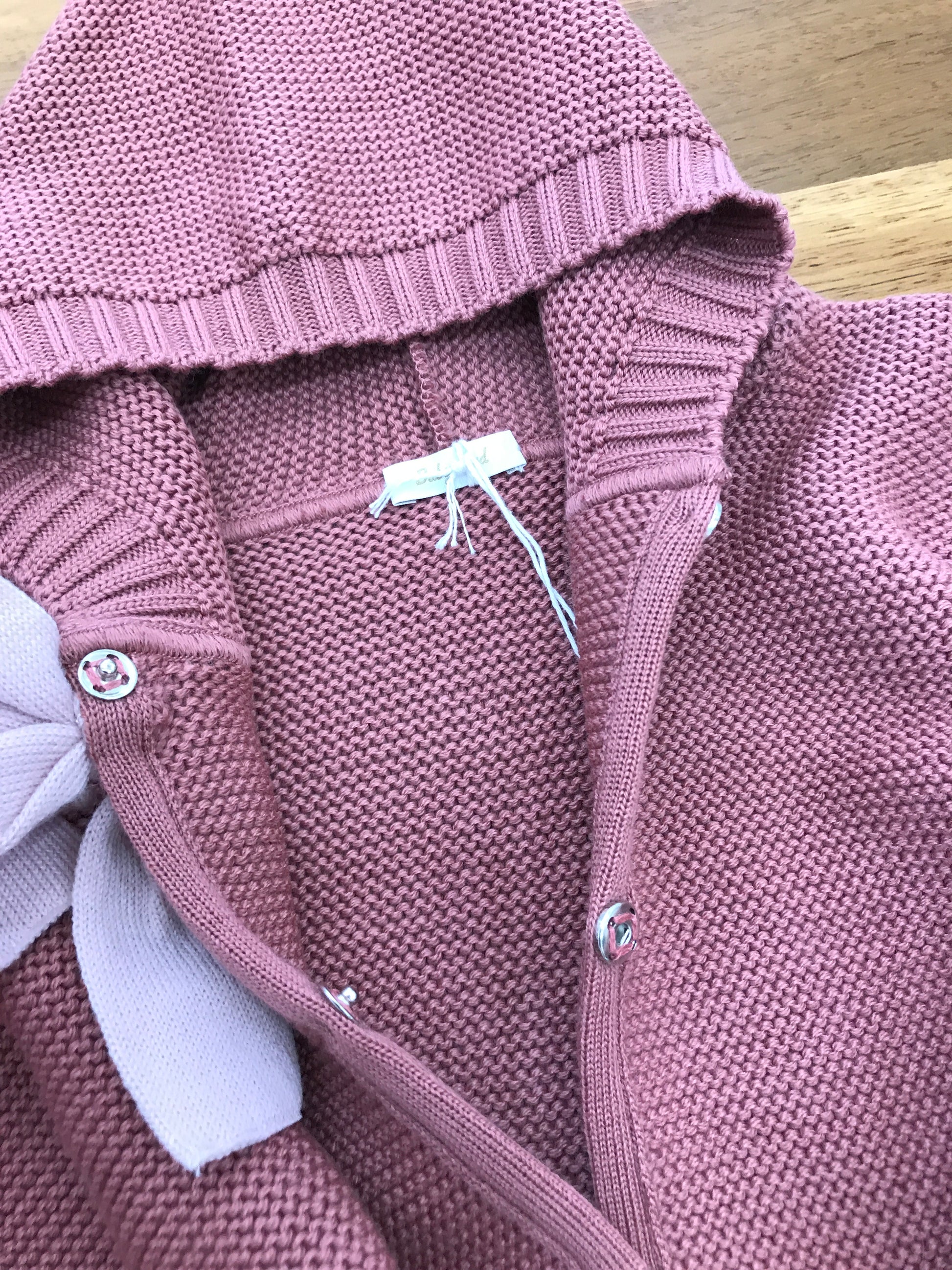 Mantella realizzata in pura lana di colore rosa antico, arricchita da un fiocco rosa applicato sui bottoncini frontali, dotata di cappuccio per garantire comfort e calore.