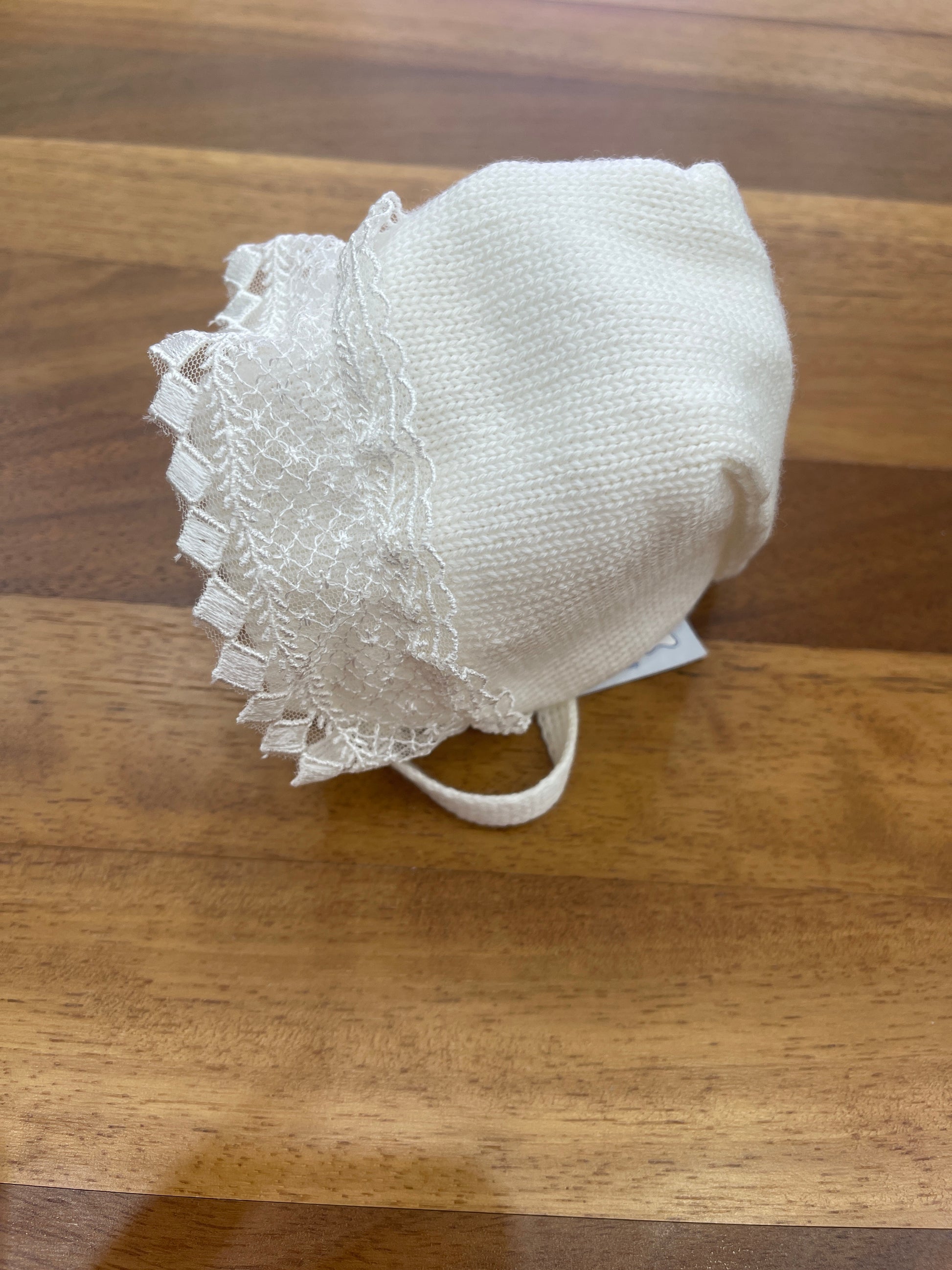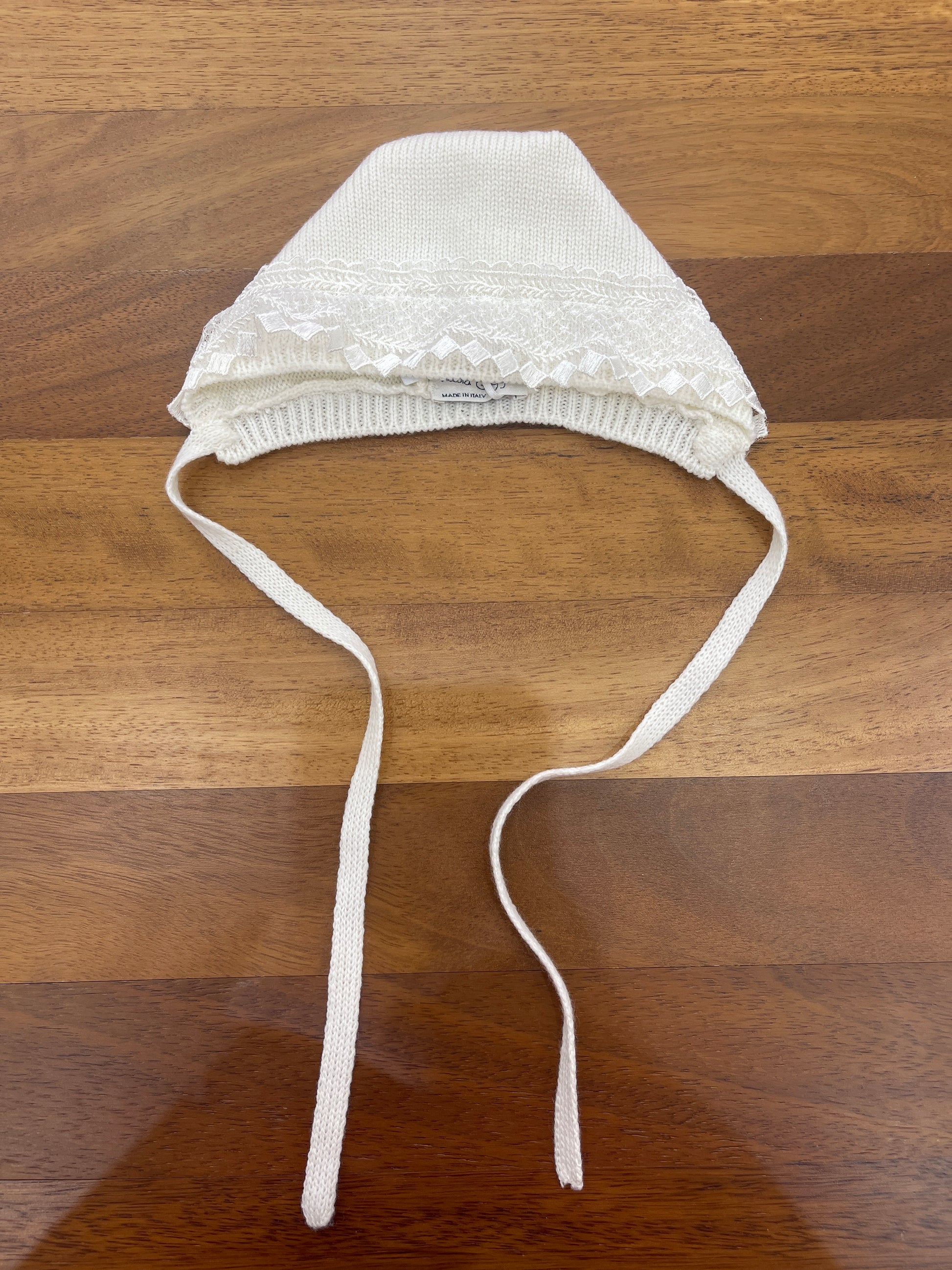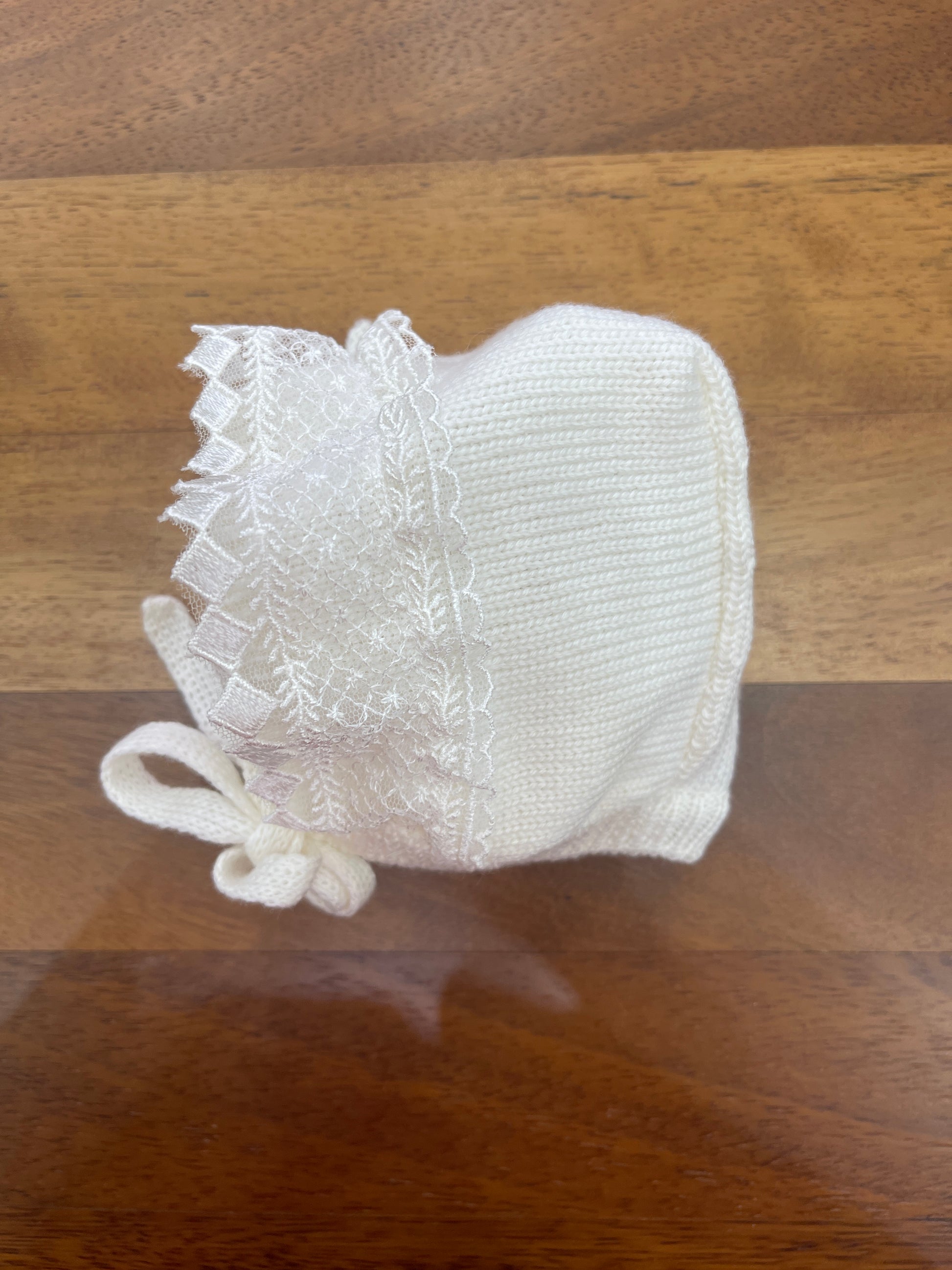 Cuffia in lana color avorio arricchita da un raffinato inserto di merletto frontale.