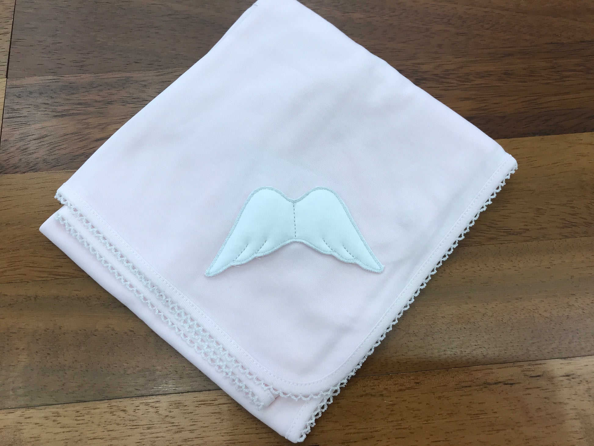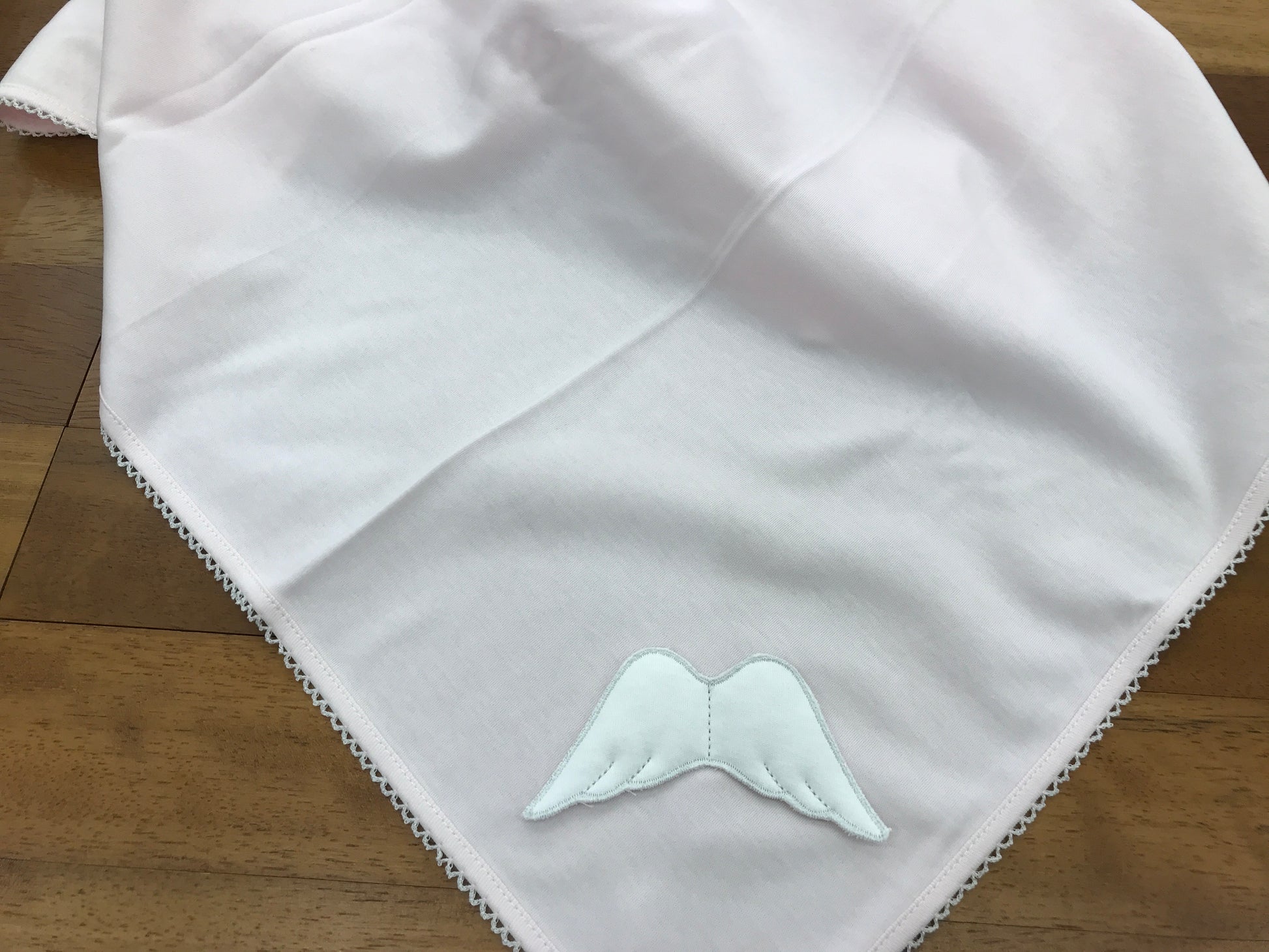 Realizzata in mussola di cotone rosa, questa stoffa presenta un bordo smerlato raffinato e un elegante dettaglio ad ala bianca posizionato in un angolo, aggiungendo un tocco delicato e sofisticato al tessuto.