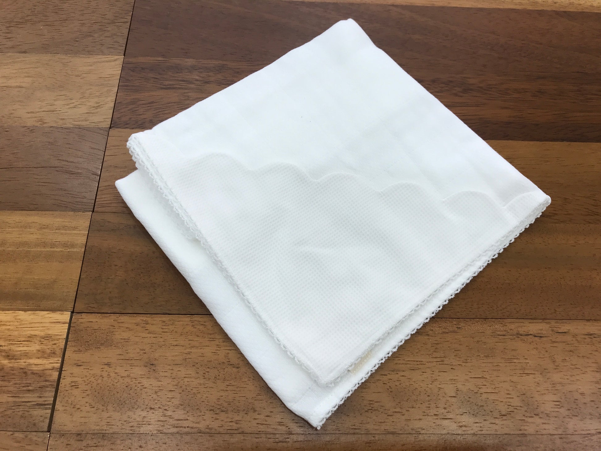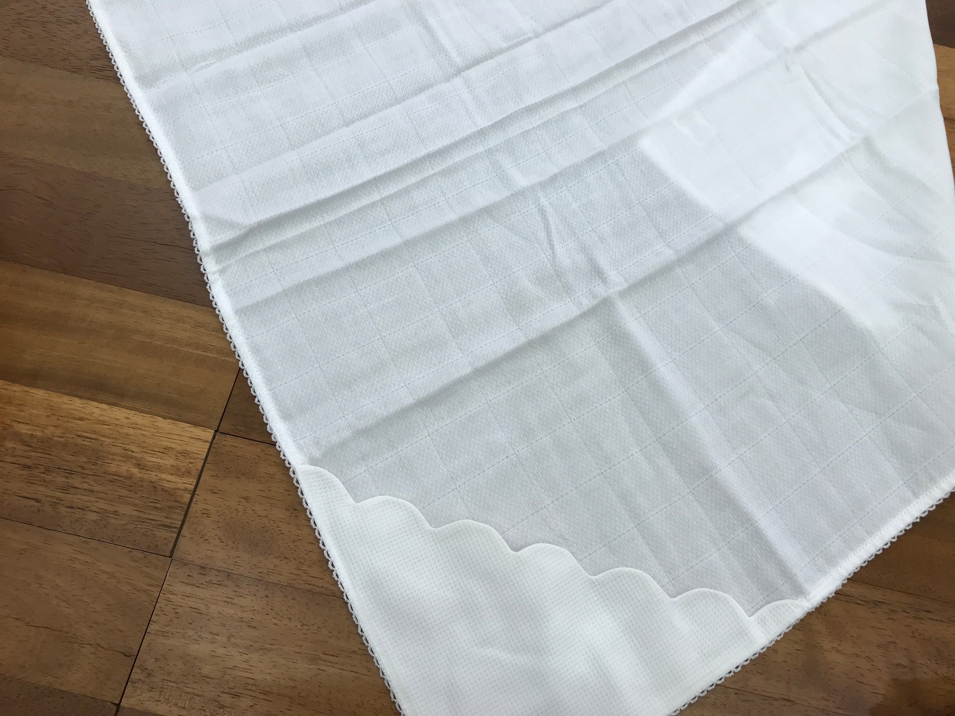 Questa mussola realizzata in garza bianca è arricchita da un raffinato dettaglio angolare smerlato, che aggiunge un tocco di eleganza e raffinatezza al tessuto leggero e traspirante, ideale per garantire comfort e delicatezza sulla pelle del bambino.