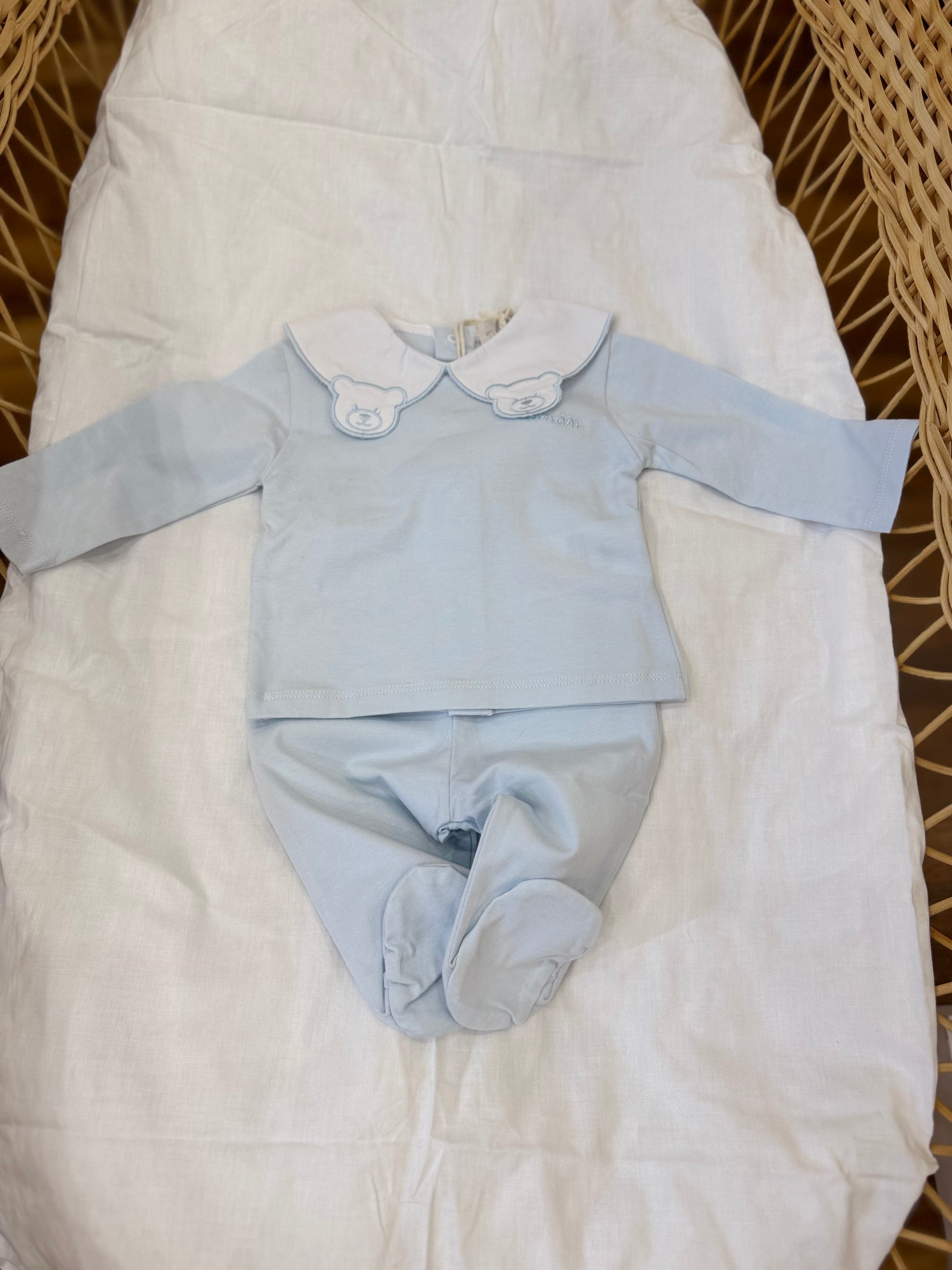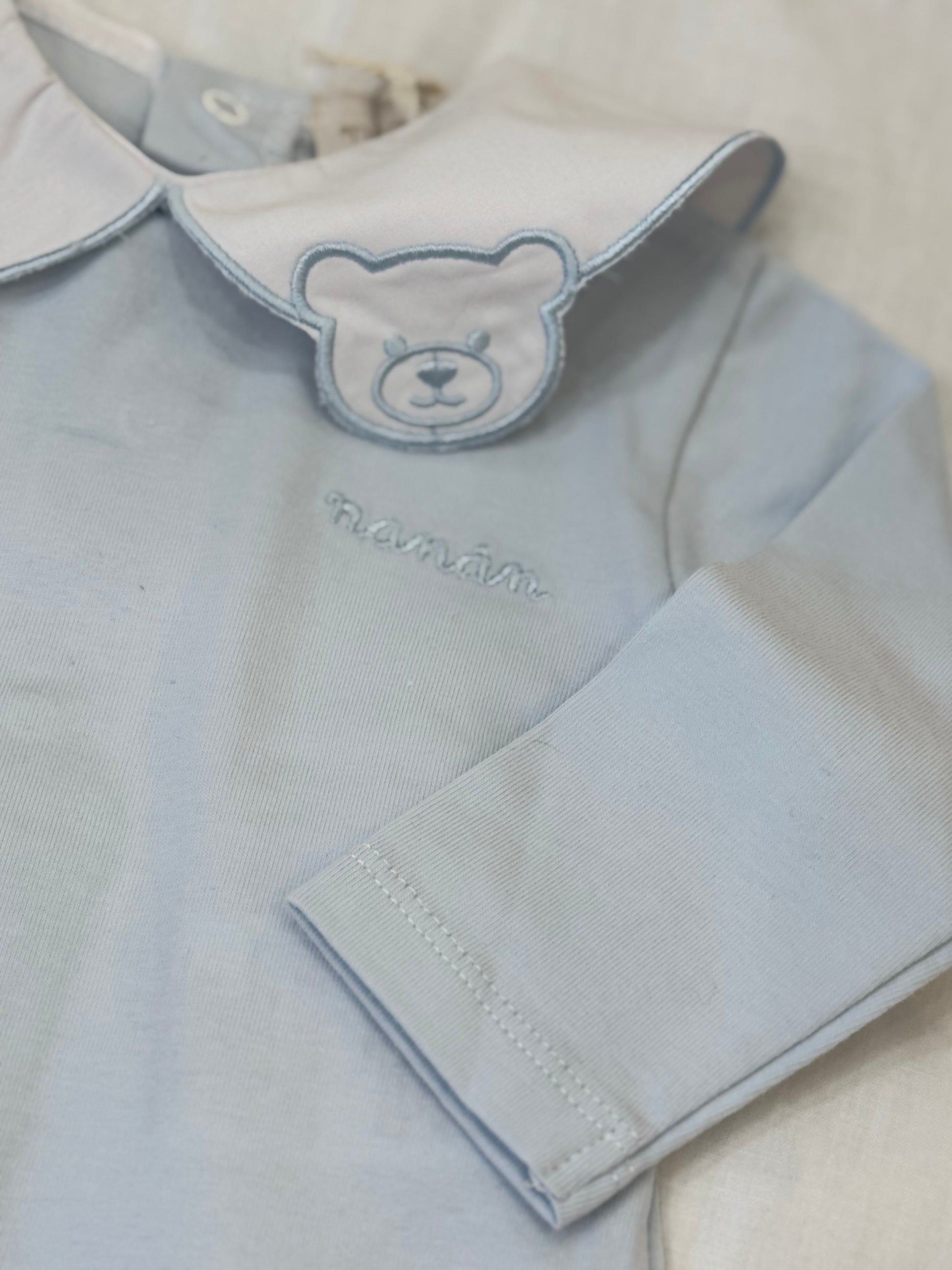 Questo delizioso completino firmato Nanan è realizzato in puro cotone e provvisto di piedini, il che lo rende perfetto anche per l'utilizzo in clinica. Il suo design è impreziosito da un colletto a forma di orsetto, che lo rende ancora più adorabile. Confortevole e pratico, è ideale per coccolare il tuo piccolo con stile.