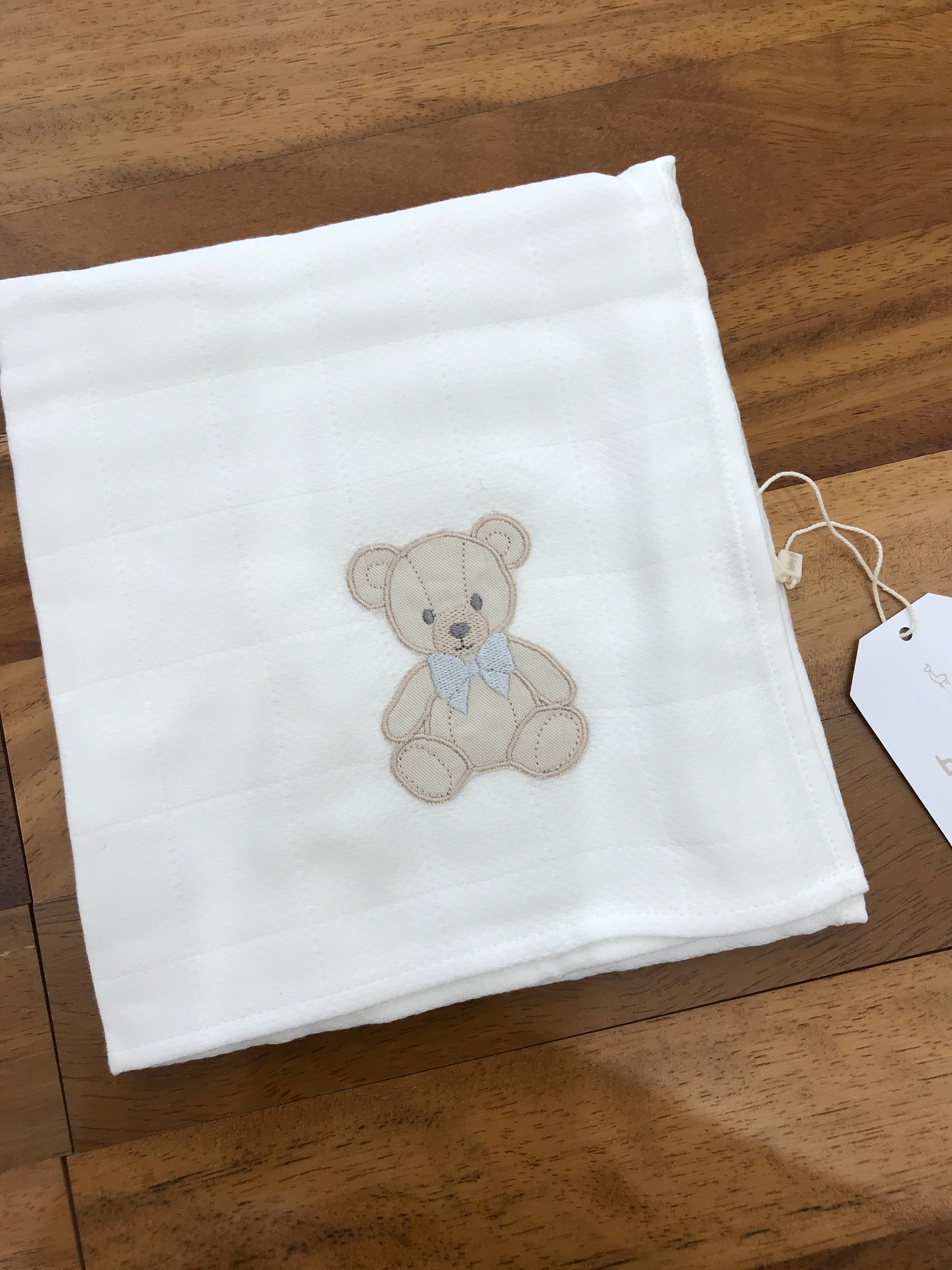 Garza di mussola finemente lavorata con un delicato motivo decorativo a orsetto.