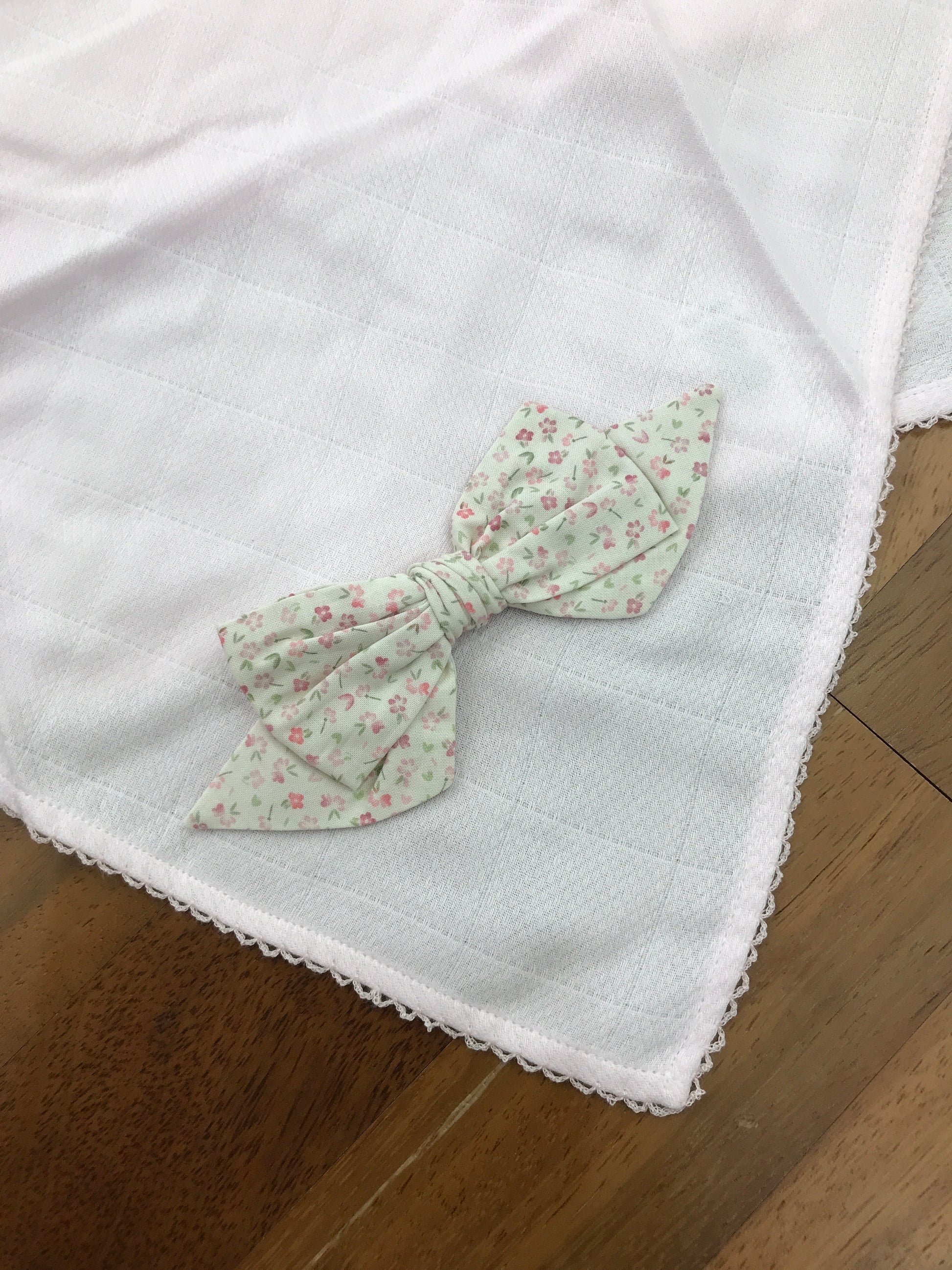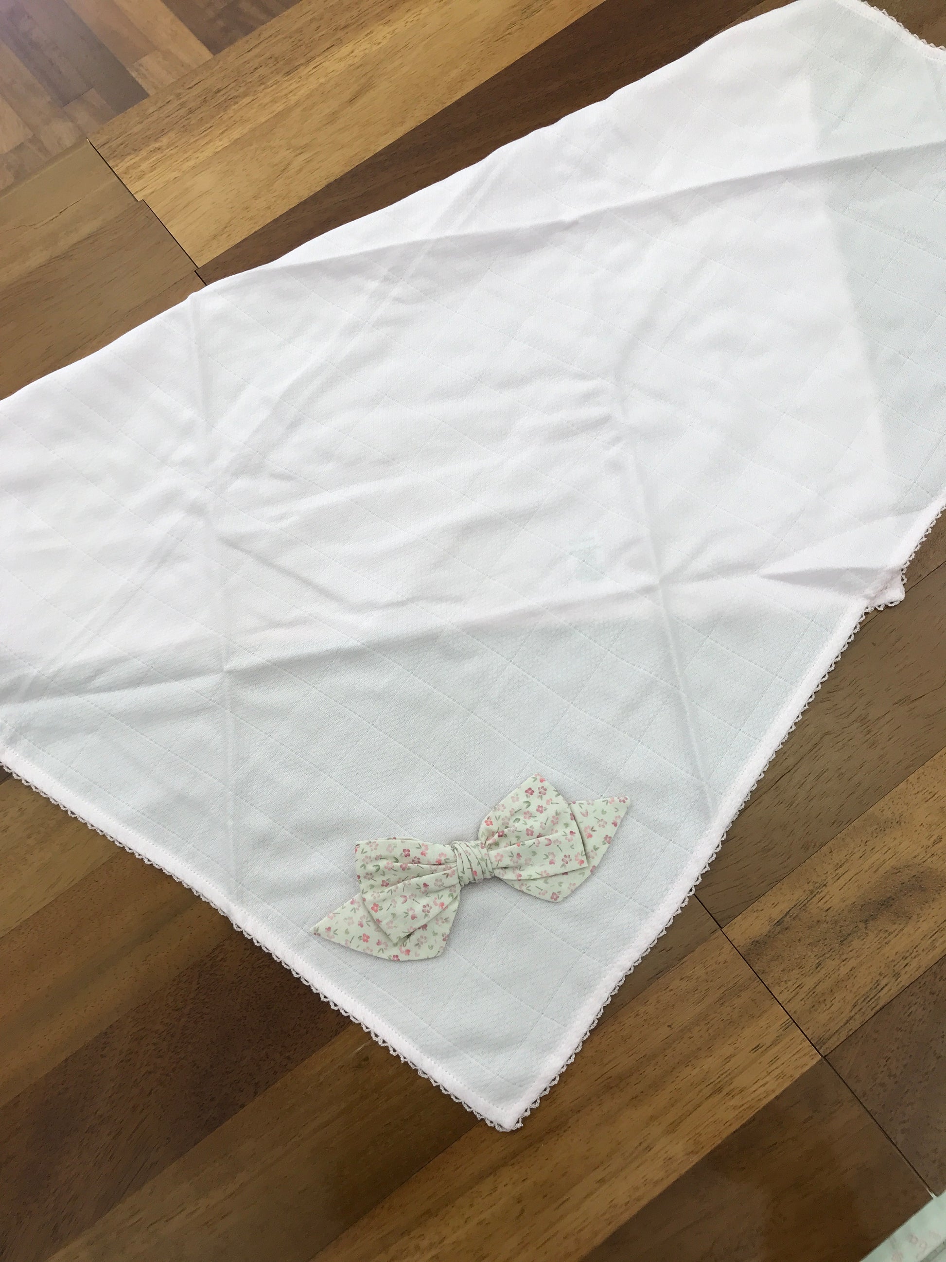 Questa mussola presenta un bordo smerlato finemente lavorato e, in uno degli angoli, è impreziosita da un elegante fiocco in rilievo decorato con delicati motivi floreali, che aggiungono un tocco di raffinatezza e originalità al tessuto.