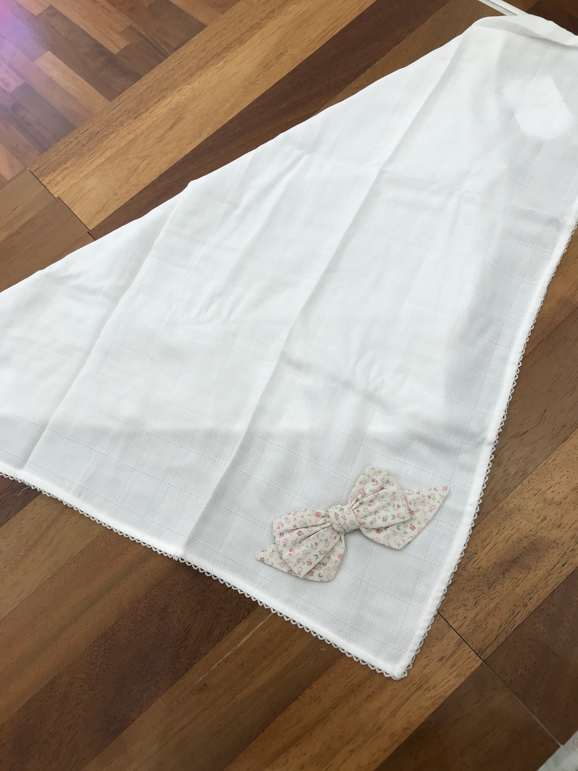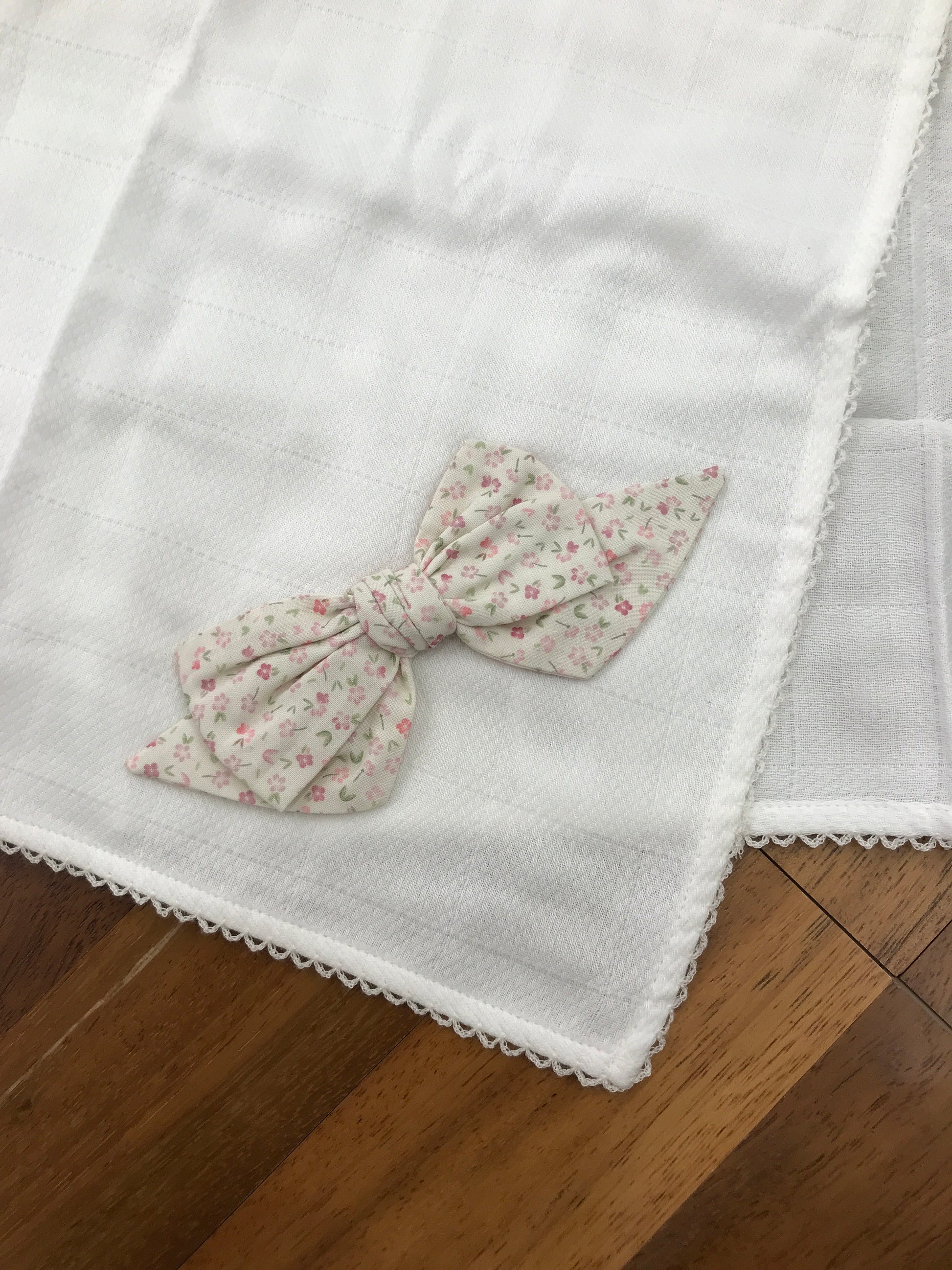 Questa mussola presenta un bordo smerlato finemente lavorato e, in uno degli angoli, è impreziosita da un elegante fiocco in rilievo decorato con delicati motivi floreali, che aggiungono un tocco di raffinatezza e originalità al tessuto.