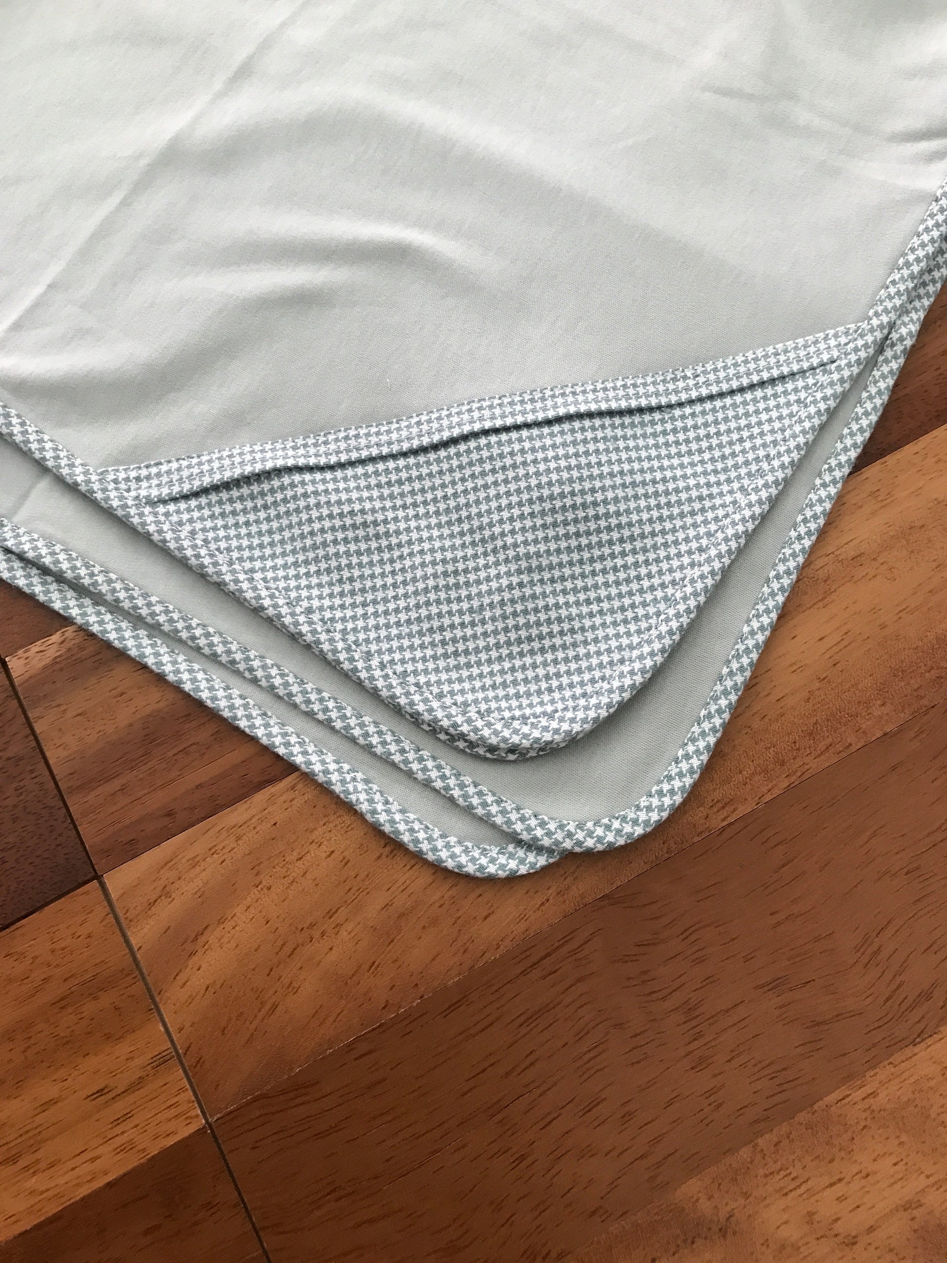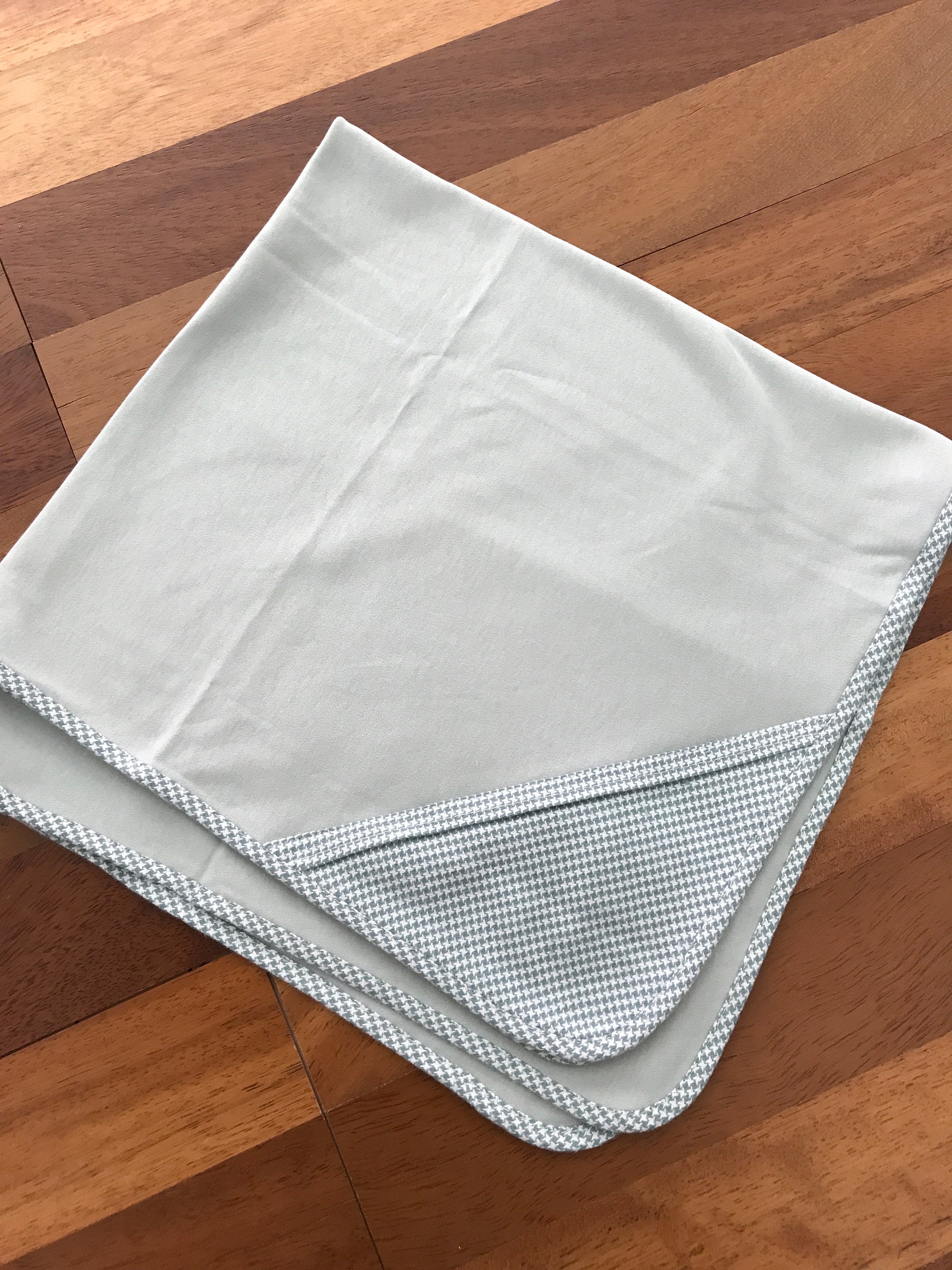 Mussola verde con bordo ornato da piccoli quadrati bianchi, caratterizzata da un angolo decorato in modo identico al bordo.