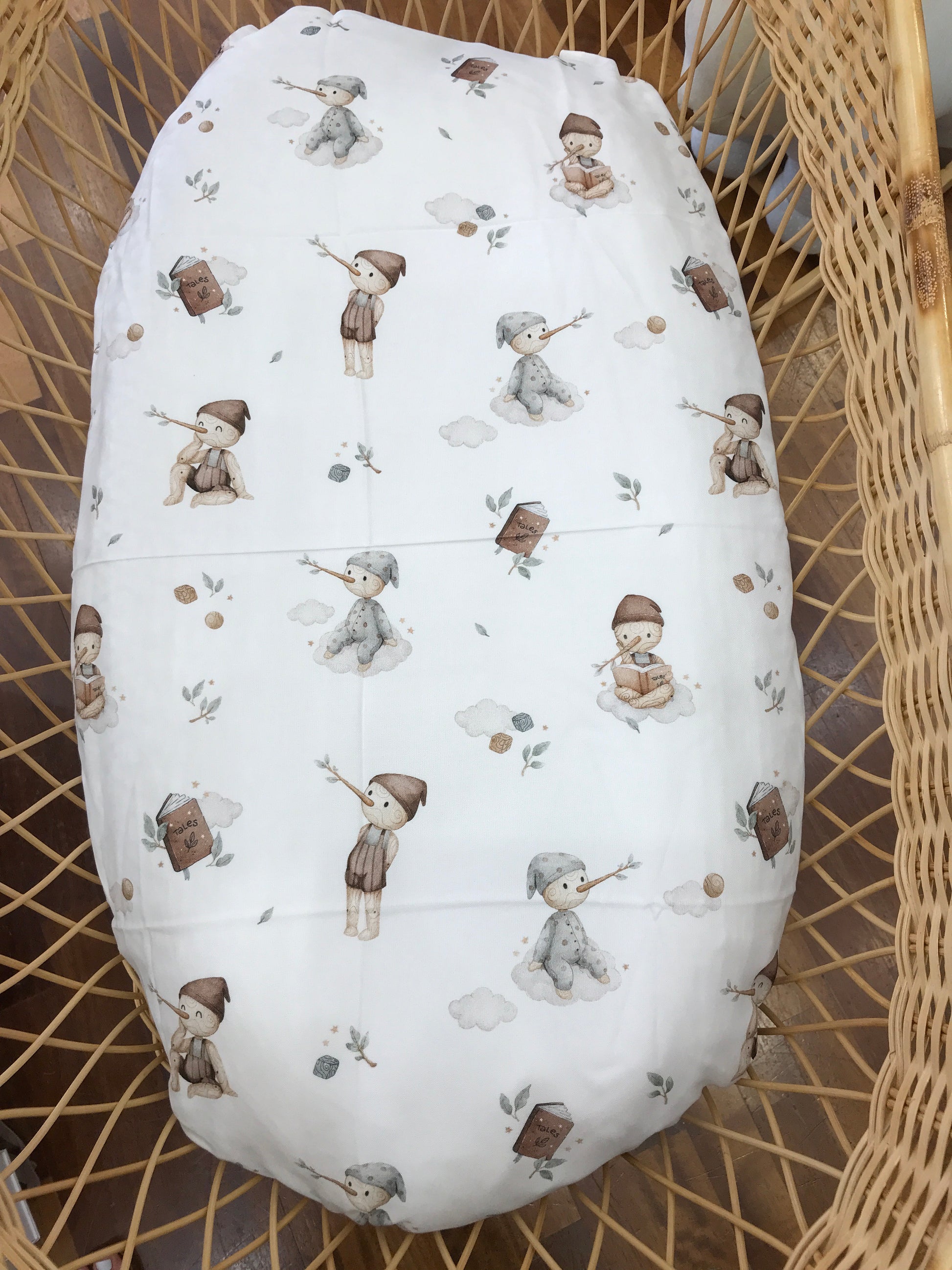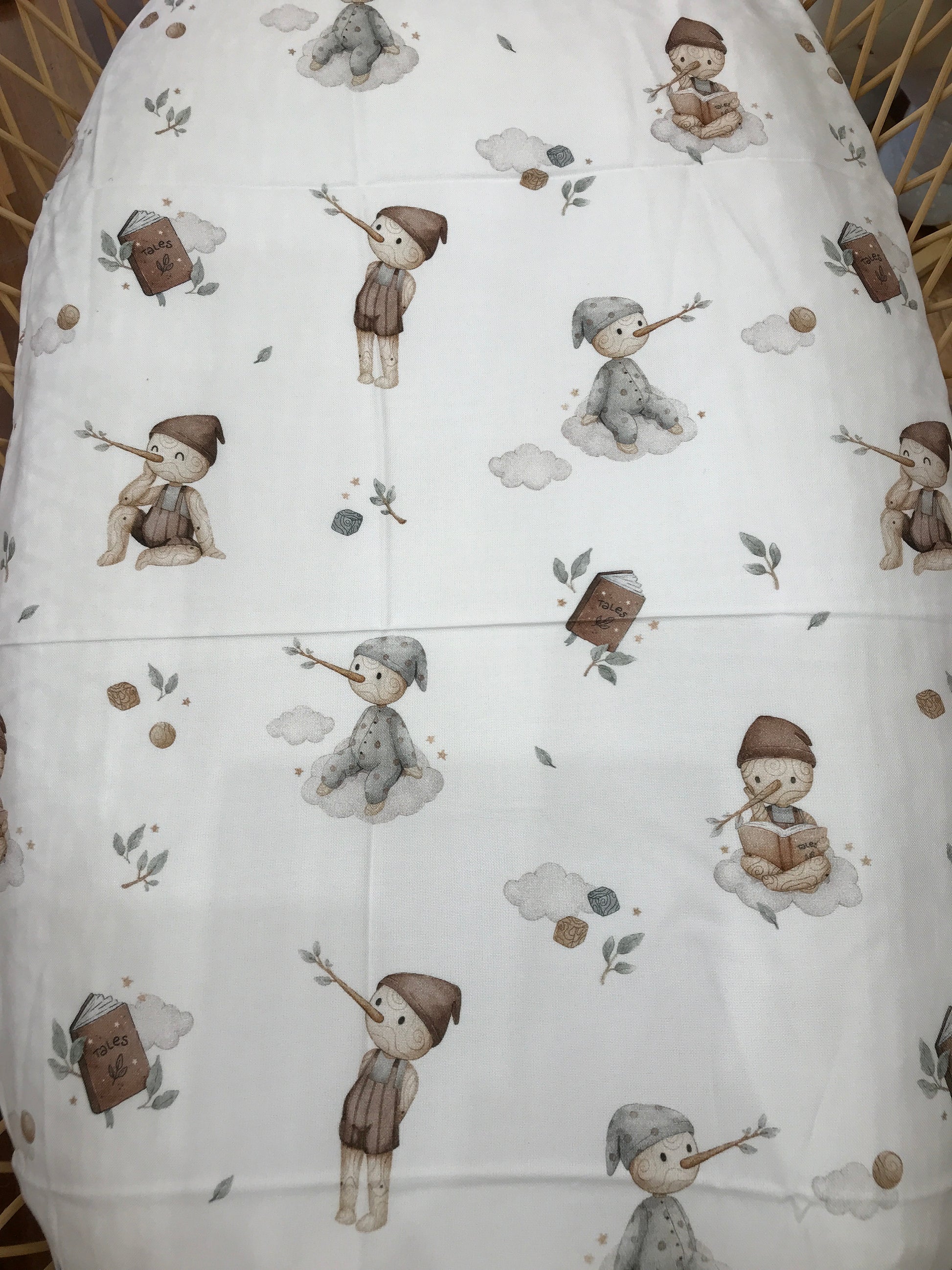 Mussola in bamboo arricchita da motivi ispirati a Pinocchio.