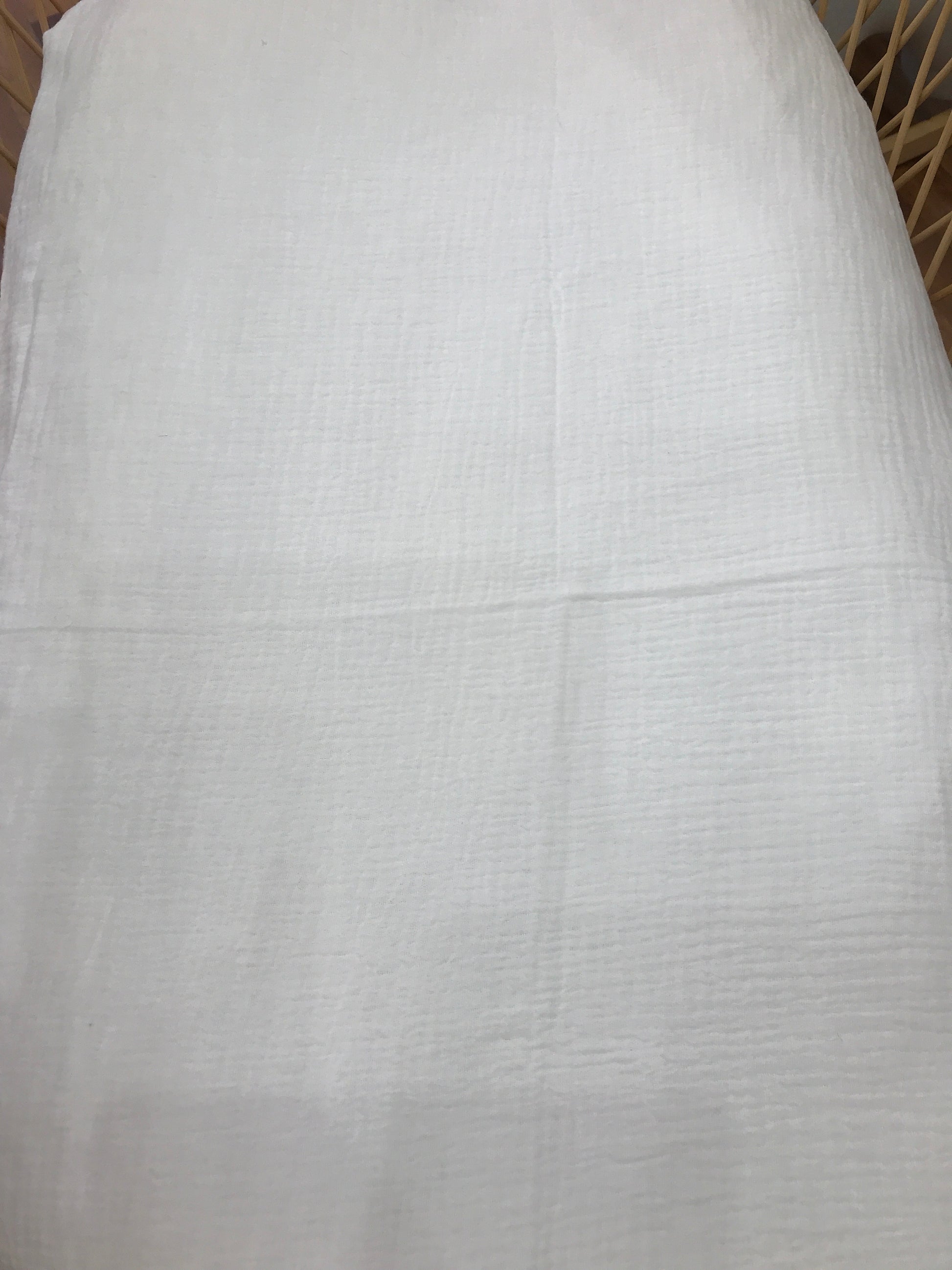 Questa mussola è realizzata in cotone di bamboo di alta qualità, offrendo una texture semplice ma raffinata. Il tessuto, di colore bianco puro, garantisce morbidezza e traspirabilità, ideale per un utilizzo delicato e confortevole.