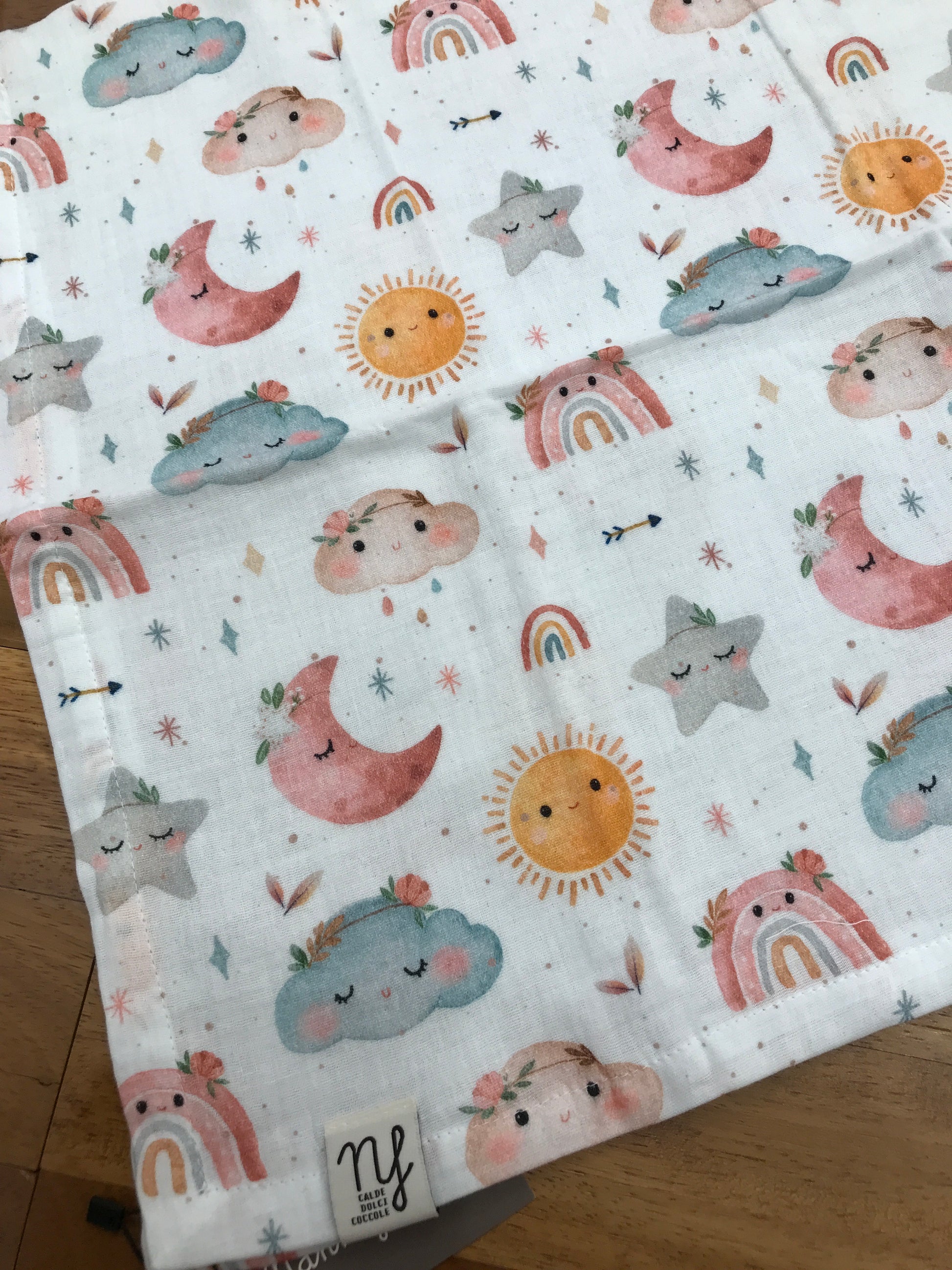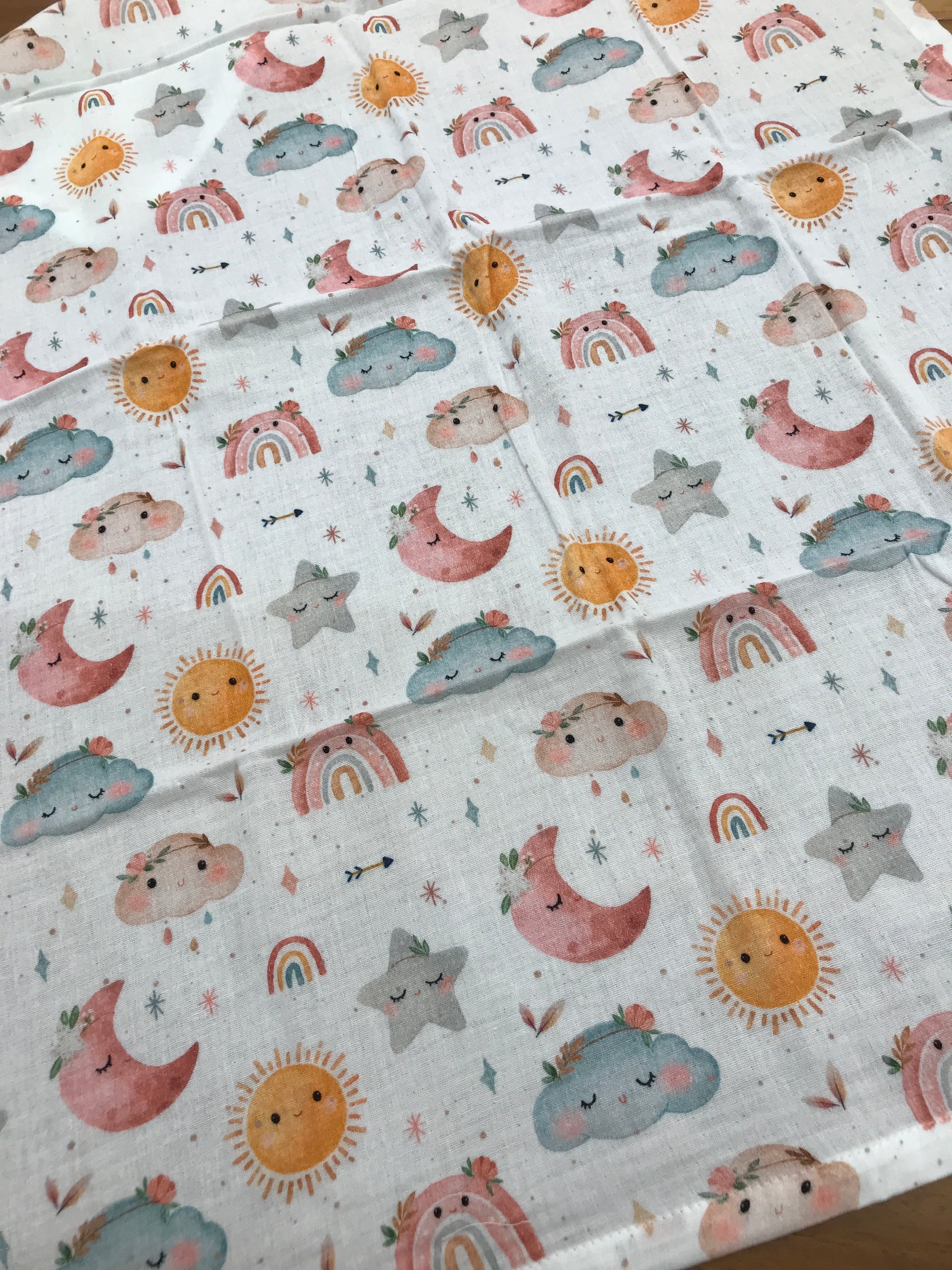 Questa mussola di cotone di alta qualità è decorata con motivi animati che rappresentano sole, luna, nuvole e arcobaleni, arricchendo il tessuto di un tocco di vivacità e movimento ideale per progetti creativi e delicati.