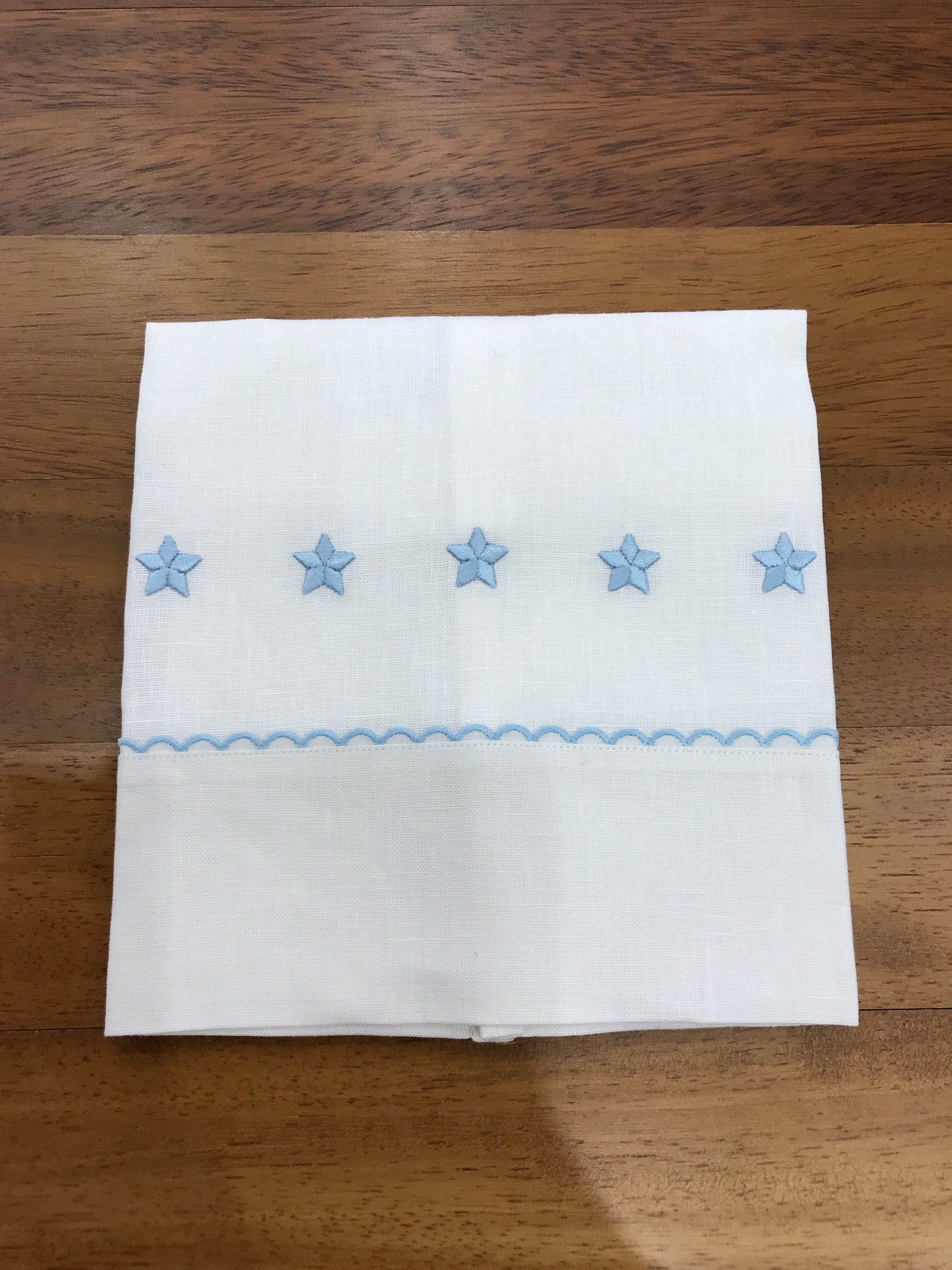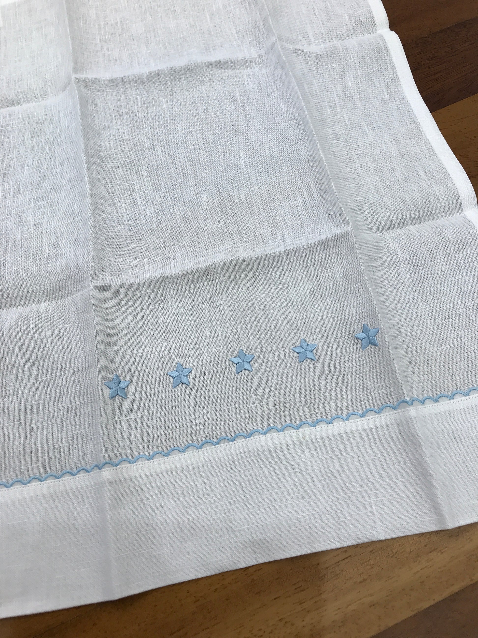 Realizzata in lino pregiato di colore bianco, questa mussola presenta un design essenziale e raffinato. Sul davanti sono delicatamente ricamate delle stelline celesti, che aggiungono un tocco di eleganza discreta e un dettaglio distintivo, perfetto per chi cerca un capo basico con un carattere unico e curato nei particolari.