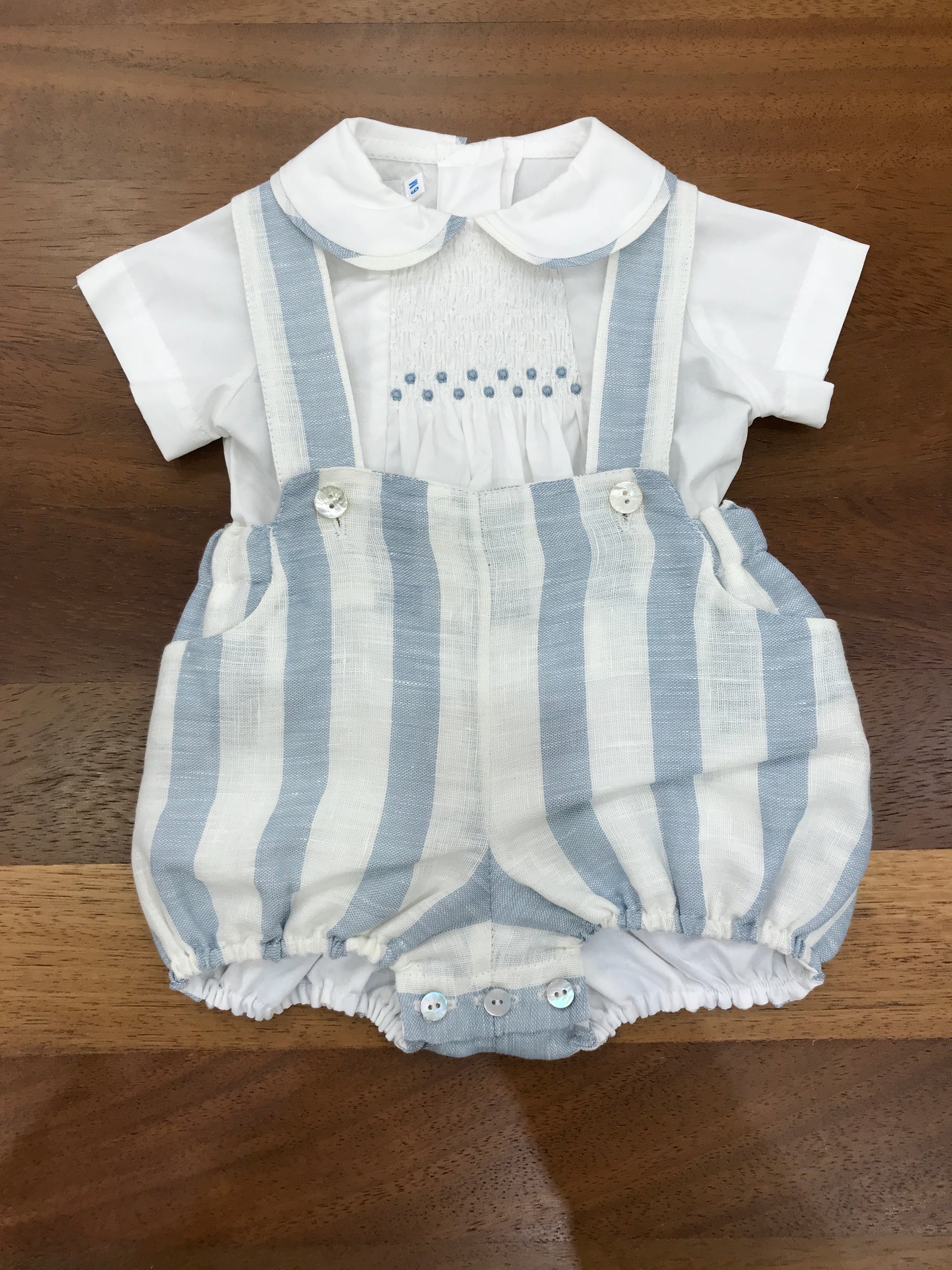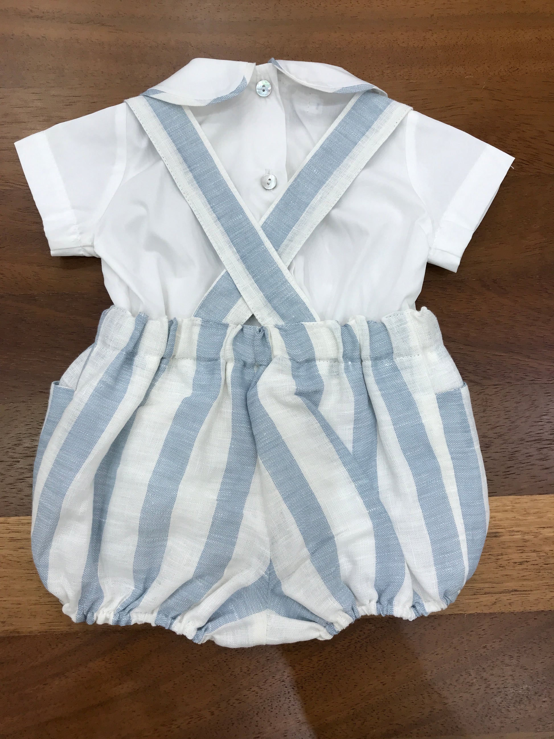 Delizioso pagliaccetto in cotone a righe bianche e celesti, caratterizzato da una salopette con bretelle regolabili e una camicina a mezza manica. Il colletto tondo presenta un profilo a righe coordinato, mentre il dettaglio smocking centrale in celeste aggiunge un tocco di raffinatezza. Un capo versatile e confortevole, perfetto per le giornate di gioco e relax dei più piccoli.