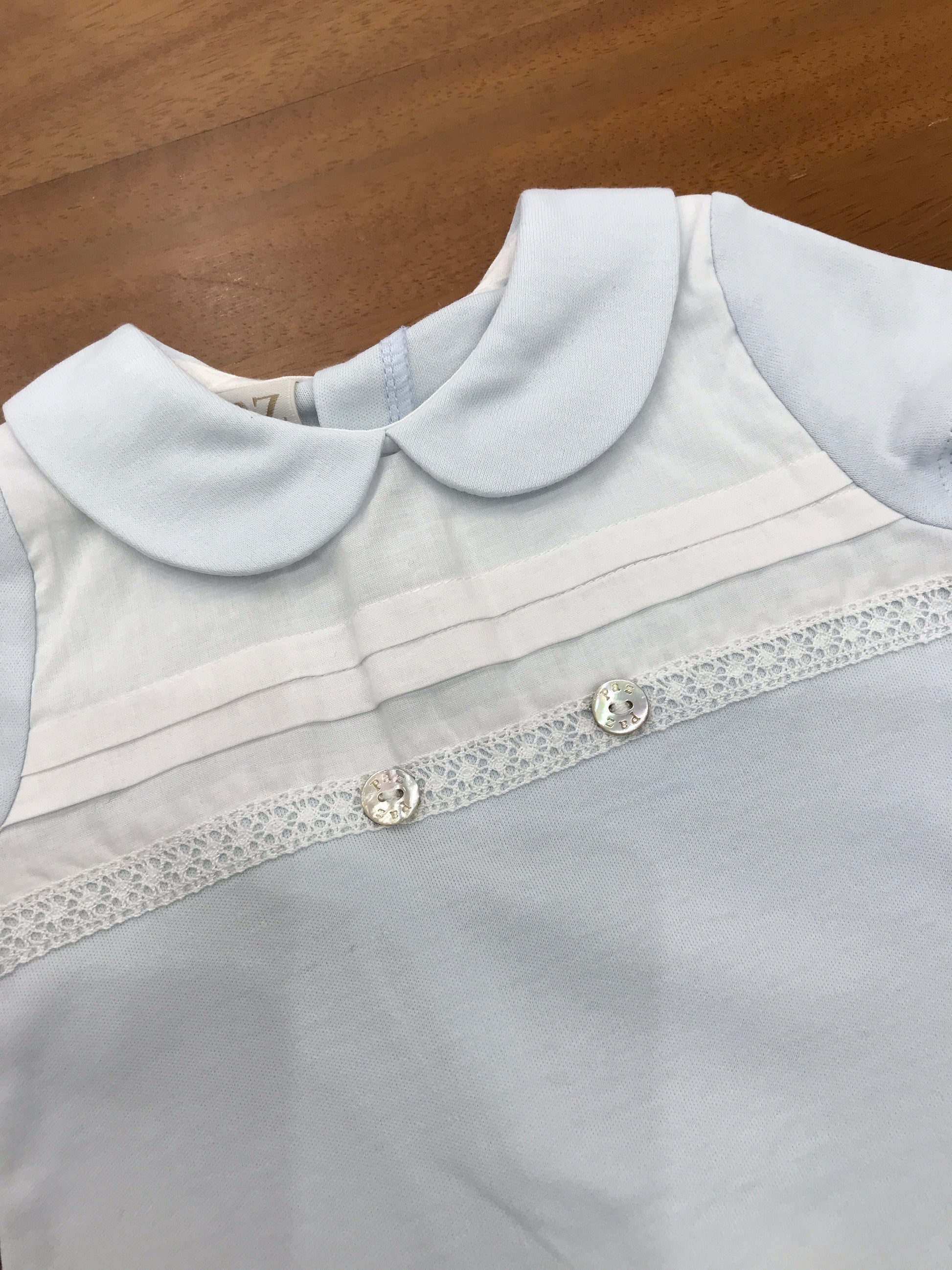 Delicato pagliaccetto in puro cotone nella tonalità celeste, caratterizzato da linee essenziali e pratiche. La silhouette corta con maniche a mezza lunghezza lo rende ideale per le stagioni intermedie, mentre il colletto tondo conferisce un'eleganza sobria. Il dettaglio bianco sul davanti aggiunge un tocco di raffinatezza, creando un contrasto visivo che valorizza il capo. Una scelta versatile e confortevole per il guardaroba del piccolo.