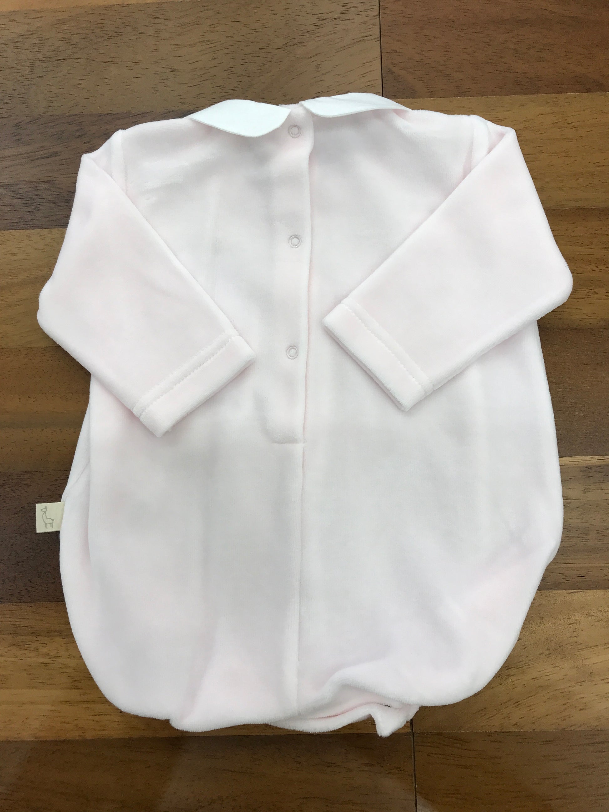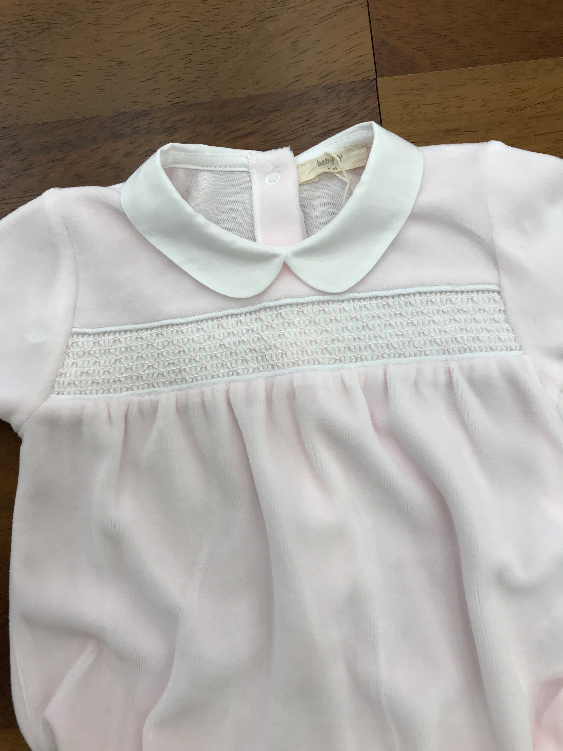 Questo pagliaccetto in ciniglia presenta maniche lunghe, un elegante colletto bianco e una raffinata decorazione frontale realizzata con la tecnica del punto smock, che aggiunge un tocco di artigianalità e stile al capo. Ideale per garantire comfort e un aspetto curato al tuo bambino.