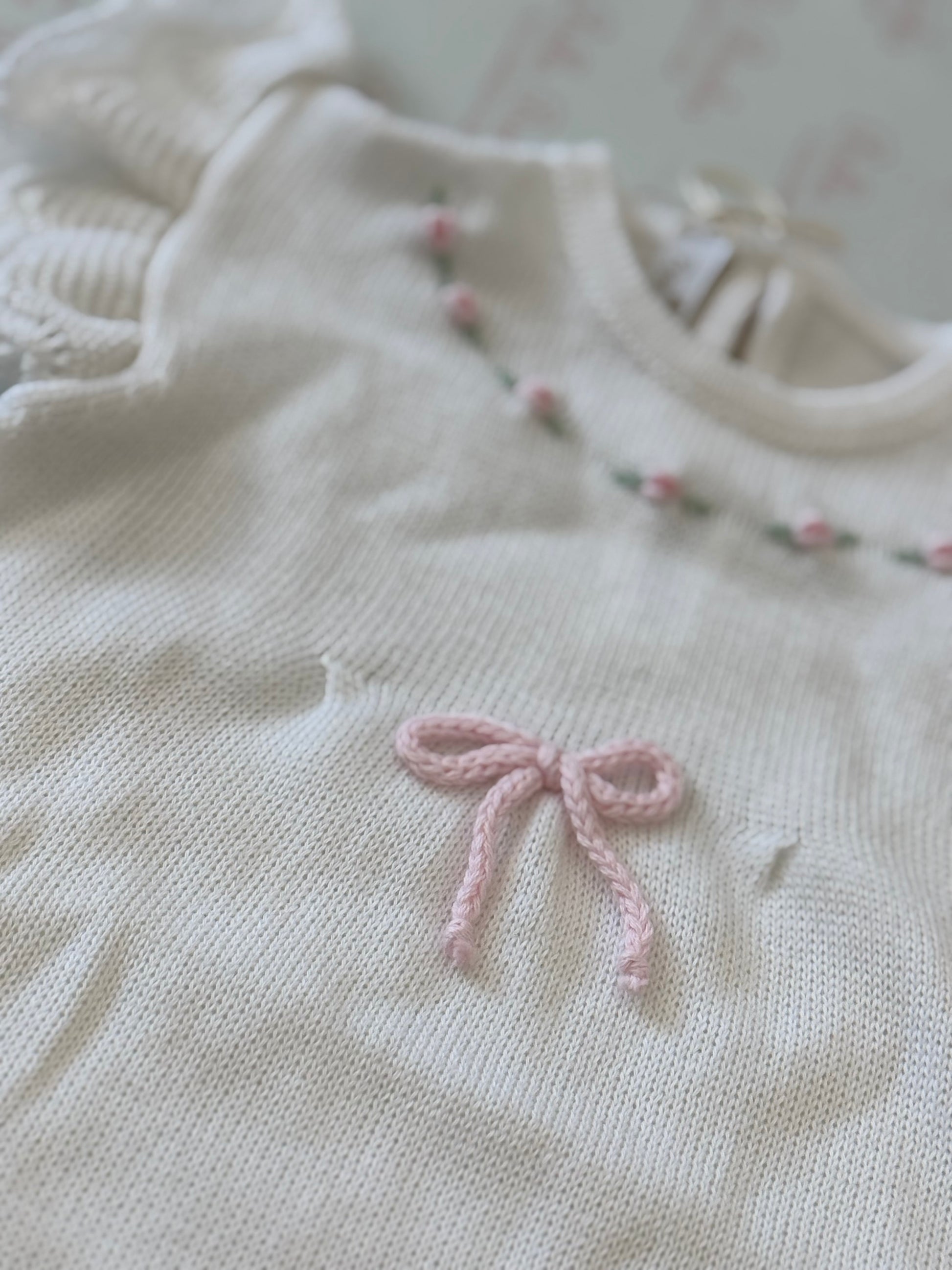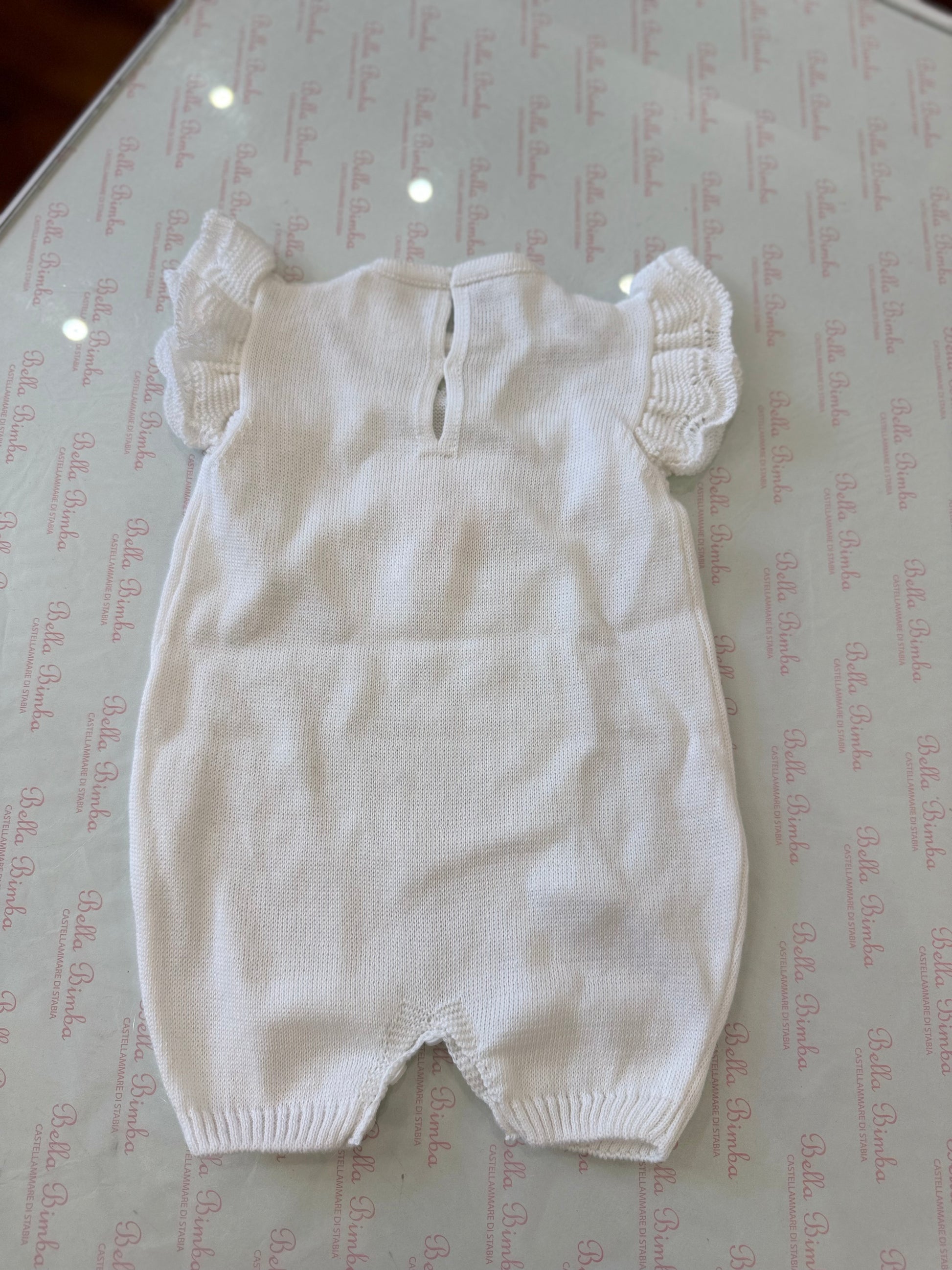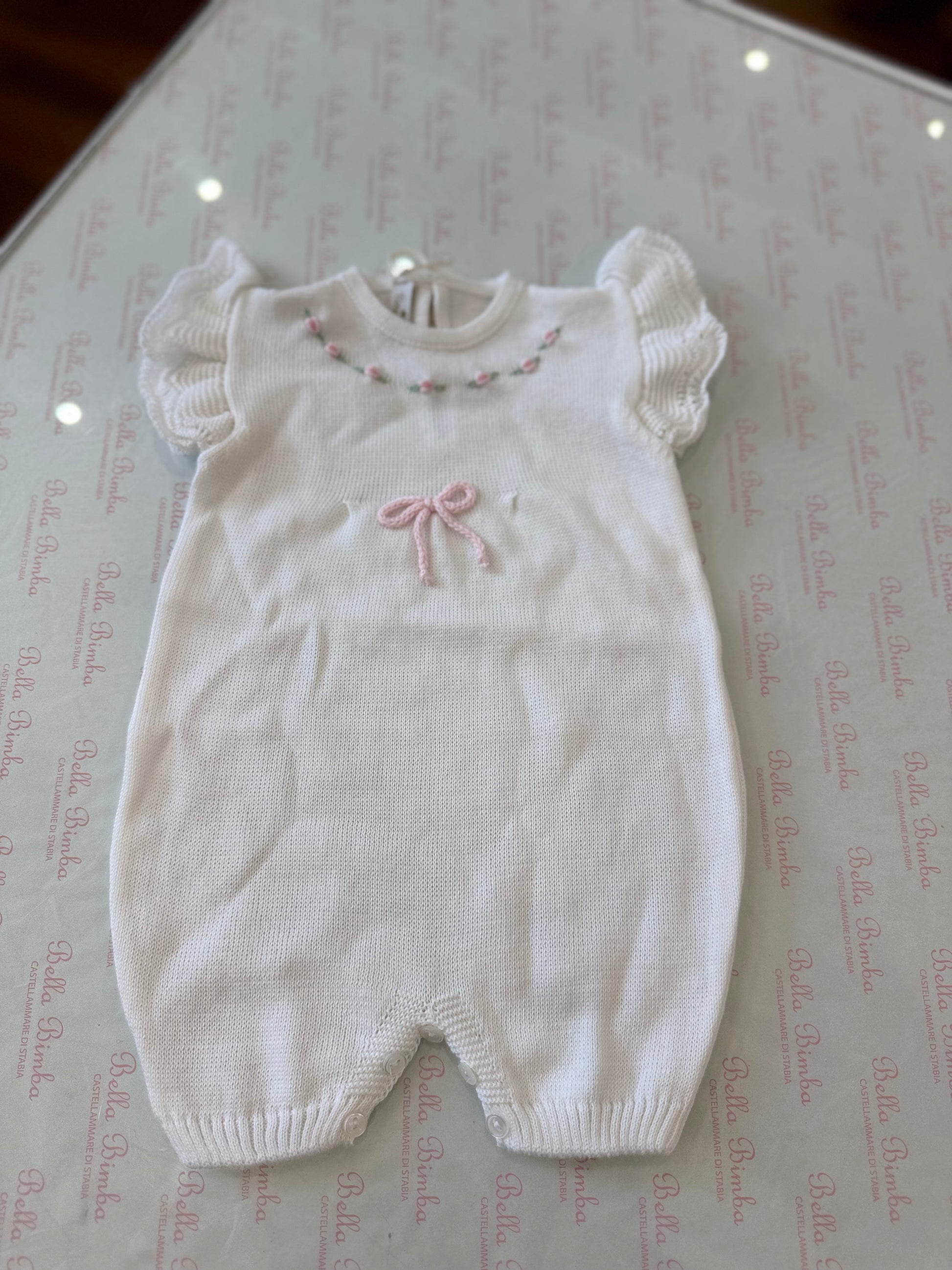 Il nostro Pagliaccetto Baby Lord è un must-have per ogni bimba. Realizzato al 100% in filo di cotone, questo delizioso pagliaccetto bianco presenta una manica con rouche e un ricamo di roselline rosa arricchito da un fiocco in tessuto centrale. Perfetto per un'occasione speciale o semplicemente per un look elegante e raffinato.