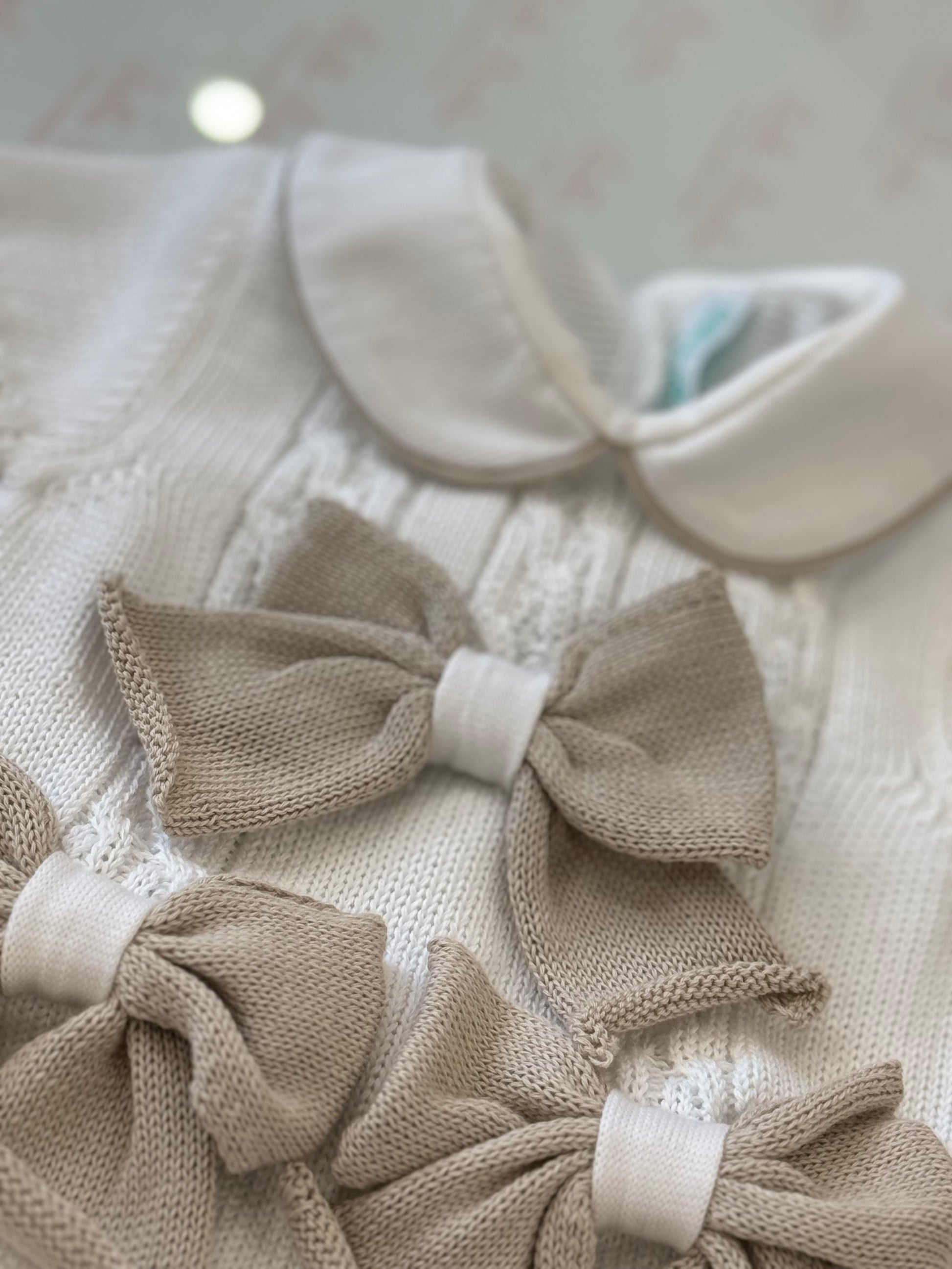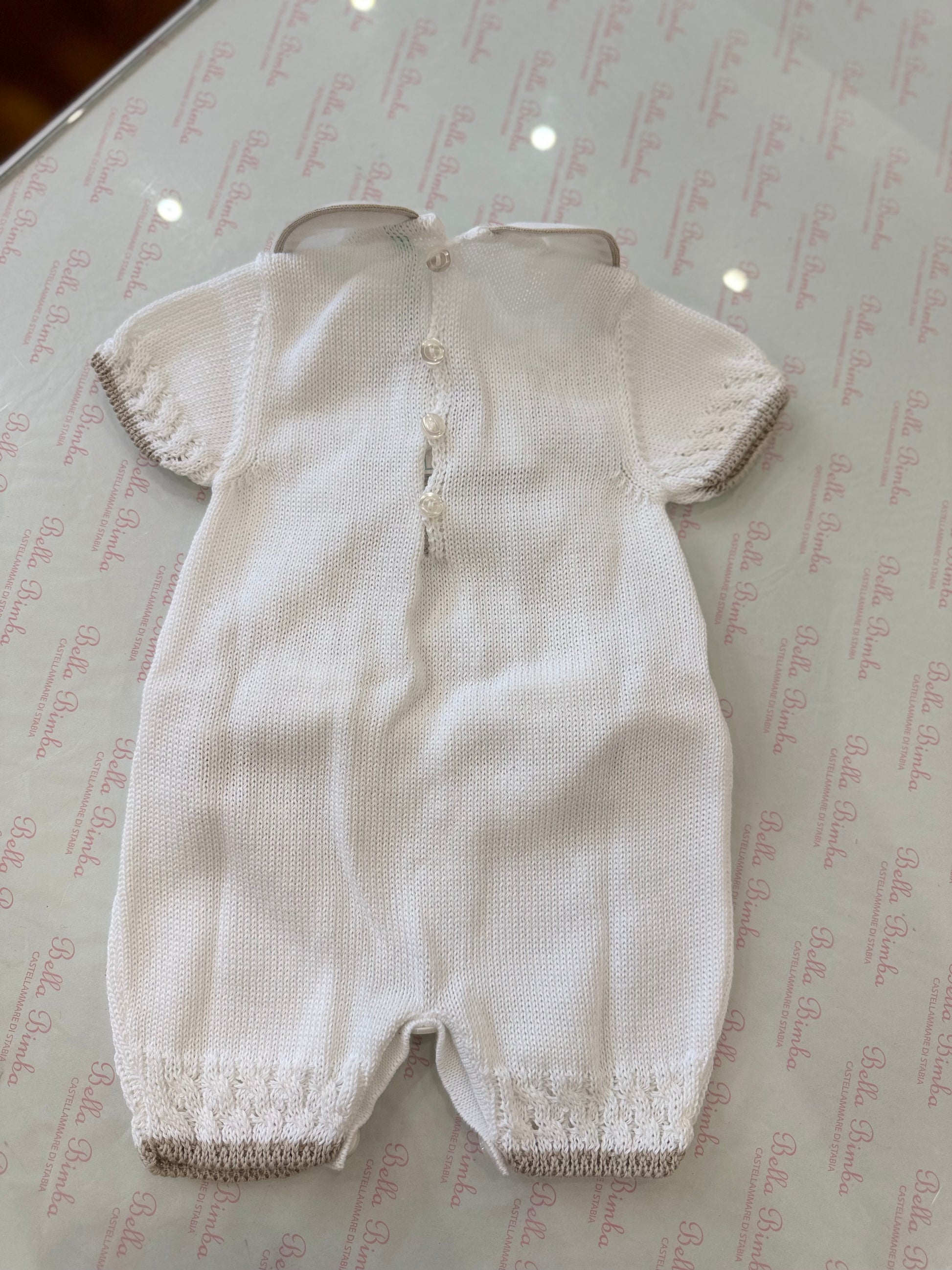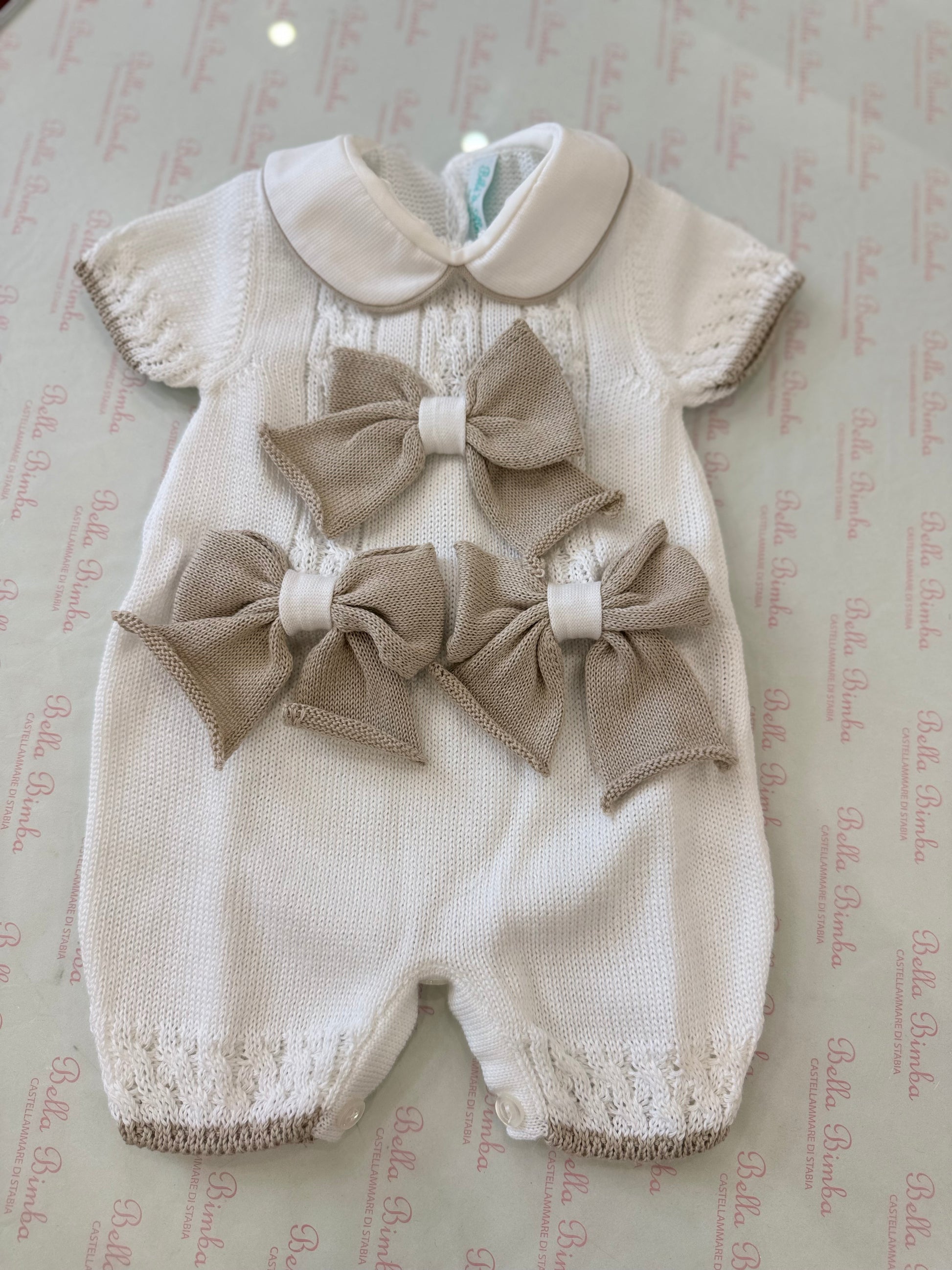 Pagliaccetto Bebè di Almy. Caratterizzato da una manica corta in filo bianco e tre grandi fiocchi color tortora sul davanti, questo pagliaccetto è perfetto per la prima uscita del tuo/a piccolo/a con stile ed eleganza.