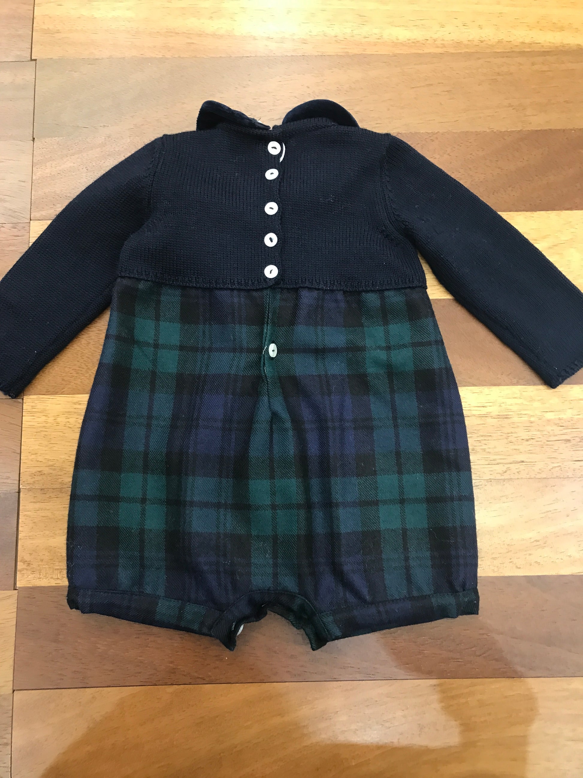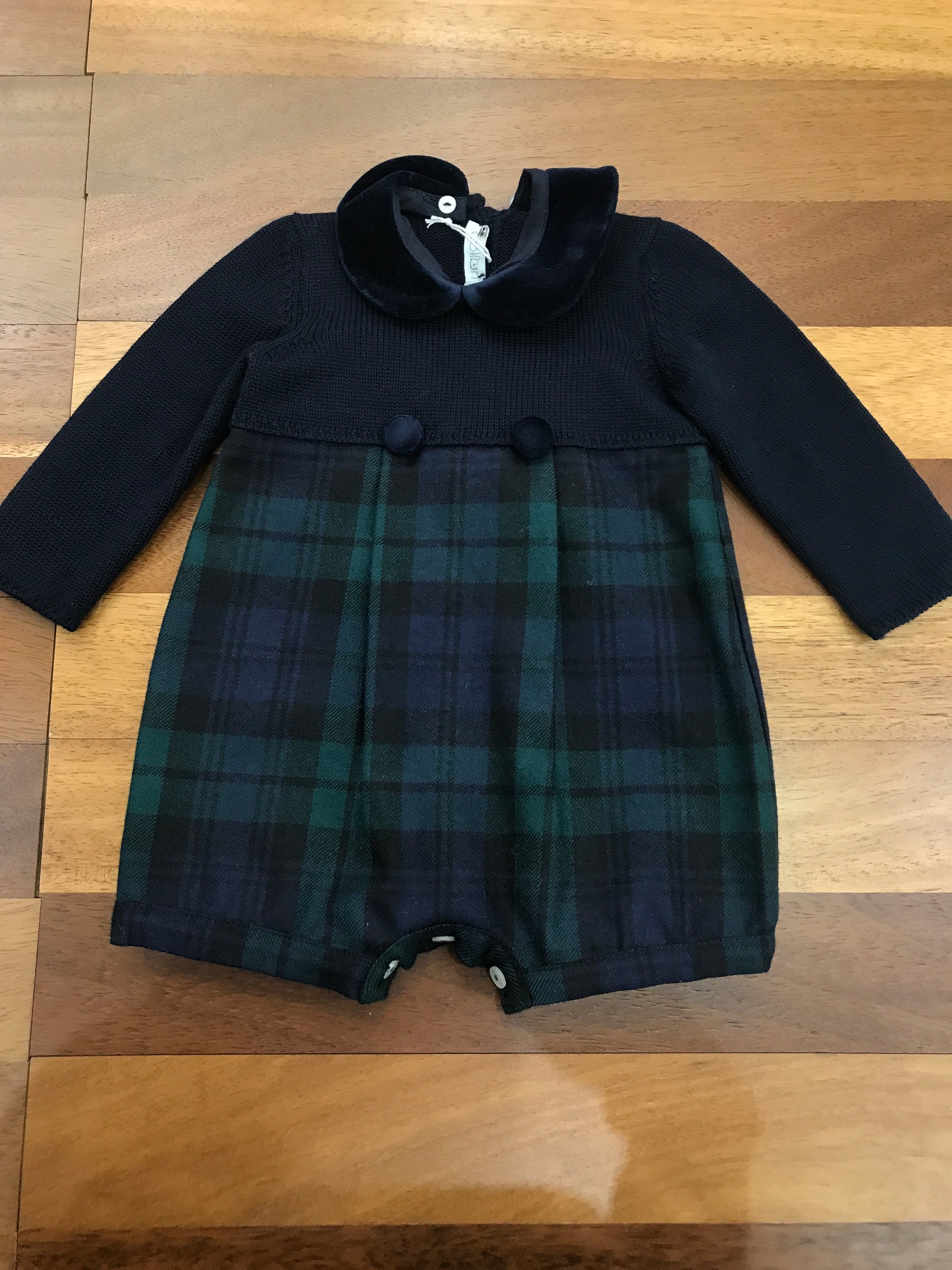 Delicato pagliaccetto caratterizzato da un corpetto in pregiata lana blu, impreziosito da un colletto in velluto dello stesso colore. La parte inferiore presenta un motivo scozzese nelle tonalità di verde e blu, mentre due minuti bottoni in velluto decorano la zona centrale, conferendo eleganza e raffinatezza al capo. Una scelta sofisticata per i piccoli.