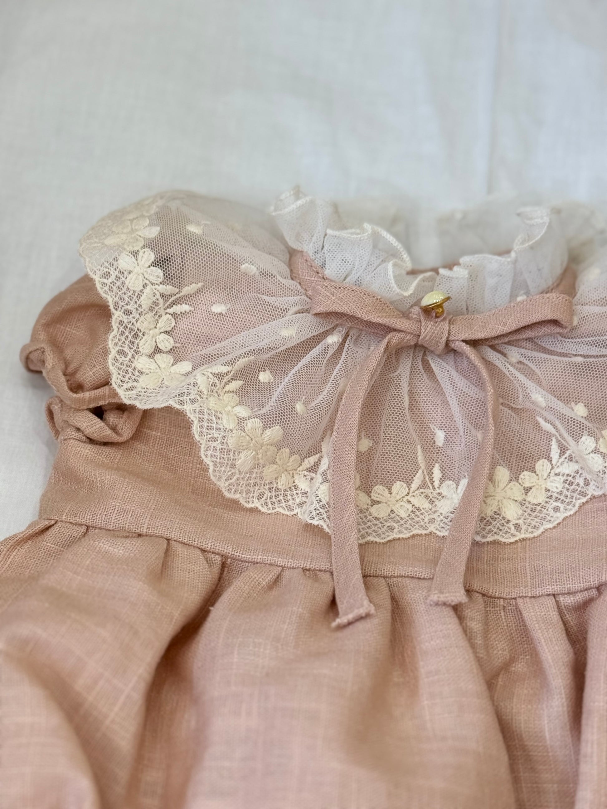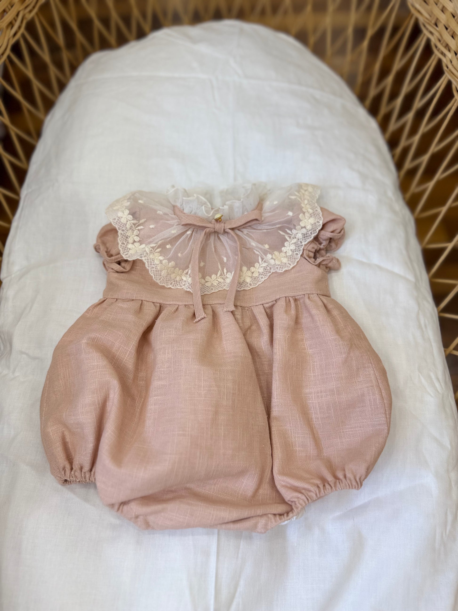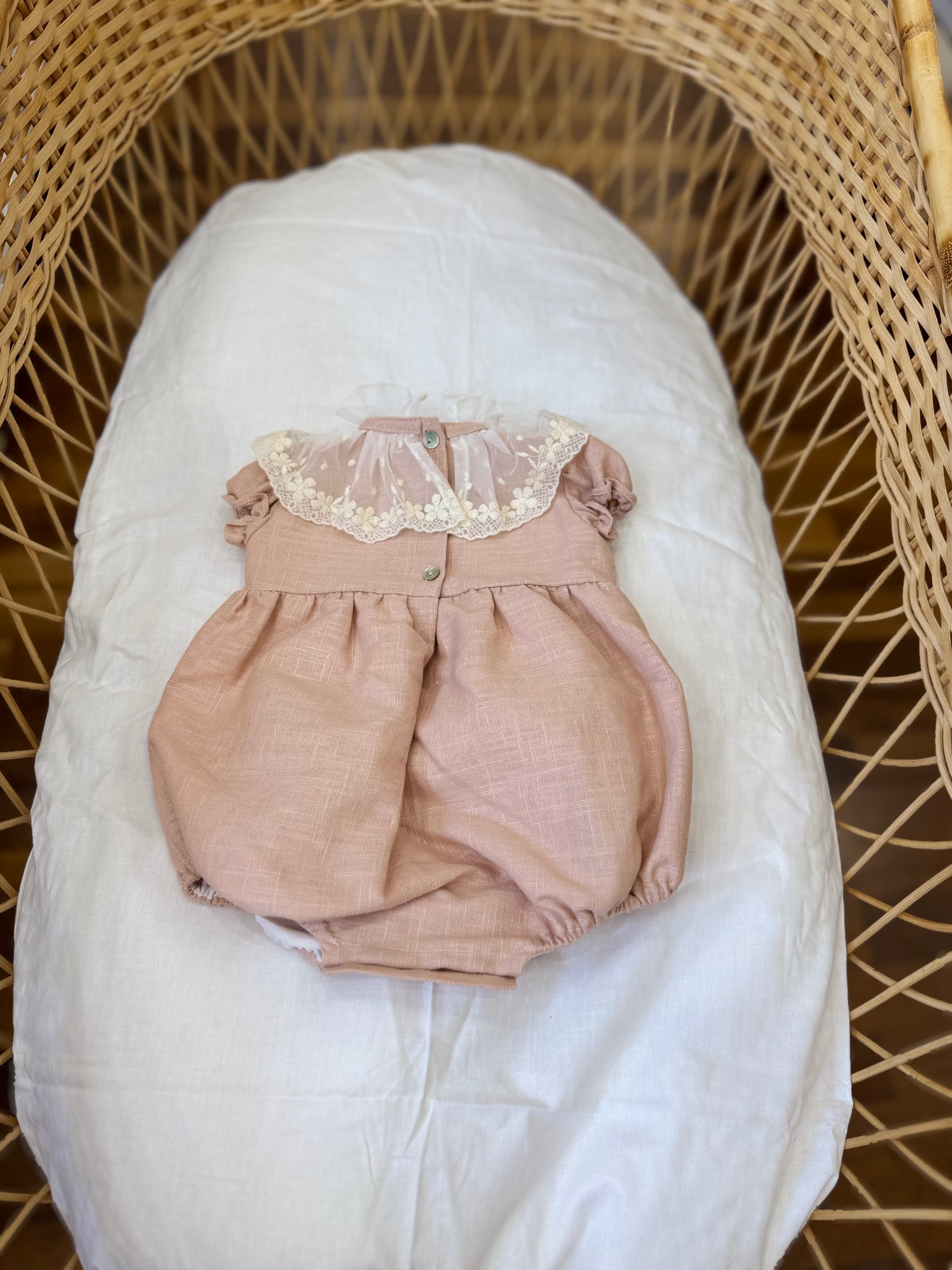 Questo pagliaccetto in lino rosa antico è l'abito perfetto per un'occasione speciale come la nascita o il battesimo. Il collo con rouche in pizzo avorio aggiunge un tocco di eleganza e delicatezza al design. Realizzato in morbido e traspirante lino, garantirà il massimo comfort alla tua piccola