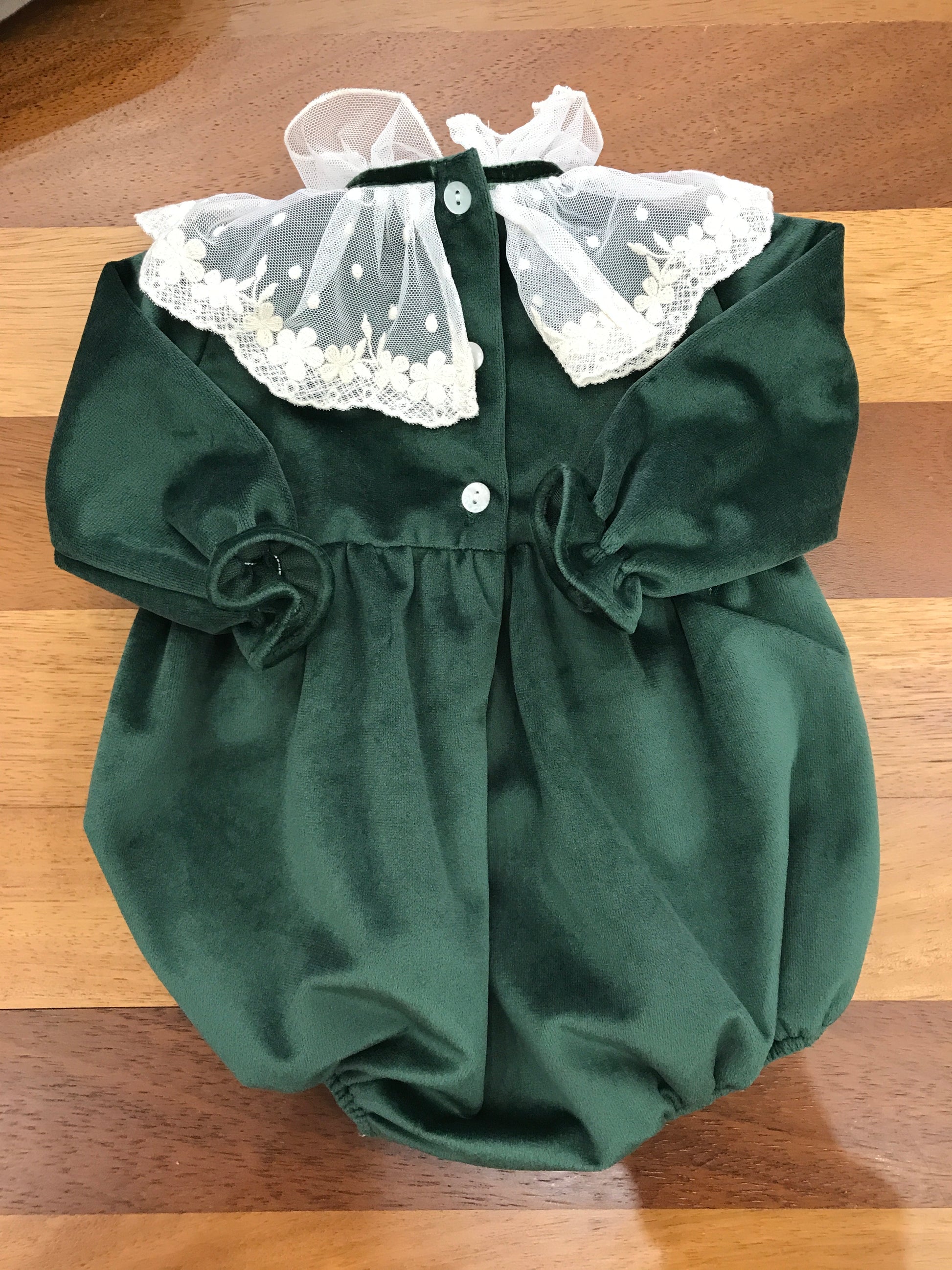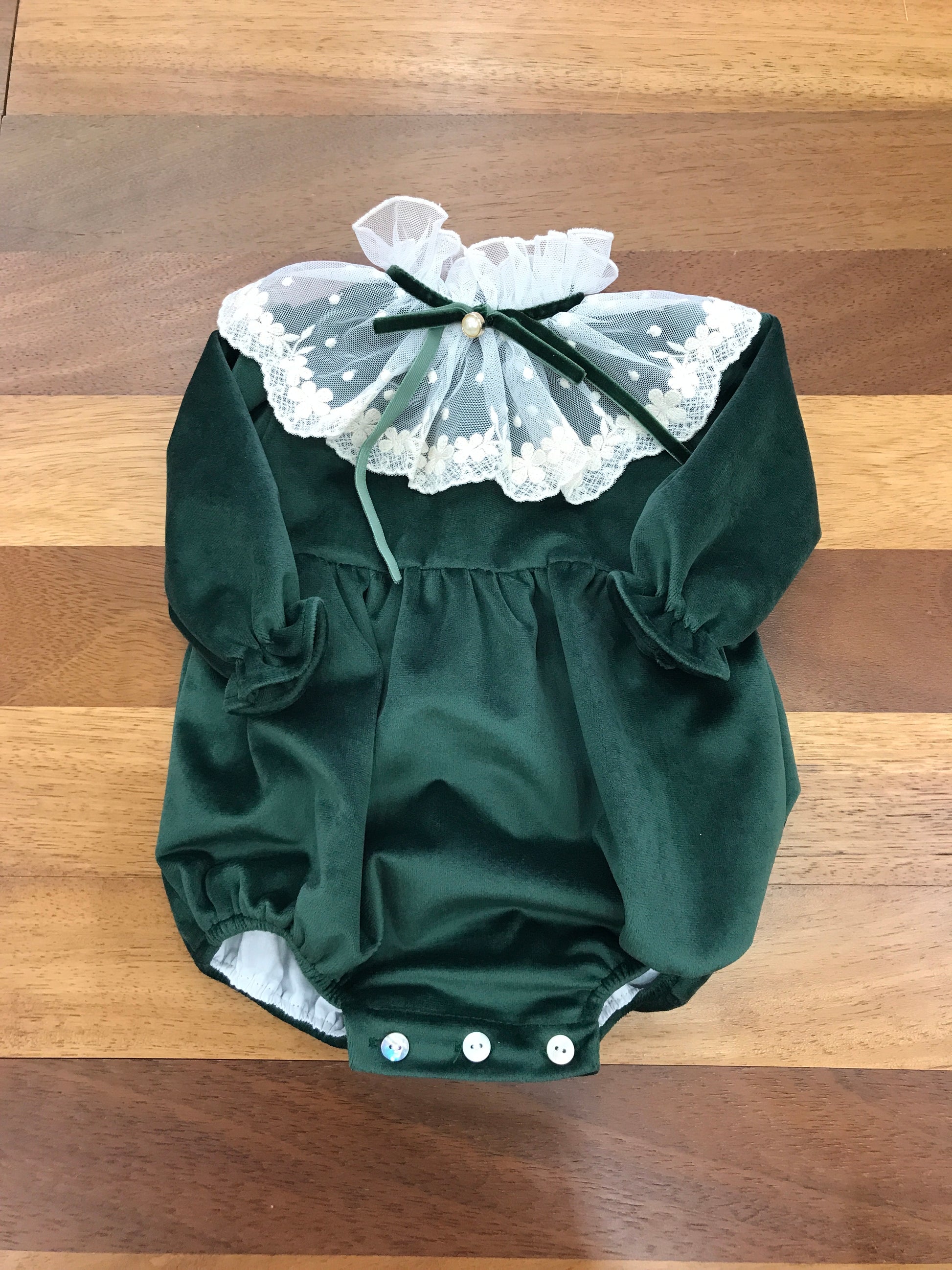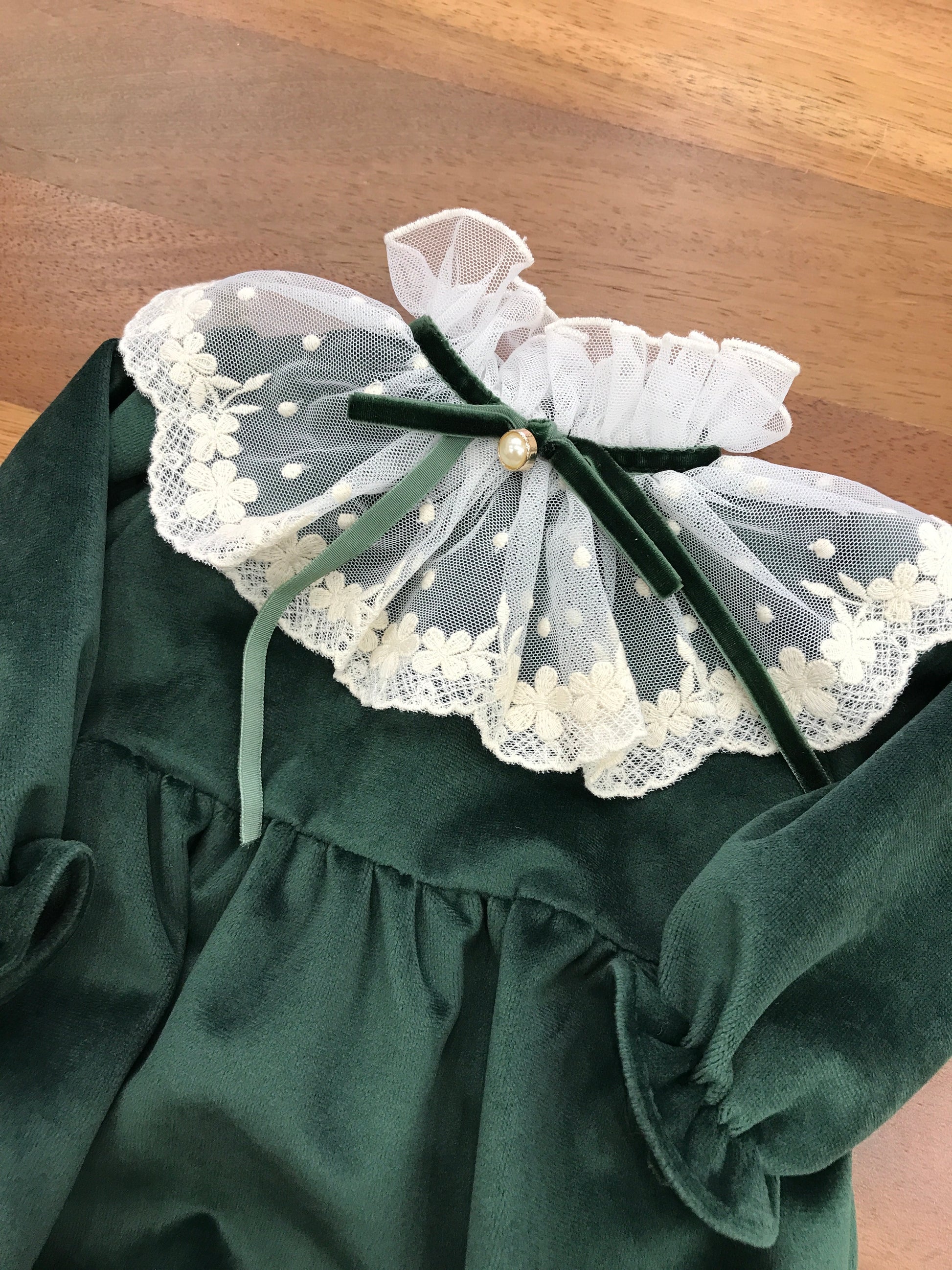Pagliaccetto in velluto dotato di maniche a sbuffo e dettagli ricamati. Il colletto in tulle presenta delicati fiorellini ricamati e un elegante fiocchetto in velluto.