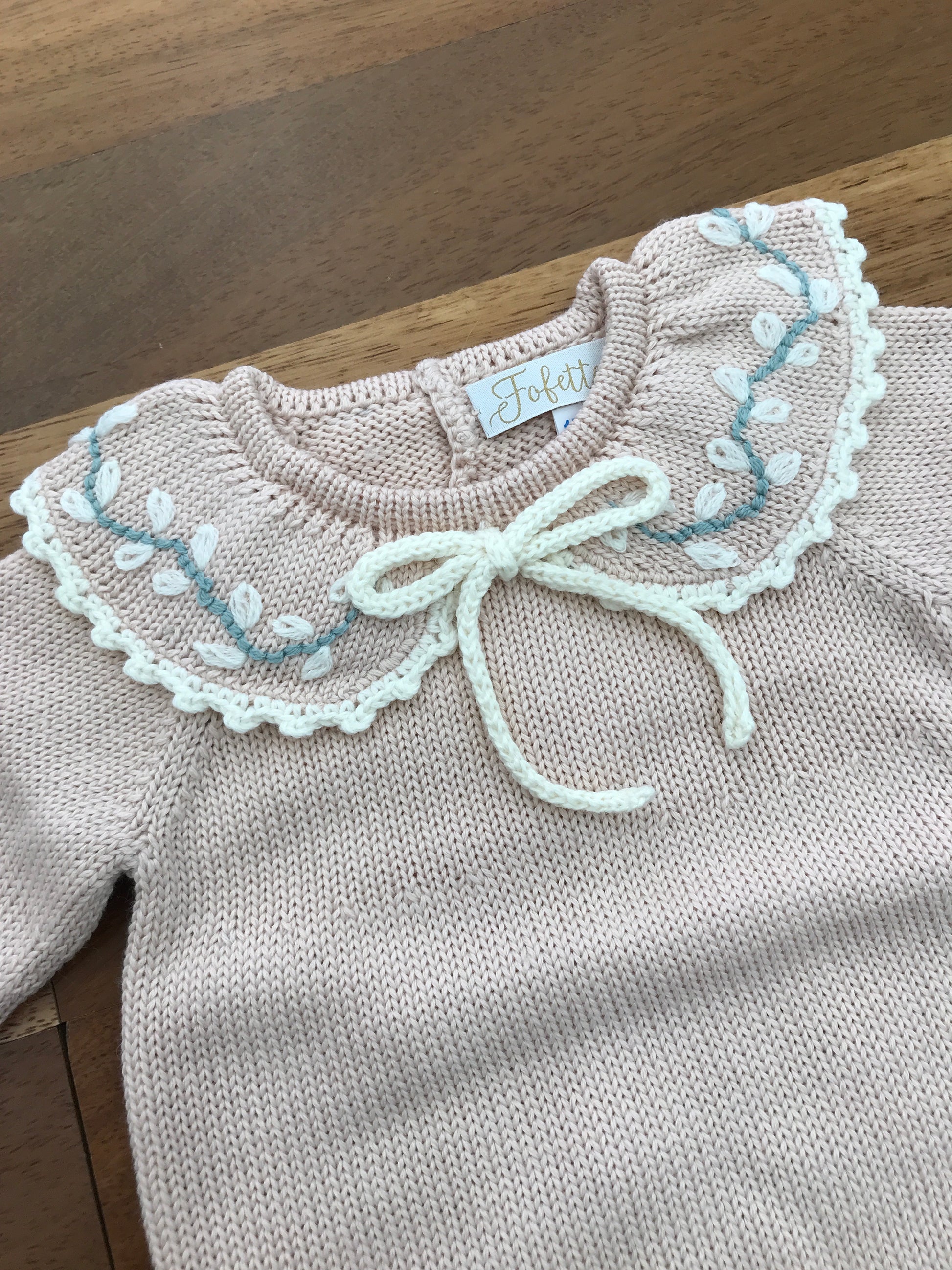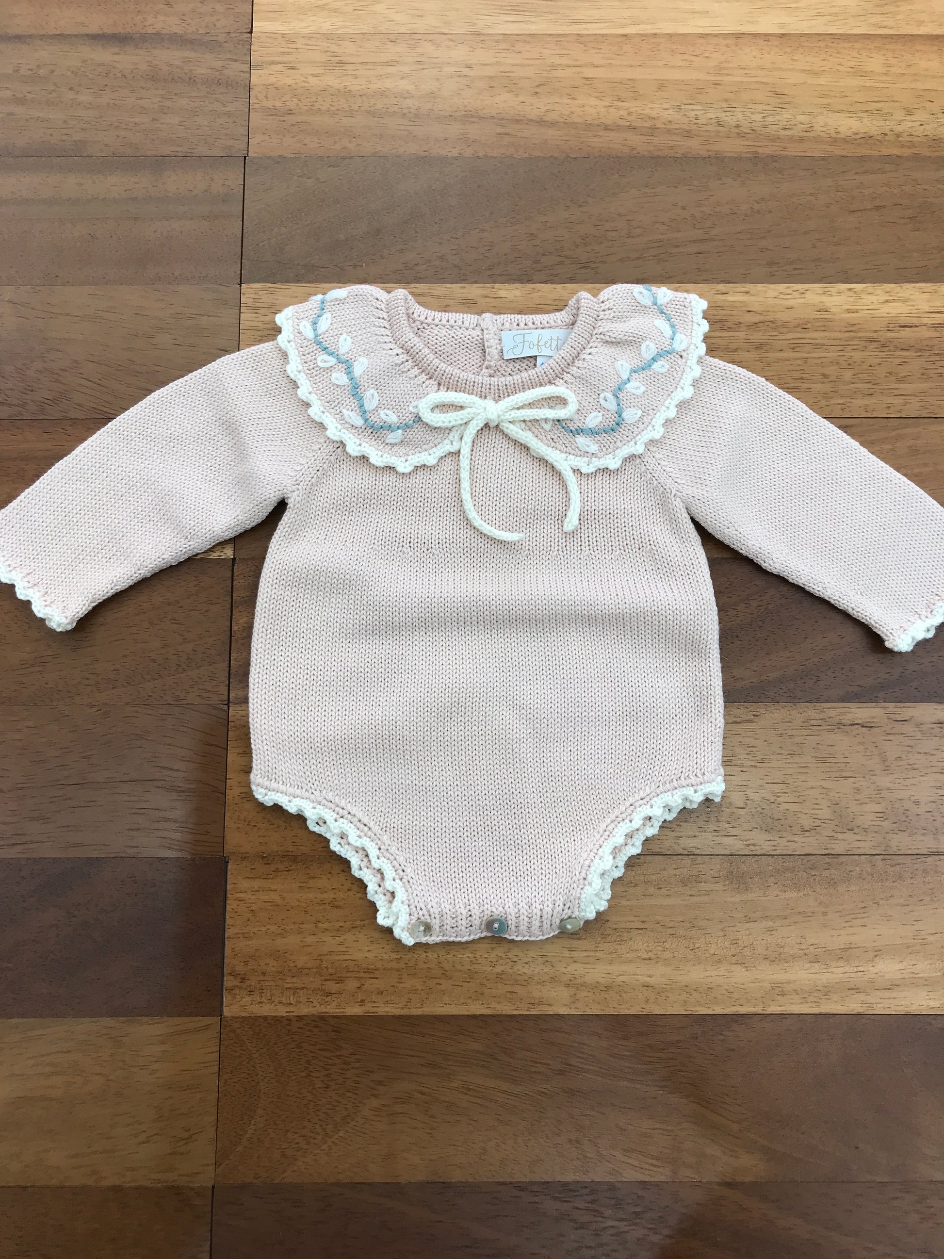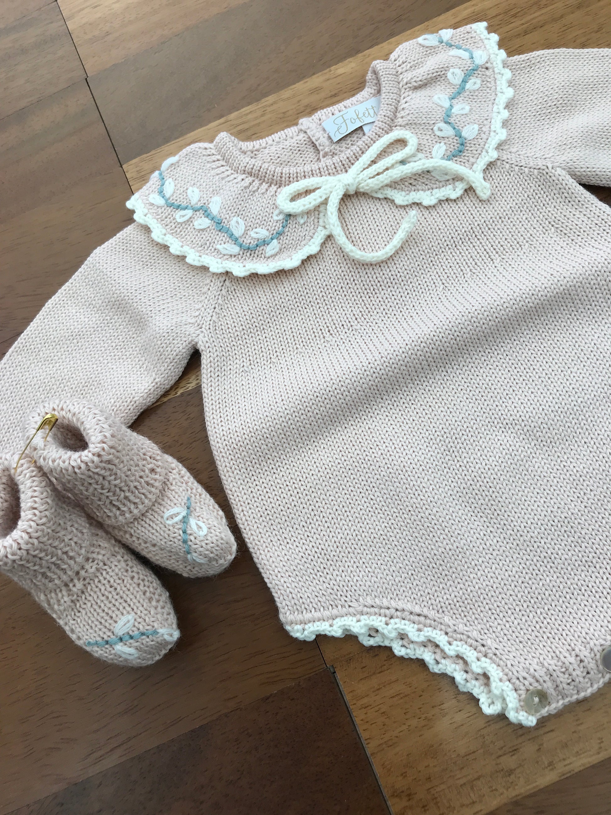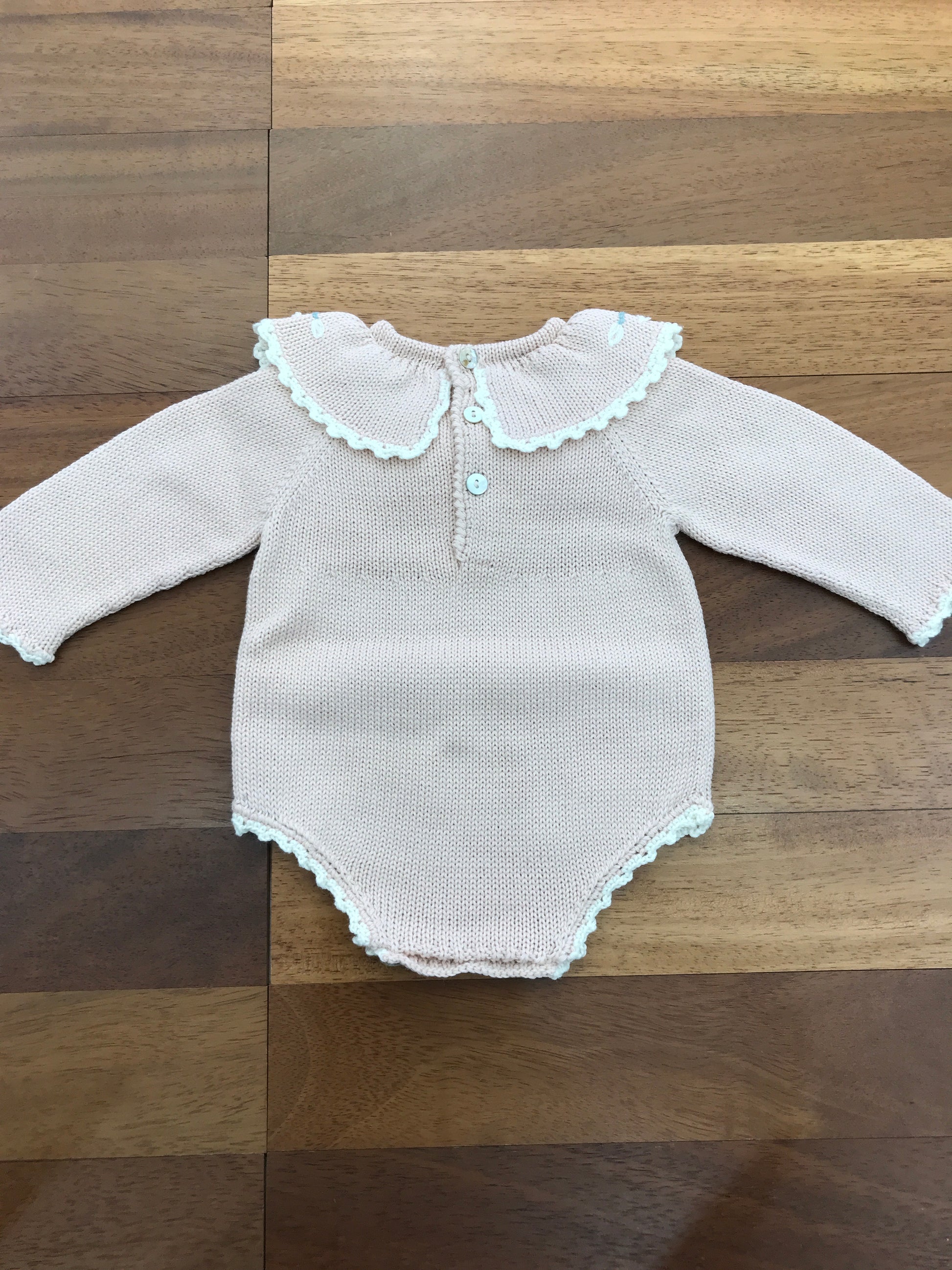 Pagliaccetto realizzato in lana mista con maniche lunghe, caratterizzato da un collo ampio lavorato a maglia a motivo di foglioline.