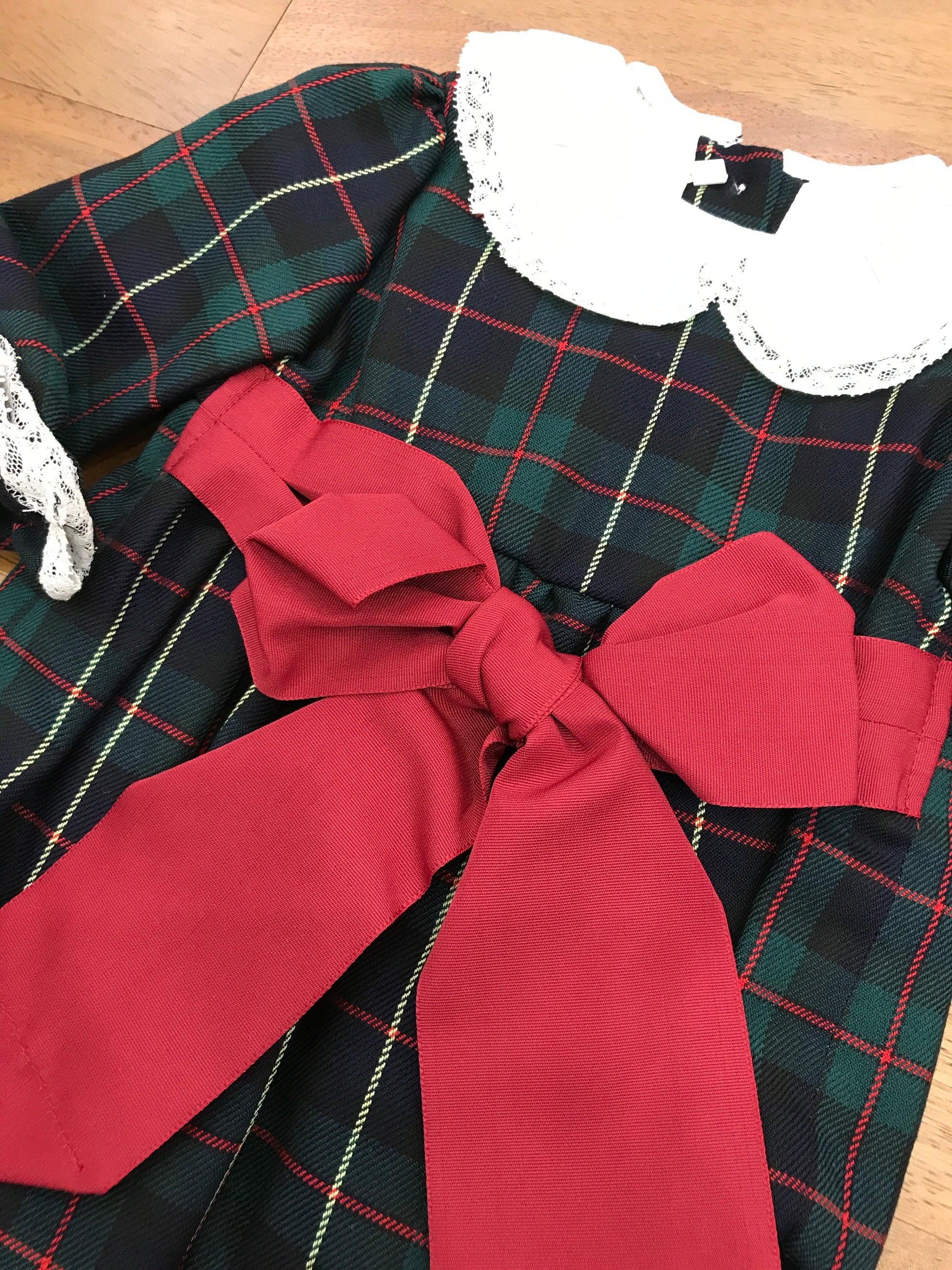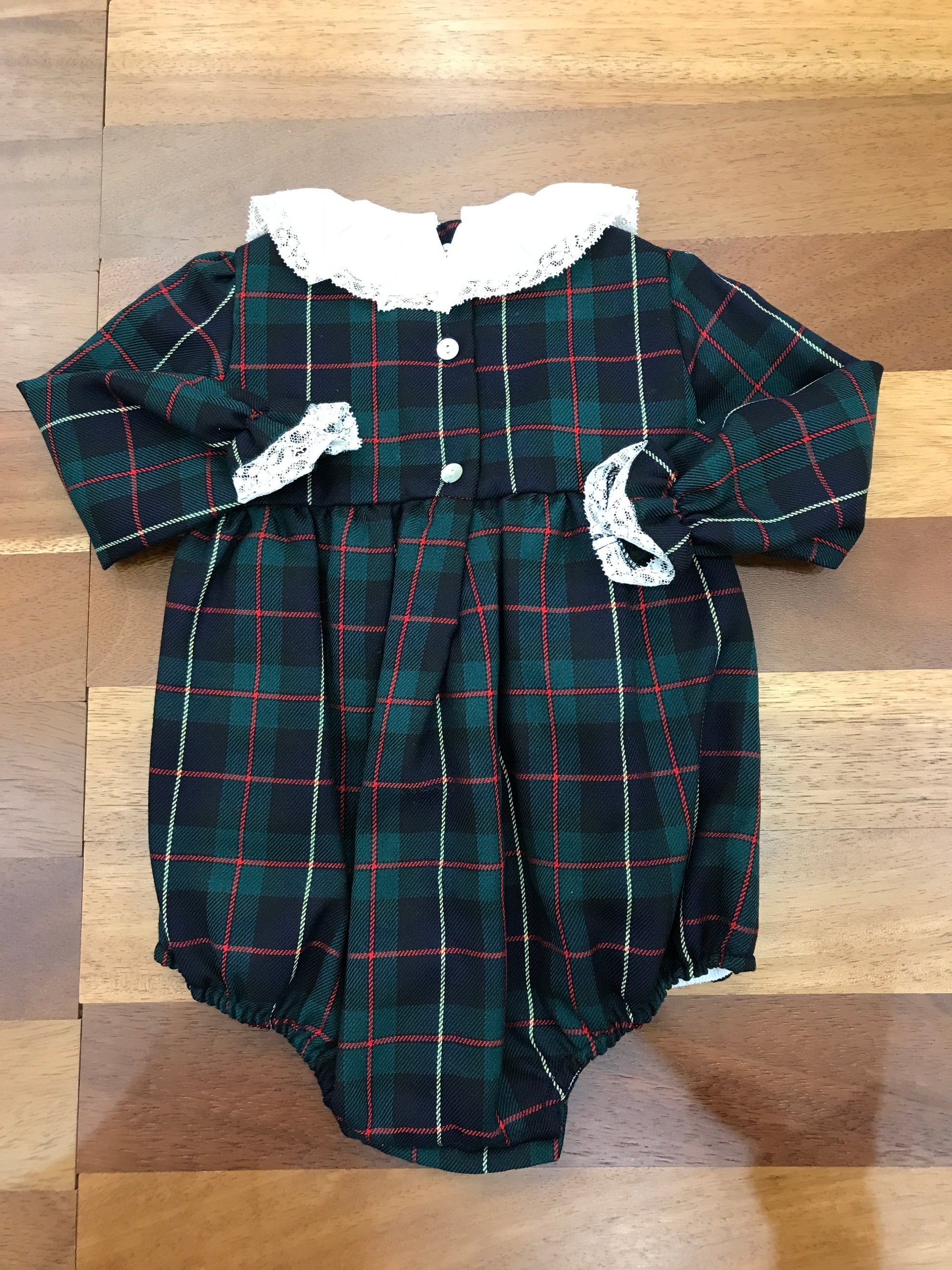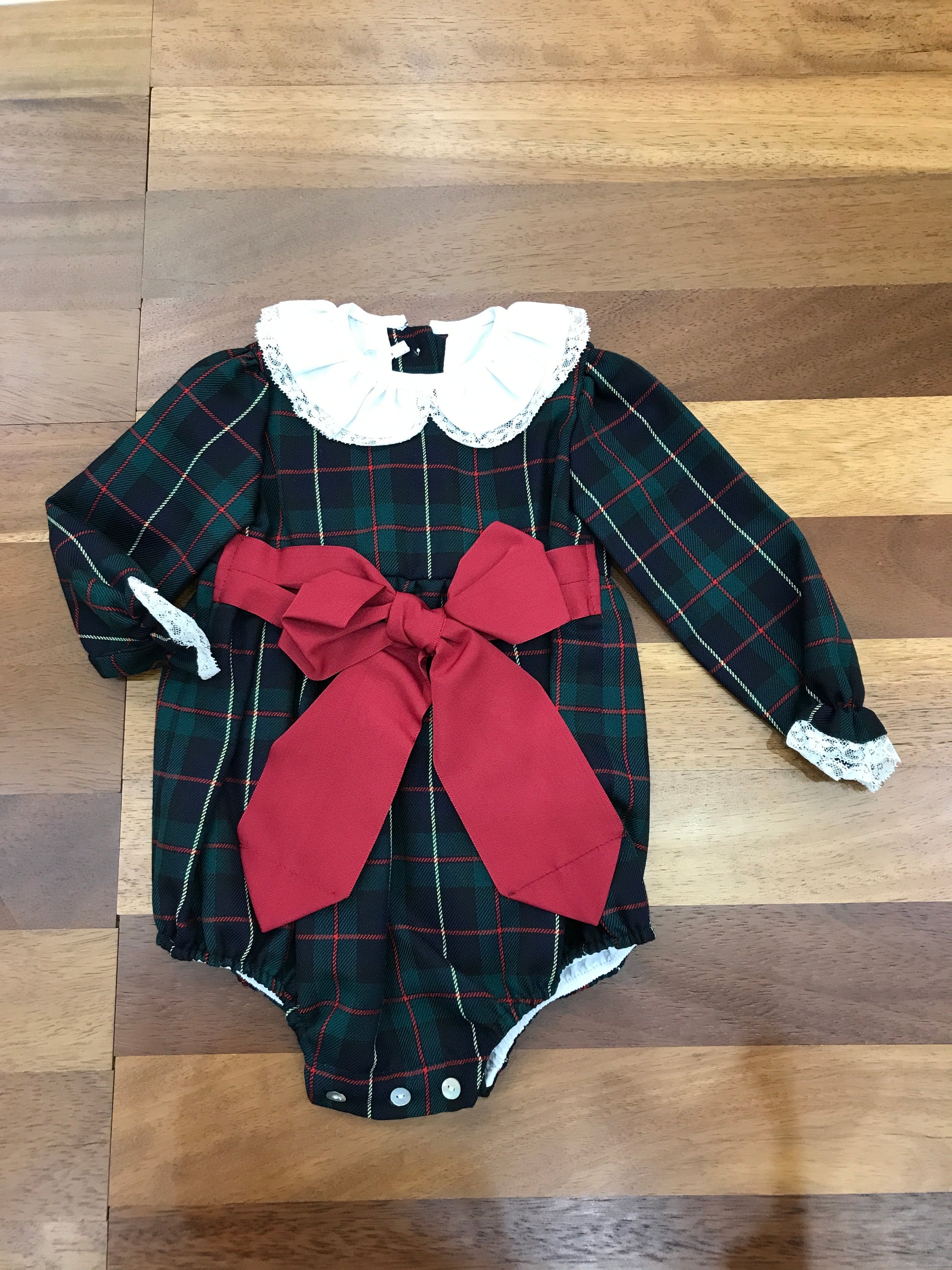 Delicato pagliaccetto in tartan scozzese che combina sfumature di verde e blu navy, impreziosito da un colletto in pizzo ricamato. Le maniche arricciate presentano una finitura in pizzo applicato, mentre un elegante fiocco rosso decora il davanti, creando un capo raffinato e ricercato per le piccole ospiti.