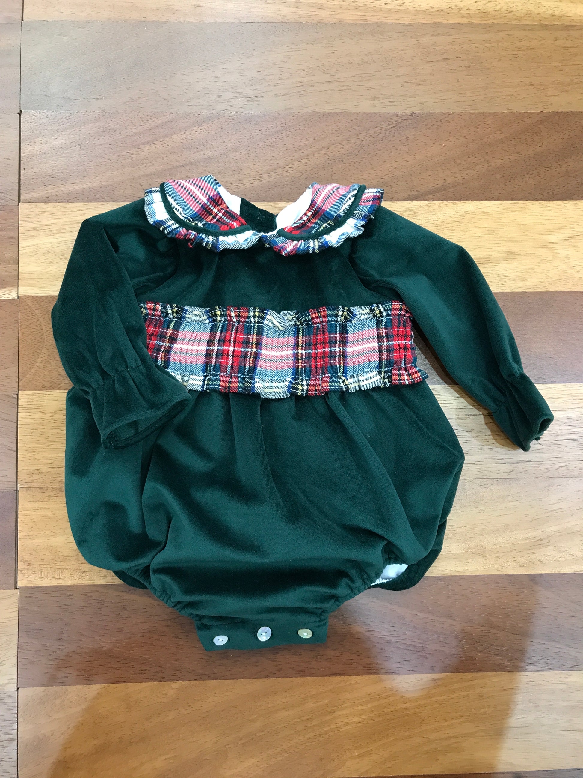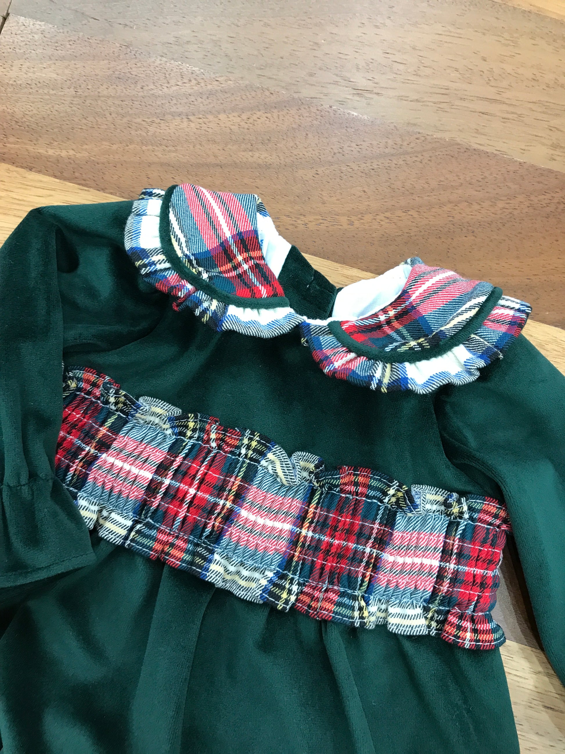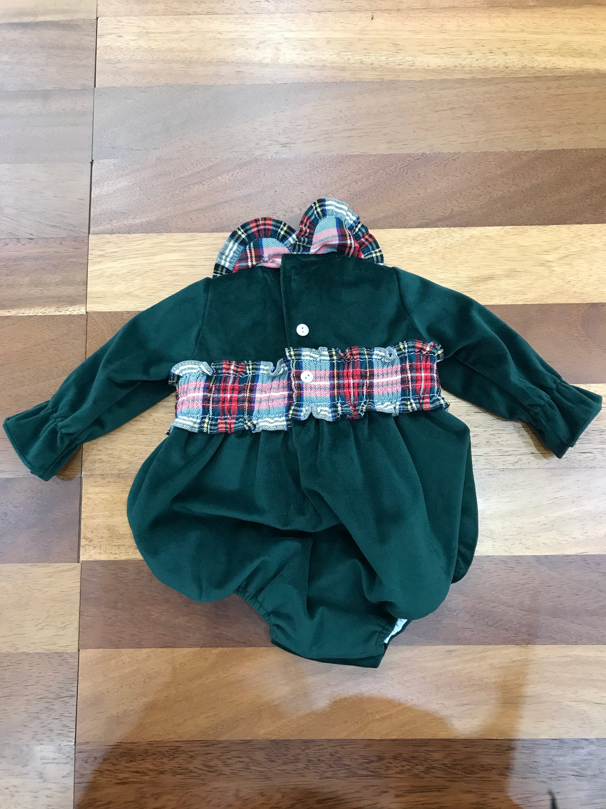 Elegante pagliaccetto in morbido velluto verde con maniche lunghe, arricchito da un raffinato colletto scozzese e una fascia vita coordinata in tartan verde. Un capo versatile che unisce comfort e stile, perfetto per occasioni speciali o per un look quotidiano sofisticato.