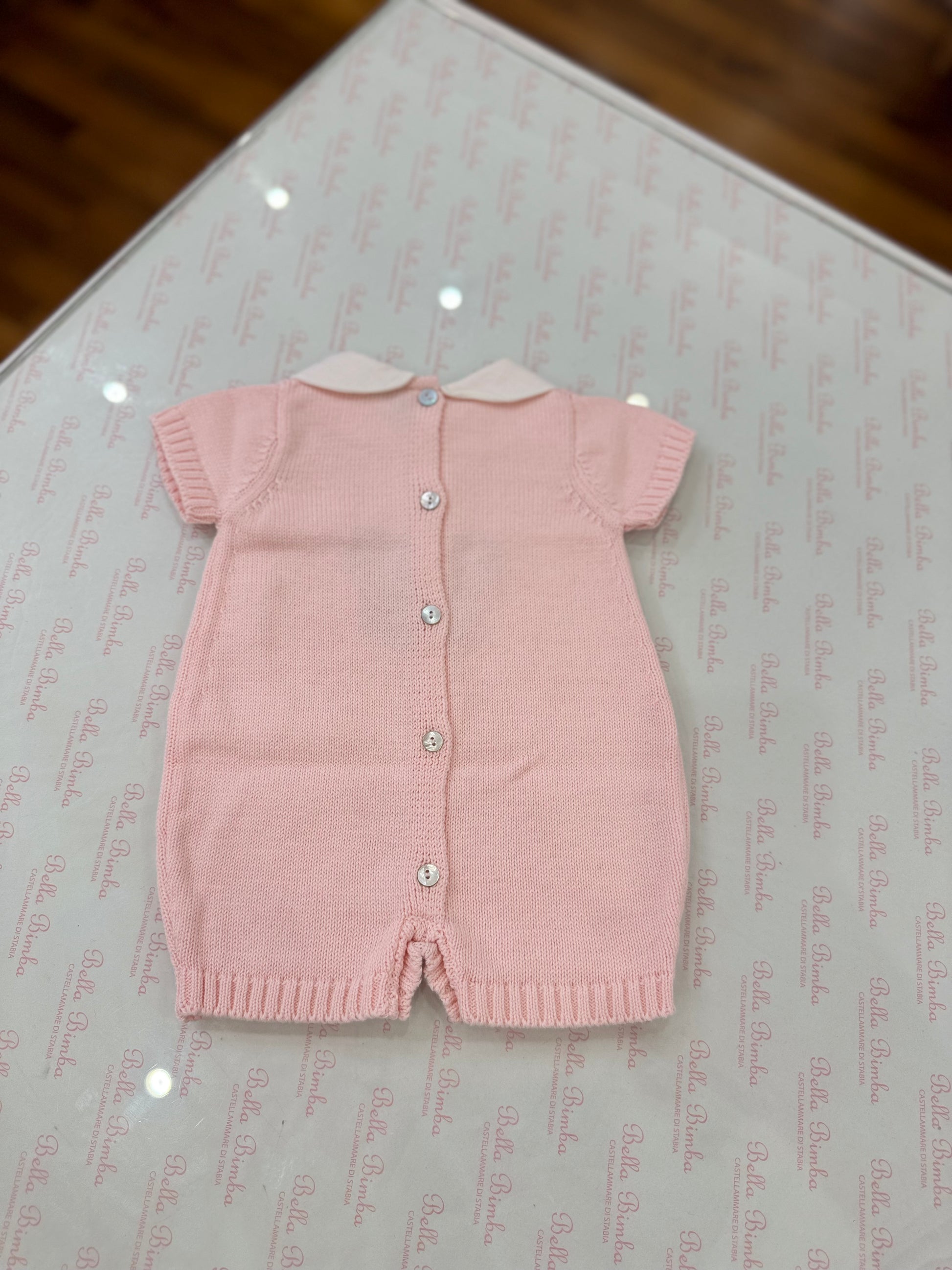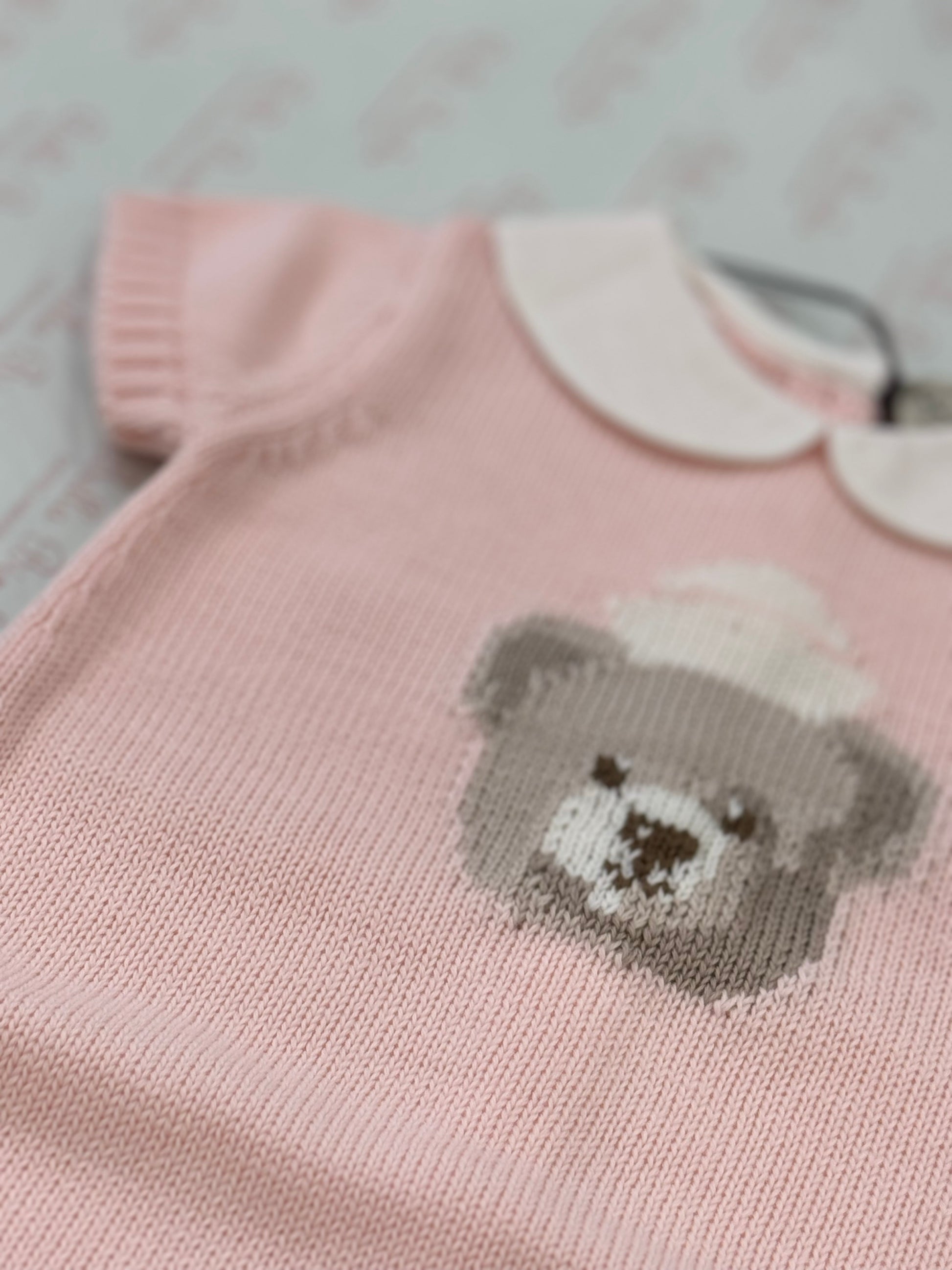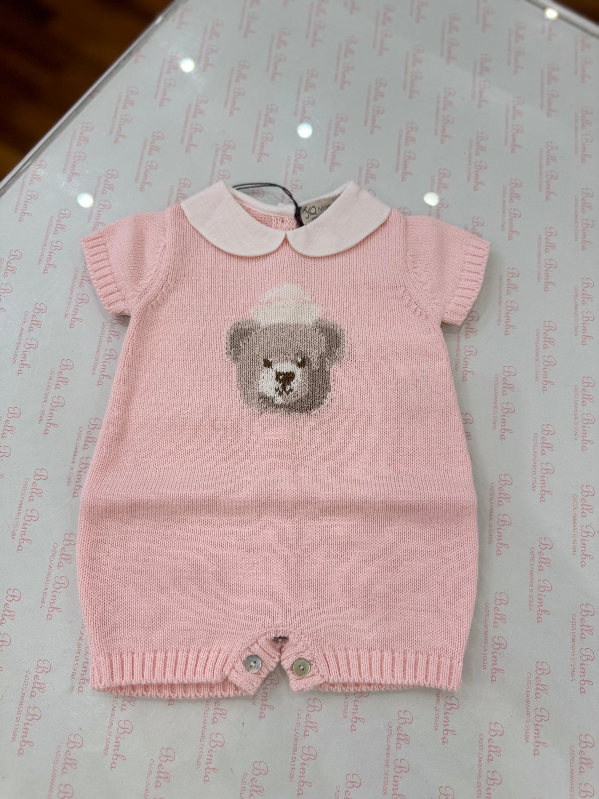 Il Pagliaccetto Jo Milano è un capo d'abbigliamento elegante e raffinato. Realizzato con un morbido filato rosa, presenta maniche corte e un grazioso colletto bianco con un adorabile orsetto al centro. Perfetto per un look chic ma confortevole per la tua piccola
