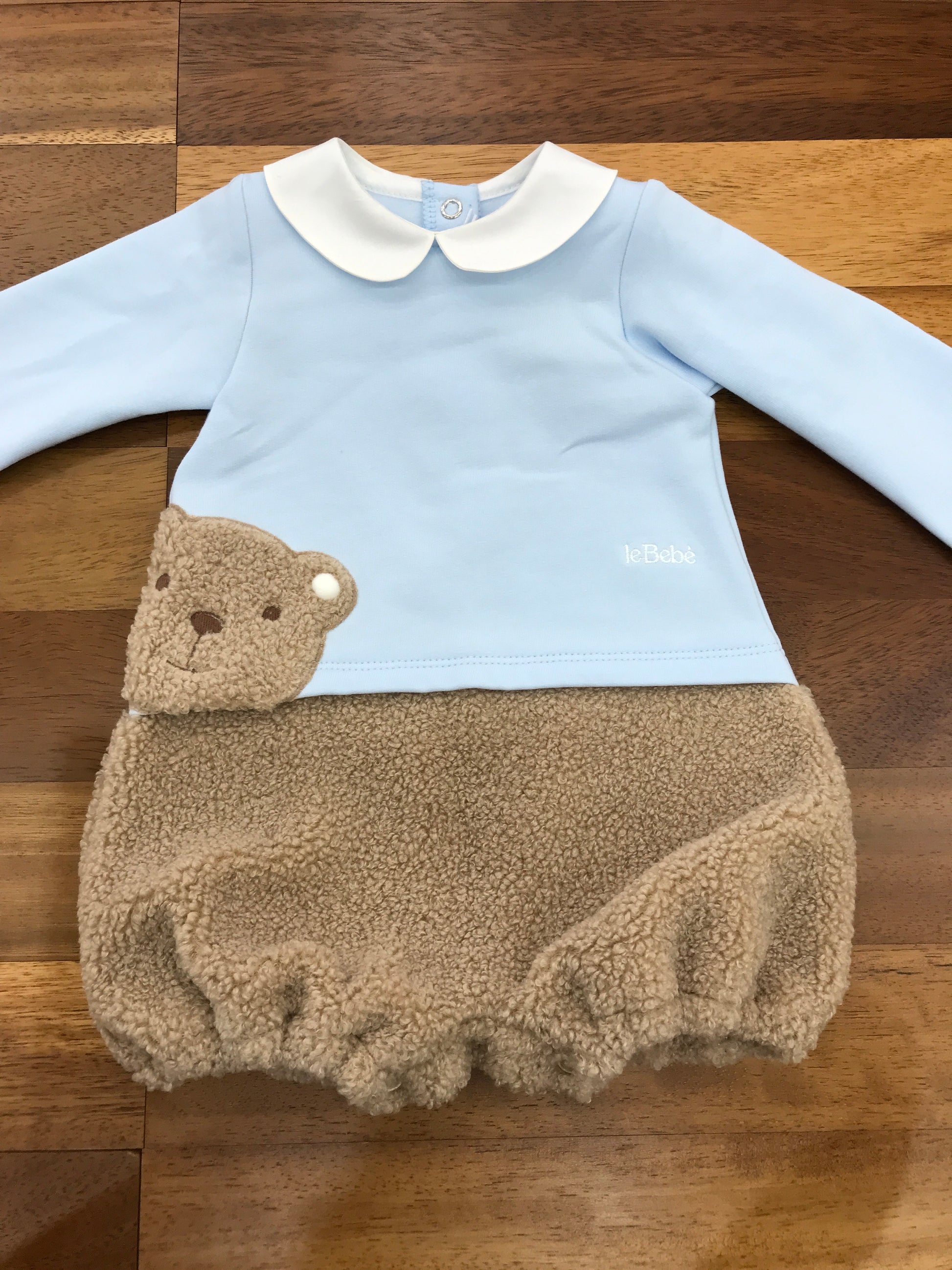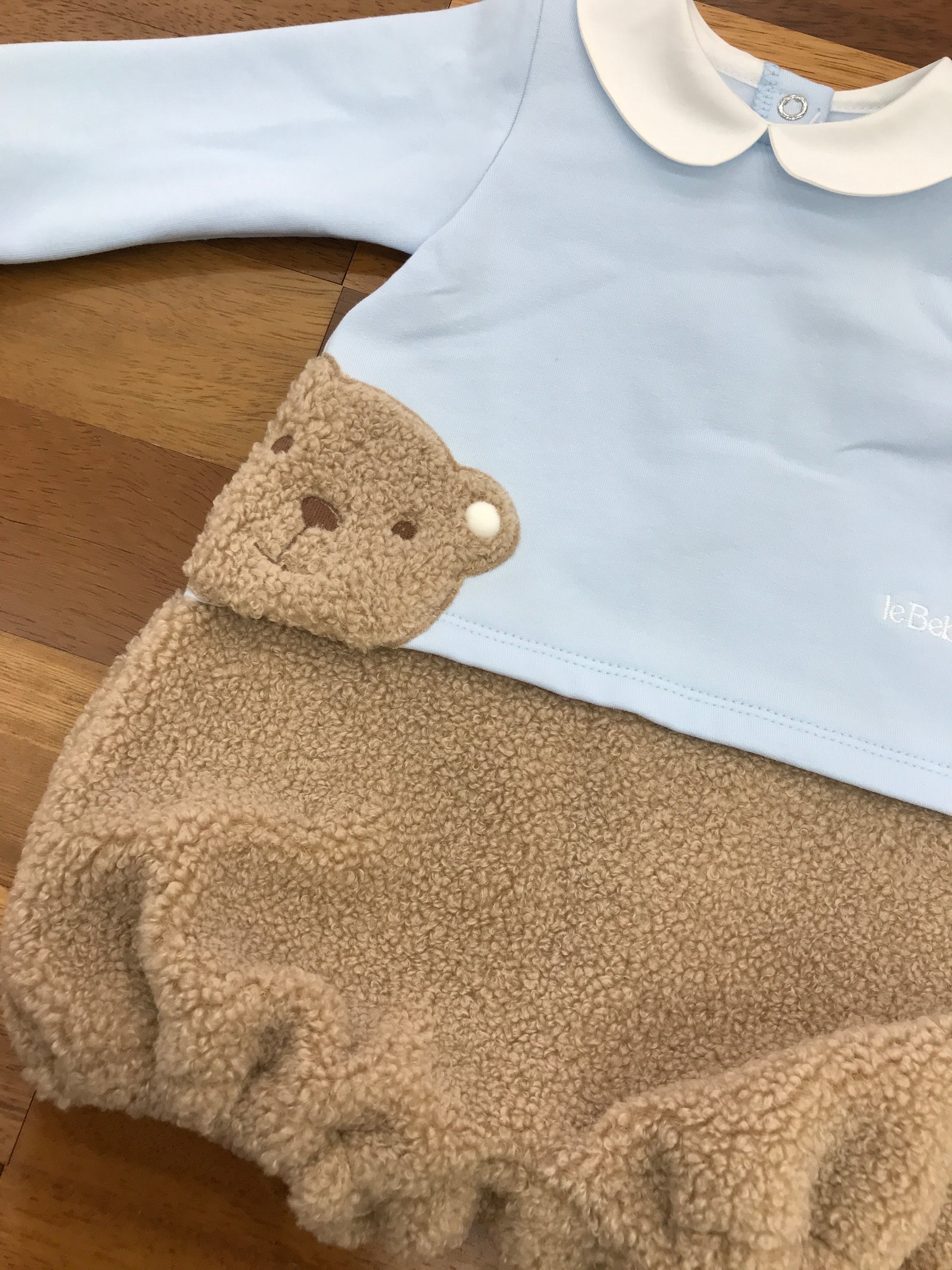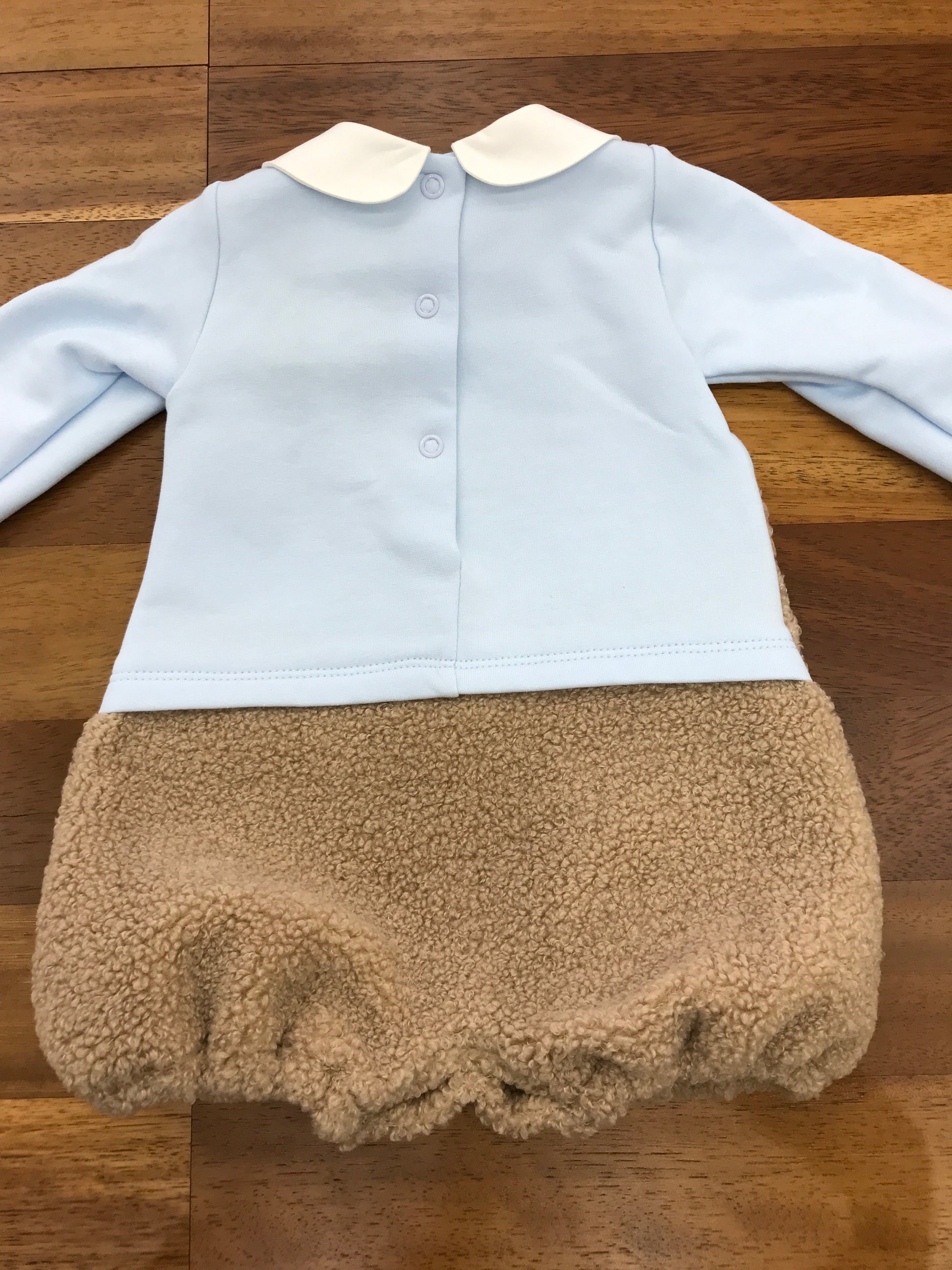 Questo pagliaccetto è confezionato in cotone caldo e confortevole, ideale per mantenere il bambino avvolto in morbidezza. La parte inferiore è rifinita con pelliccia, che si estende anche all’orsetto decorativo applicato, offrendo un dettaglio accogliente e raffinato. Il colletto bianco completa il design con un tocco di eleganza classica, rendendo il capo perfetto per le occasioni speciali o per un comfort quotidiano di alta qualità.