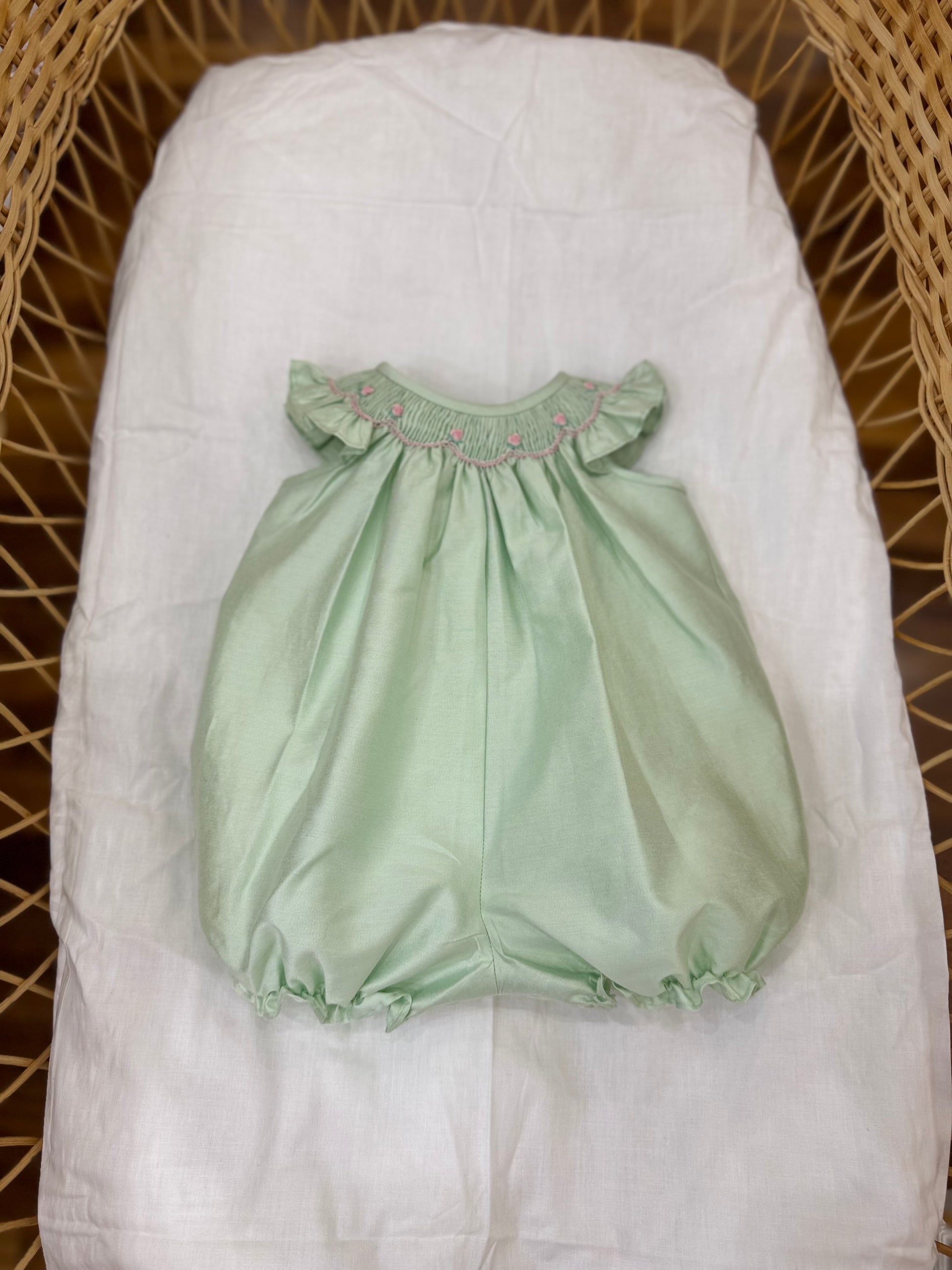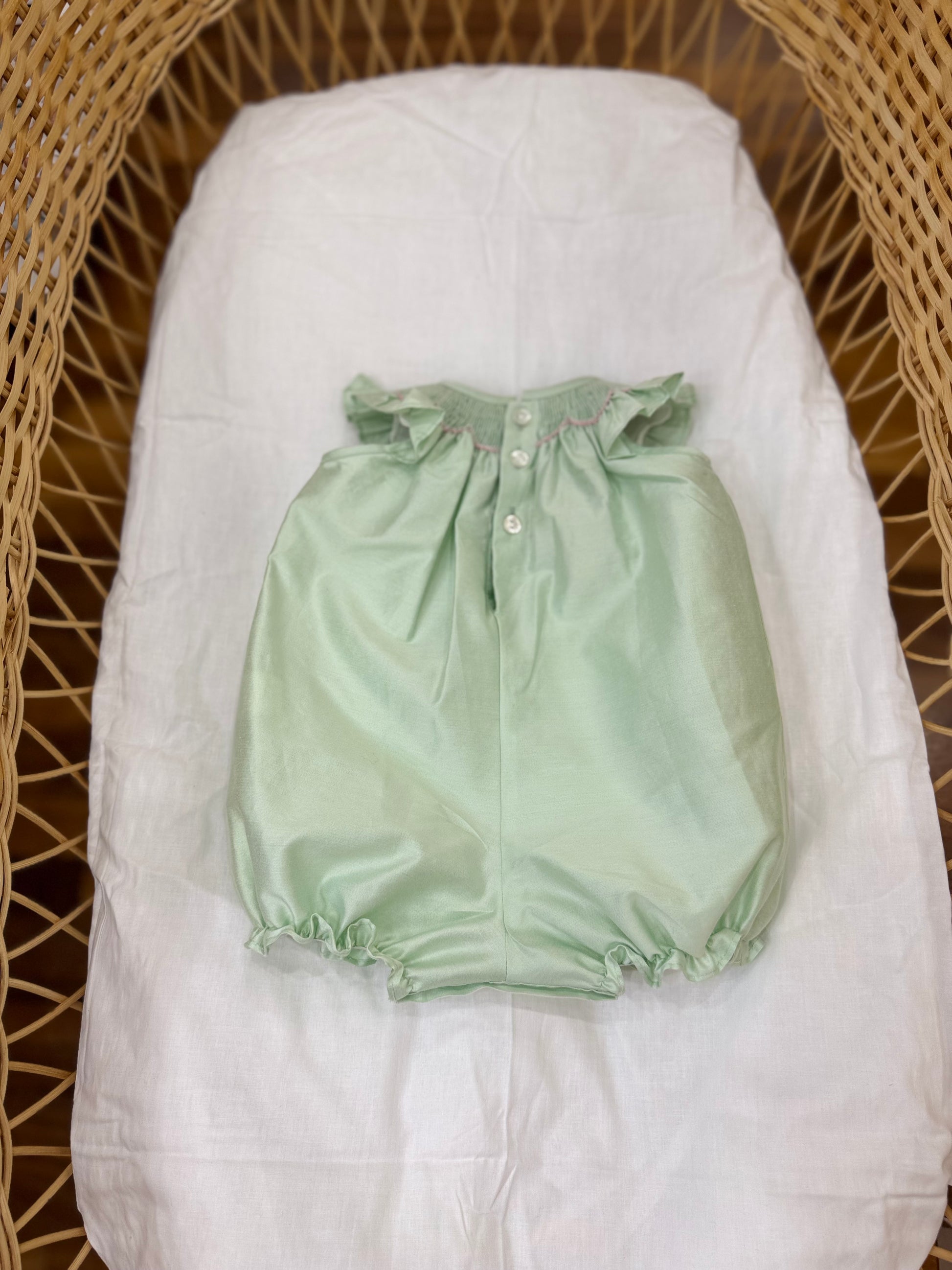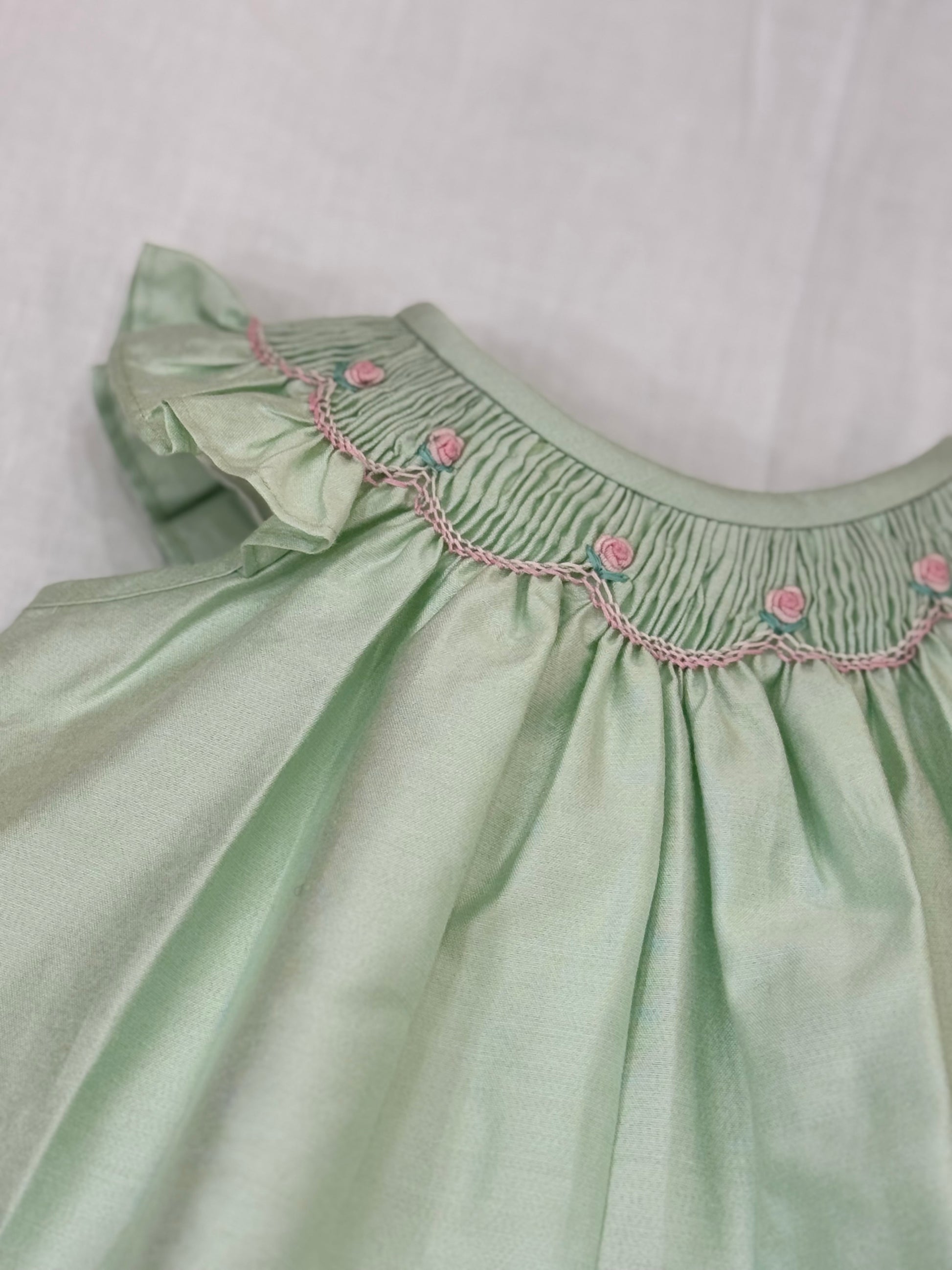 Delizioso pagliaccetto Les enfants de Gisele in cotone verde prato, perfetto per la prima uscita o anche come cambio per un battesimo. Il ricamo a mano di punto a smock e le roselline rosa lo rendono ancora più prezioso . Ideale per un’occasione unica.